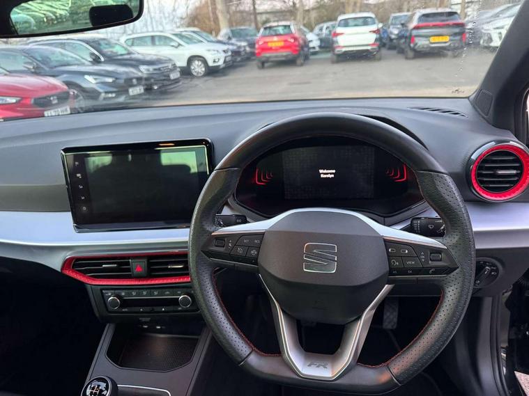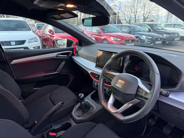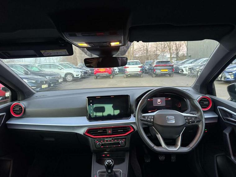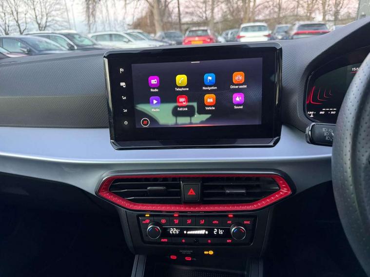 'Lights On' Reminder warning buzzer, 8" Digital cockpit, 9.2" touchscreen navigation system with type C USB socket, Voice control and DAB/AM/FM radio, Auto start and stop system, Bluetooth audio streaming with handsfree system, Digital clock, E-call, Full link smartphone integration with mirror link, wireless apple carplay, Google android auto + USB Type C cable for apple and android devices, Lane assist, Low fuel warning light, Outside temperature gauge, Power Steering, Seat connect with safety, service, remote and online, SEAT drive profiles and ECO function, SEAT logo boot release, Speed limiter, Trip computer, Sports suspension, Auxiliary input socket, Radio/MP3 player, SD card slot, Steering wheel mounted controls, Anti theft roof antenna, Auto dimming rear view mirror, Automatic rain sensing wipers, Black door mirrors, Body colour bumpers, Body colour door handles, Brilliant black window surrounds, Dark tinted rear windows, Electric adjustable/heated/folding door mirrors, Electric front windows, Electric headlight adjustment, Electric rear windows, Front/rear fog lights, FULL LED automatic headlights with dynamic headlight range control, coming and leaving home, LED daytime running lights, LED tail lights, Rear roof spoiler with FR twin exhausts, Rear side wing doors, Rear wiper, Third brake light, 3 seat bench in 2nd row, 60/40 split folding rear seat, Ambient interior lighting, Chrome detailing and black headlining, Cloth upholstery, Dual zone climate control with combination filter, Front courtesy lights, Front cupholders x 2, Front reading lights, Gear shift indicator, Glovebox, Height adjustable front and rear headrests (five), Height adjustable front seats, Height/reach adjust steering wheel, Illuminated air vent surrounds, Illuminated boot, Instrument lighting with brightness control, Isofix, Leather multifunction flat bottomed sports steering wheel, Passenger sunvisor, Single front passenger seat, Sports seats, Sunvisors with mirror and driver side card holder, 3 point seatbelts on all 3 rear seats, ABS, Active front headrests, Child locks on rear doors, Electronic stability control, Energy recovery system, Front assist forward collision warning and autonomous emergency braking, Front driver and passenger side airbags with curtain airbag and front passenger airbag deactivation, Hill hold control, Multi-Collision braking, Seat belt reminder for front and rear seats, Tiredness recognition system, Tyre pressure monitoring system, Electronic engine immobiliser, Locking wheel bolts, Perimeter alarm and interior monitoring with backup horn and tow away protection, Remote central locking + deadlocks, 17" Alloy wheels in Brilliant silver,