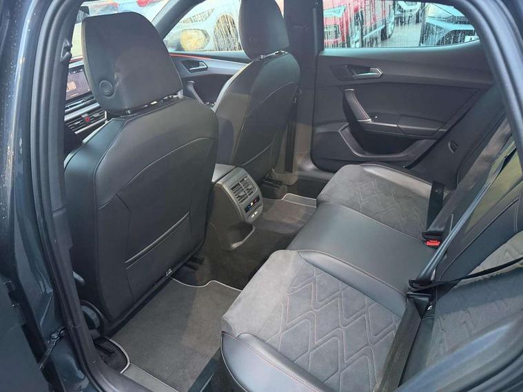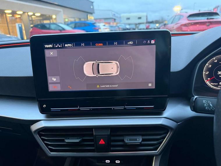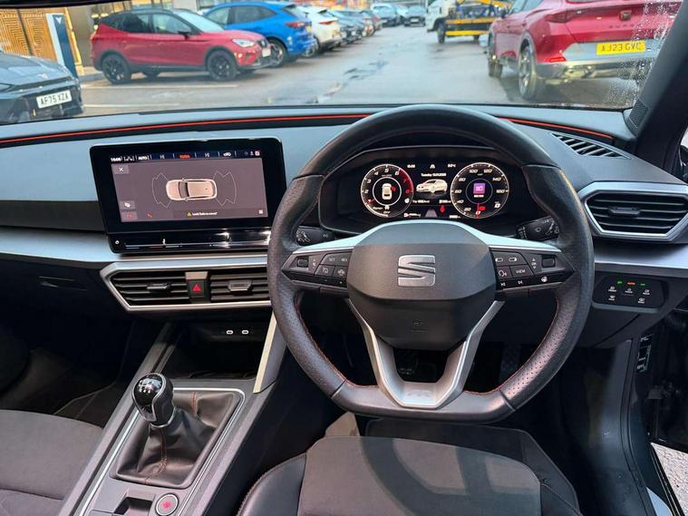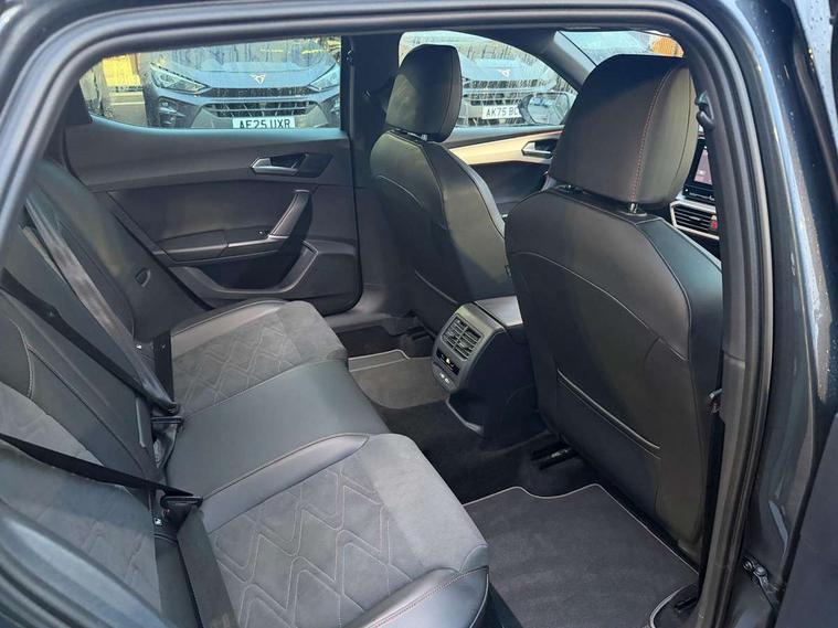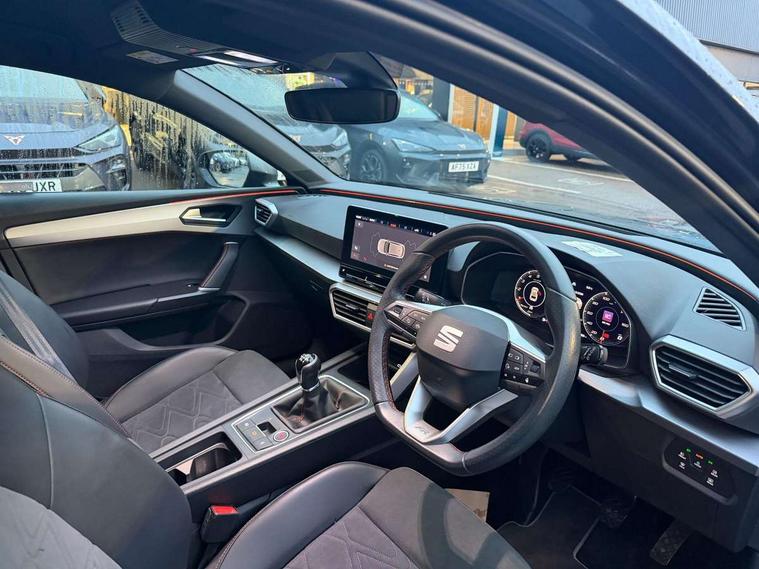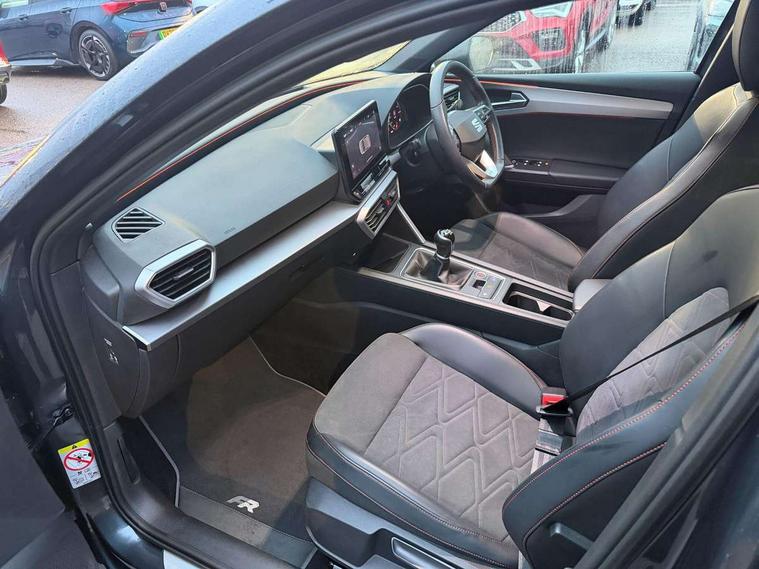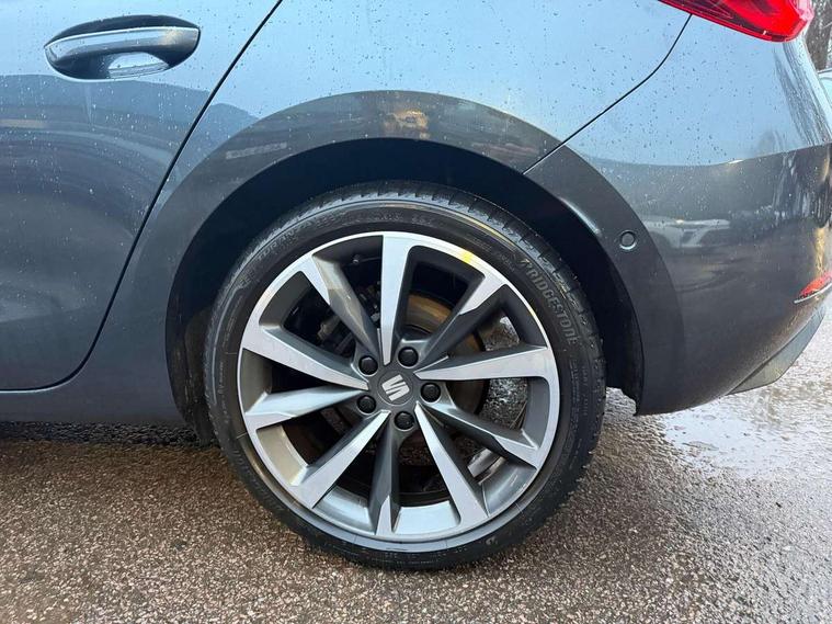 Digital cockpit, E-call, Four x USB Type C ports, Front assist with forward collision warning braking reaction to vehicles, pedestrians and cyclists, Full link smartphone integration with Mirror Link, wireless Apple CarPlay and wired Google Android Auto, Lane assist, Park assist (inc front/rear parking sensors), Power assisted speed sensitive electro-mechanical steering, RPM, trip computer, outside temp gauge, instrument light brightness, low fuel warning light, lights on reminder, gearshift indicator, SEAT drive profile with 4 modes (Eco/Normal/Sport/Individual), throttle response, Service interval indicator, Start/stop system with regenerative braking, Sports suspension, XDS electronic differential lock and dynamic traction support, 7 speakers, Auxiliary input socket, Auto dimming rear view mirror, Body colour door handles, Body coloured bumpers, Dark tinted rear windows, Door mirror LED indicator lights, Electric adjustable/heated/folding door mirrors with memory, Electric front/rear windows, FR sports bumper, Illuminated front door sill, LED front fog lamps with cornering function, LED headlights and tail lights with dynamic turn signals, welcome light silhouette from exterior mirrors and dynamic headlight range control, LED rear fog lamp, Rain sensing wipers, Rear side wing doors, Rear wash/wipe, Separate daytime running light with automatic headlight control and coming home feature, Third brake light, 12v power point in centre console, 3 seat bench in 2nd row, 60/40 split rear bench seat with armrest, Ambient lighting with glovebox, footwell and single monocolour, Black headlining, Dust/pollen filter, Electric driver lumbar support + passenger manual lumbar support, Folding boot cover, Front and rear height adjustable headrests, Front and rear reading lights X 4, Front centre armrest, Front seatback storage pockets, Heated front seats, Heated leather steering wheel with leather gearstick, Height/reach adjust steering wheel, ISOFIX points in outer rear seats with top tether anchorage points, Luggage tie-down hooks, Microsuede cloth upholstery, Power driver seat with memory and manual height adjustable passenger seat, Single front passenger seat, Sunvisors with covered illuminated mirror, Three zone climate control, Tool kit, Wraparound lighting, Media system plus with navigation - Leon, 3 point seatbelts on all rear seats, ABS, Brake control system - ESC and brake booster, Child proof door locks, Driver and front passenger airbags with front passenger airbag de-activation, front side and curtain airbags, Electronic parking brake, Extended safety system - seat belt tensioner, window closure and hazard lights, Hill hold control, Rear disc brakes, Seat belt reminder for front and rear seats, Tiredness recognition system, driver alert system, Tyre pressure monitoring system, Anti theft alarm system with interior monitoring in cab, backup horn and towing protection, KESSY Go (Keyless start), Lockable tailgate, Locking wheel bolts, Wireless phone charging, Chrome interior detailing, 18" Performance machined alloy wheels with 92Y tyres,