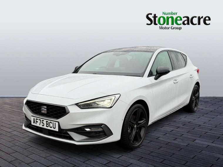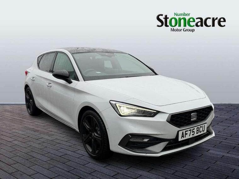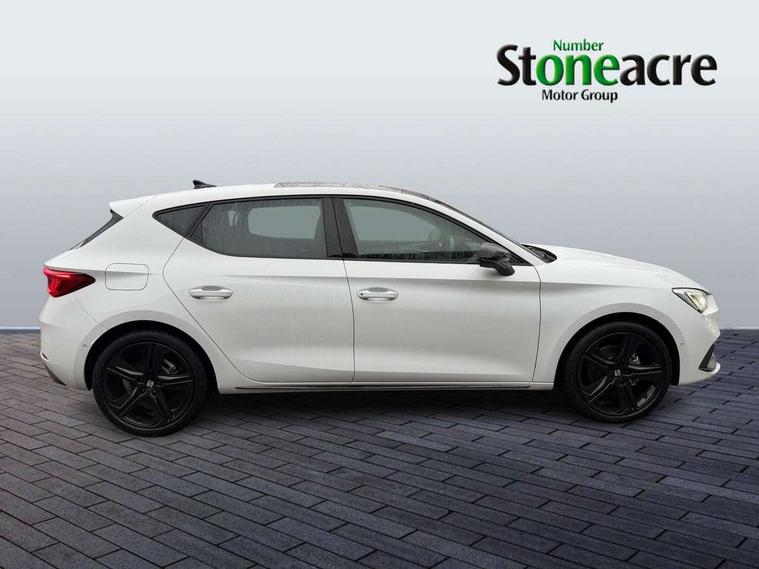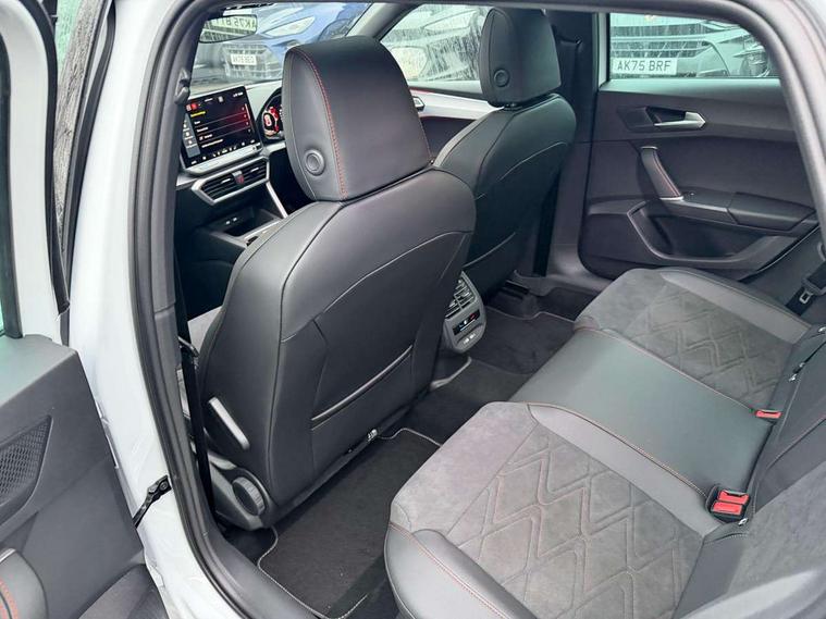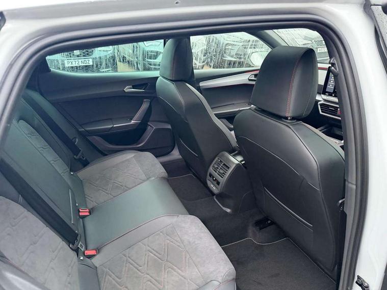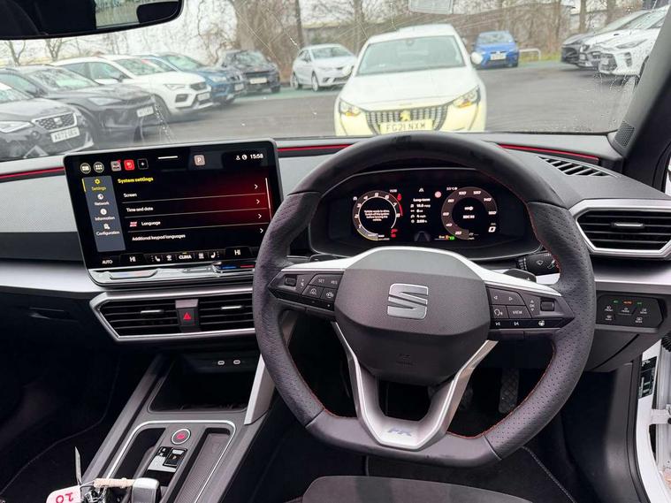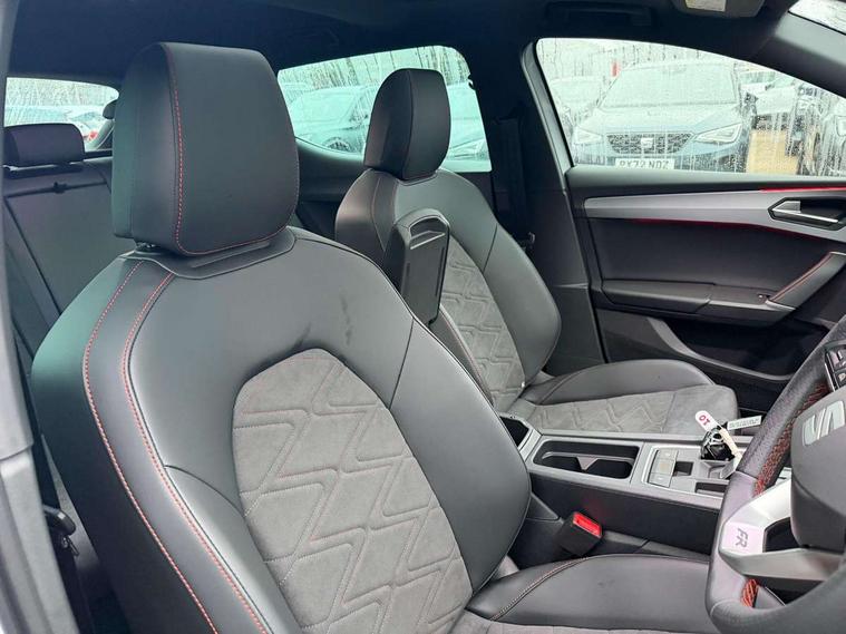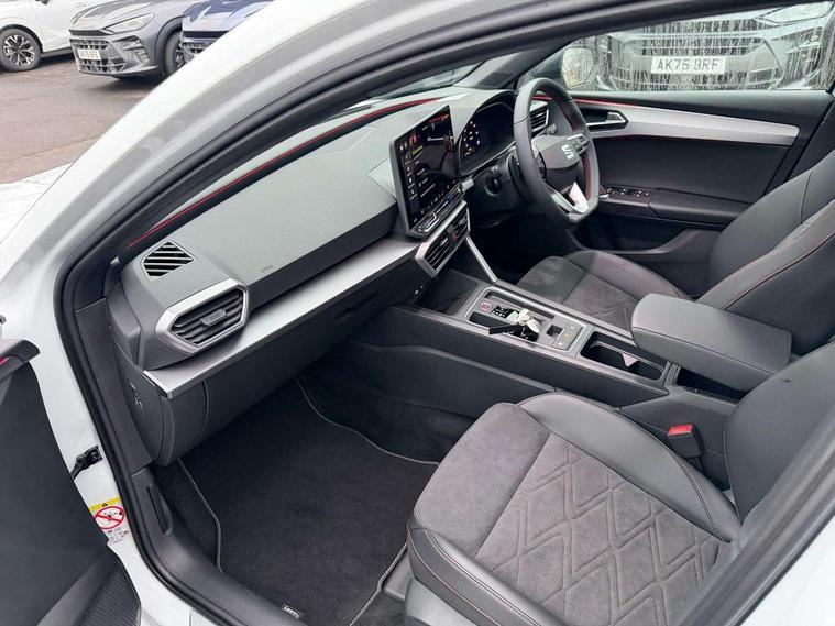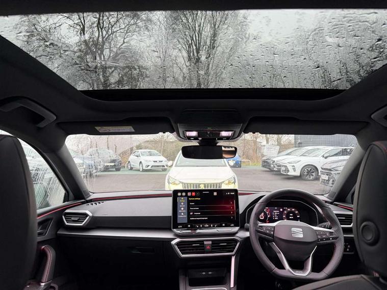 Digital cockpit with multifunction display, Driver attention alert with drowsiness warning, E-call, Front assist with forward collision warning braking reaction to vehicles, pedestrians and cyclists, Full link smartphone integration with Mirror Link, wireless Apple CarPlay and wired Google Android Auto, Intelligent speed assist, Lane assist, Lockable tailgate, Park assist (inc front/rear parking sensors), Power assisted speed sensitive electro-mechanical steering, Rear view camera, RPM, trip computer, outside temp gauge, instrument light brightness, low fuel warning light, lights on reminder, gearshift indicator, SEAT drive profile with 4 modes (Eco/Normal/Sport/Individual), throttle response and gearshift mode, Service interval indicator, Start/stop system with regenerative braking, Sports suspension, XDS electronic differential lock and dynamic traction support, 2 front and 2 rear USB-C ports, Auxiliary input socket, Auto dimming rear view mirror, Black door mirror housings, Black roof spoiler, Black side skirts, Body colour door handles, Body coloured bumpers, Dark tinted rear windows, Door mirror LED indicator lights, Dynamic headlight range control, Electric front/rear windows, Electrically adjustable, heated and folding door mirrors, FR sports bumper, Illuminated front door sill, LED front fog lamps, LED rear fog lamp with rear coast to coast light, Matrix LED headlights and beams with variable light distribution, LED rear light and dynamic turn signals, Panoramic sunroof, Rear side wing doors, Rear wash/wipe, Separate daytime running light with automatic headlight control and coming home feature, Third brake light, Welcome light silhouette from exterior mirrors, Windshield wiper intermittent control with light/rain sensor, 12v power point in centre console, 3 seat bench in 2nd row, 60/40 split rear bench seat with armrest, Ambient lighting with glovebox, footwell and single monocolour, Black headlining, Dust/pollen filter, Folding boot cover, Front and rear height adjustable headrests, Front and rear reading lights X 4, Front centre armrest, Front seatback storage pockets, Heated front seats, Height/reach adjust steering wheel, Interior wraparound lighting (FR), ISOFIX points in outer rear seats with top tether anchorage points, Luggage tie-down hooks, Lumbar adjustment for front seats, Manual driver seat with memory and height adjustable passenger seat, Microsuede cloth upholstery, Single front passenger seat, Sunvisors with covered illuminated mirror, Three zone climate control, Media system plus with navigation - Leon, 3 point seatbelts on all rear seats, ABS, Brake control system - ESC and brake booster, Child proof door locks, Driver and front passenger airbags with front passenger airbag de-activation, front side and curtain airbags, Electronic parking brake, Extended safety system - seat belt tensioner, window closure and hazard lights, Hill hold control, Rear disc brakes, Seat belt reminder for front and rear seats, Tyre pressure monitoring system, Anti theft alarm system with interior monitoring in cab, backup horn and towing protection, KESSY Advanced - Keyless start, keyless entry, Locking wheel bolts, Wireless phone charging, Chrome interior detailing, 18" Black alloy wheels, Tool kit without jack,