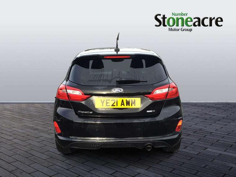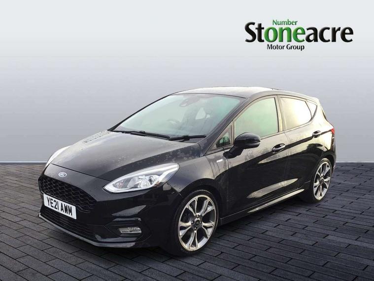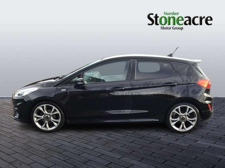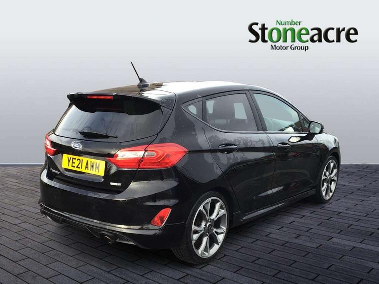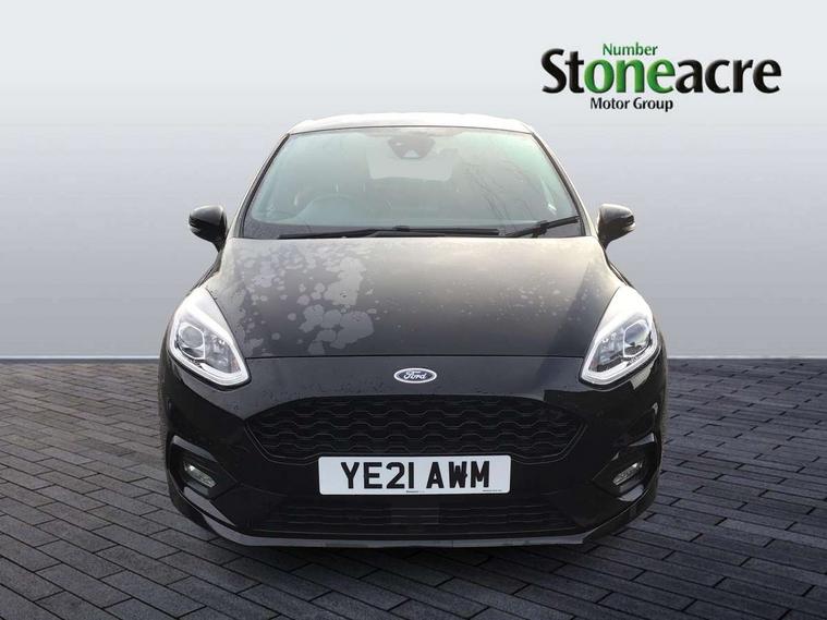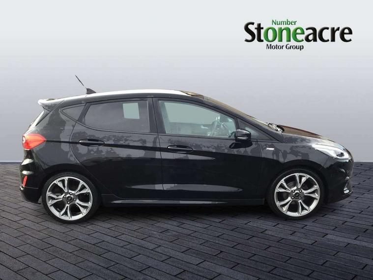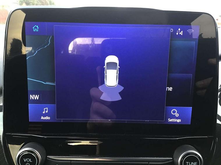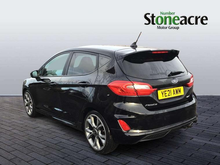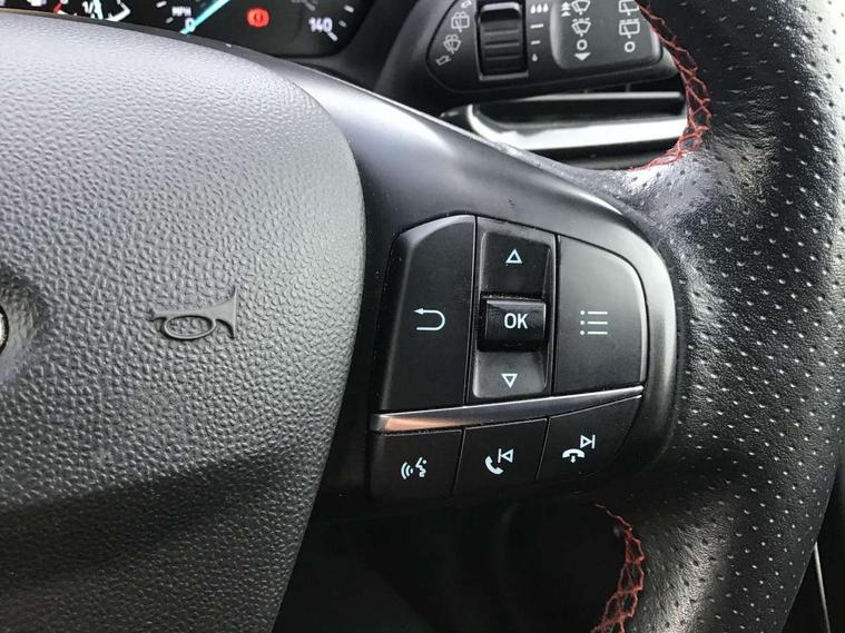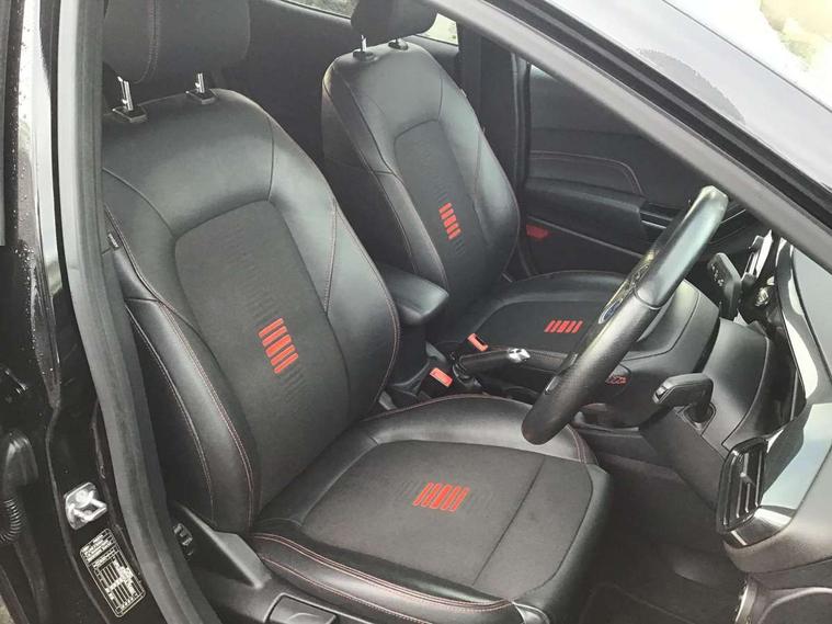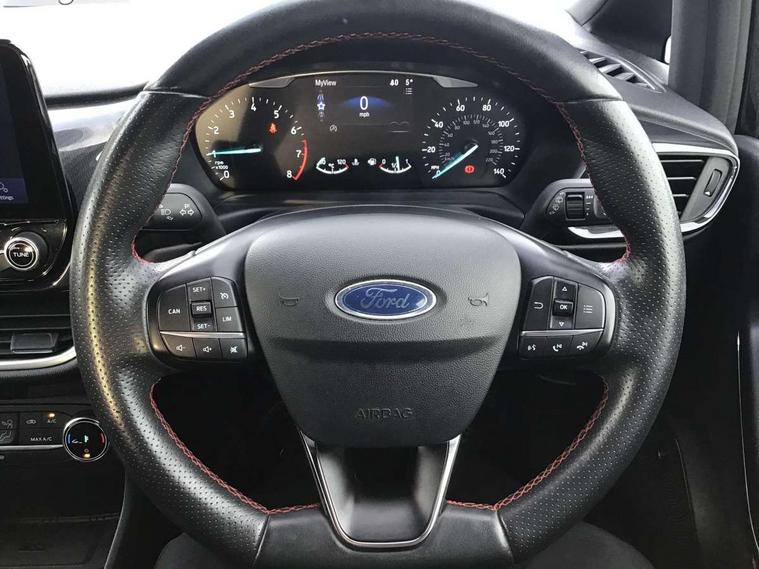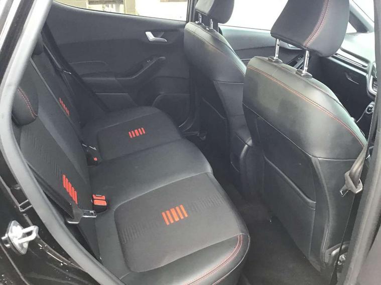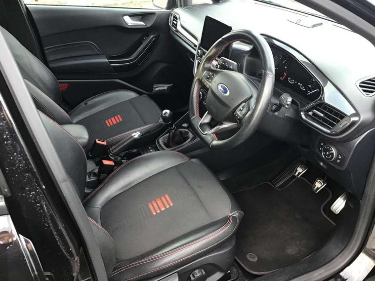 4.2" TFT instrument cluster screen, Bluetooth system, Electric power steering, Ford easy fuel, Rear parking distance sensors, Selectable drive modes (Normal, Sport, Track), Traffic sign recognition, Trip computer, Sports suspension, 2 USB ports, Auxiliary input socket, B&O Premium audio system with 8" touchscreen, 10 speakers, 360 degree sound system, Ford SYNC 3 navigation system and Ford pass connect, DAB Digital radio, Steering wheel mounted controls, Auto high beam, Body colour bumpers, Body colour door handles, Body colour large rear spoiler, Body coloured electrically operated and heated door mirrors with side indicators, Cornering front fog lights, Electric front windows/one touch facility, Electric rear windows, LED Night signature to rear lights, Power foldable door mirrors with puddle lights, Quickclear heated windscreen, Rain sensing wipers and auto dimming rear view mirror, Rear privacy glass, Rear wiper, Unique ST-Line upper grille & full bodystyling kit with ST-Line wing badges, 3 spoke flat bottomed leather steering wheel, 60/40 split folding rear seat, Adjustable head restraints, Black headlining, Boot carpet, Centre console with opening armrest, 2x cupholders, 12v and USB, Chrome inner door handles, Drivers and Passenger lumbar support, EATC - Electronic Auto Temperature control, Footwell illumination, Front floor mats in velour, Front map reading lights, Front seat and rear pockets, Height adjustable passenger seat, Illuminated glovebox, Leather gaiter, LED ambient lighting, Load area light, Manual 4-way driver seat adjust, Overhead console with sunglasses holder, Pollen filter, Rake/reach adjustable steering wheel, Sensico wrapped steering wheel, Sports front seats, NCAP Pack - Fiesta, ST-Line X Trim Pack - Fiesta, 3 point seatbelts on all rear seats, ABS+EBA, Curtain airbags, Driver and passenger airbags, Drivers knee airbag, Electronic stability control with hill start assist, Front passenger airbag deactivation, Front side airbags, Seatbelt warning, Two tone horn, Tyre pressure monitoring system, Ford keyfree system with Keyless entry and keyless start, MyKey system, Remote central locking & engine immobiliser, Thatcham Cat.1 alarm, 18" 5 spoke alloy wheels with rock metallic machined finish,