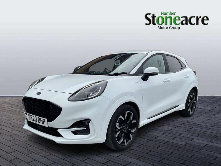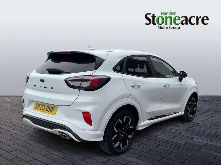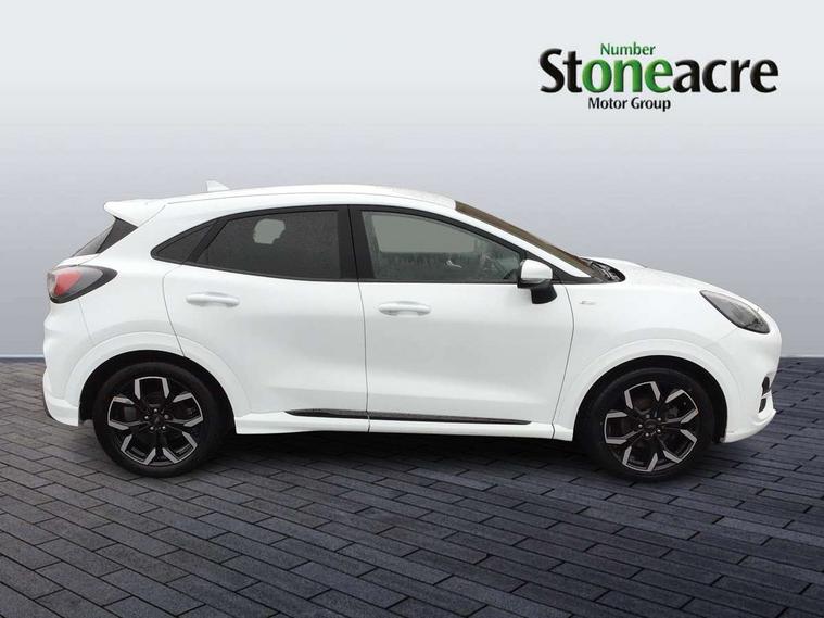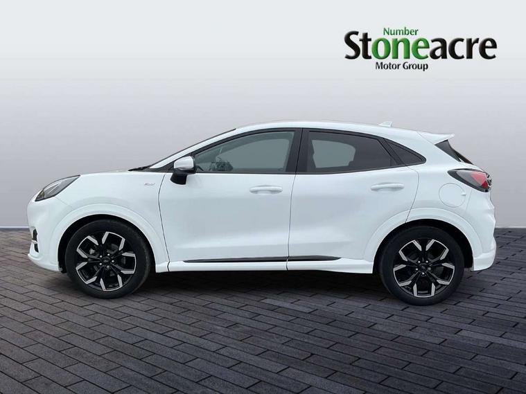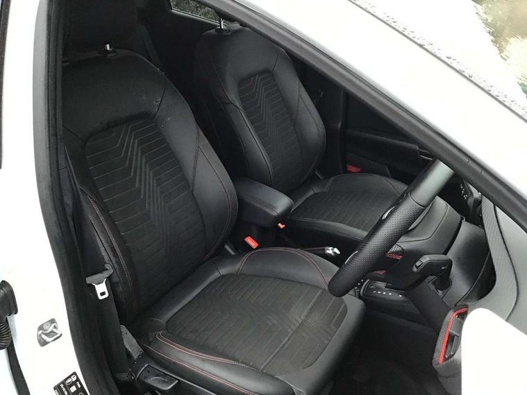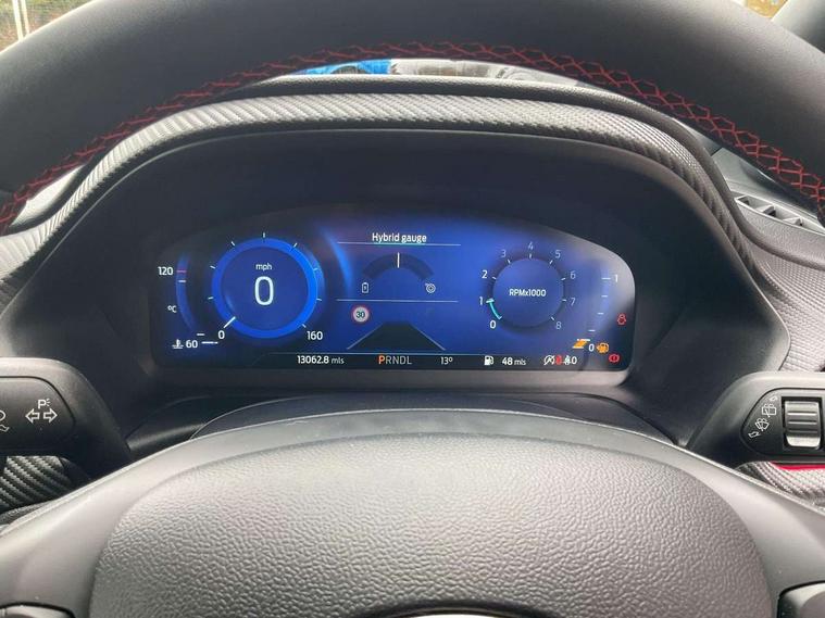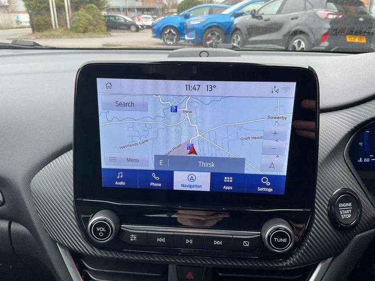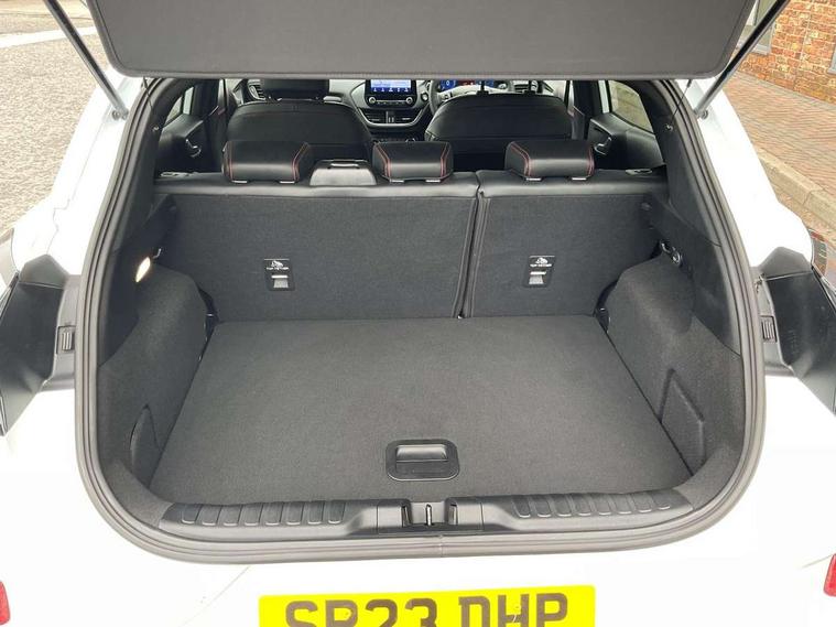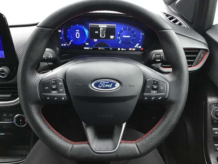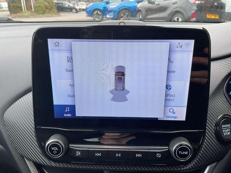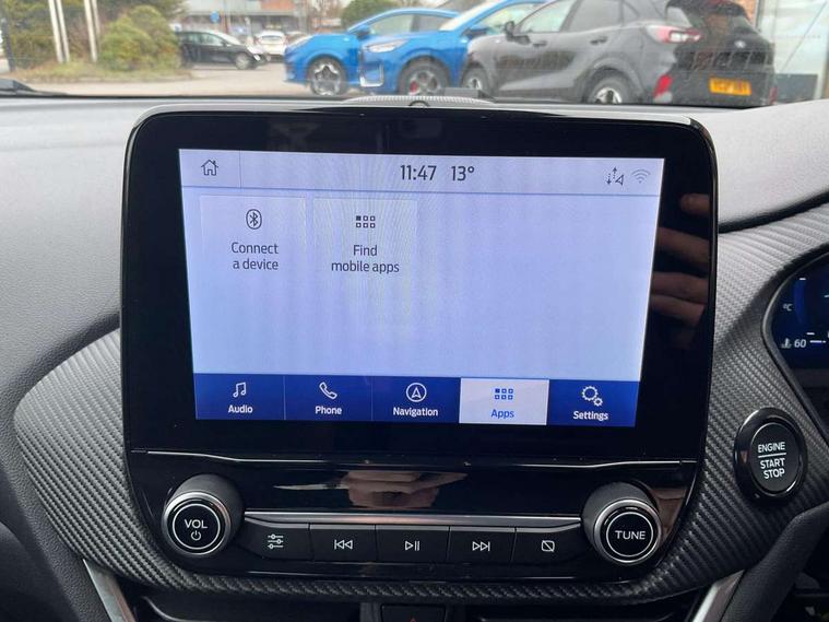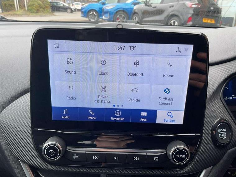 Driver impairment monitor, Emergency call service, Ford easy fuel, Full digital 12.3" instrument cluster, Lane keeping aid with lane departure warning, Power assist steering, Power start button, Rear parking sensor, Selectable drive modes(Normal, sport, Eco, trail, slippery), Speed sign recognition, Sport suspension, Automatic headlights with auto high beam, Automatic rain sensing wipers, Front fog lamps, LED daytime running lights, LED rear lamps, Power foldable heated door mirrors with puddle lamps, Privacy glass to side rear windows and tailgate glass, Quickclear heated windscreen, Rear side wing doors, Rear wiper, ST-Line body styling kit with unique grille and large body colour rear spoiler, Third brake light, 3 seat bench in 2nd row, Centre console with armrest and stowage, Ford megabox extended bootspace, Front and rear head restraints, Front floor mats, Manual 4 way driver seat adjust with lumbar adjustment, Manual 4 way passenger seat with lumbar seat adjustment, Sensico partial premium upholstery, Single front passenger seat, ST-Line flat bottomed sensico leather steering wheel with leather handbrake and aluminium gear knob, Wireless charging pad with electronic air temperature control (EATC), B&O Premium Audio system + Ford SYNC 3 navigation pack - Puma, 3 rear seatbelts, Child safety lock, Electronic stability control (ESC) and hill start assist, Pedestrian/cyclist detection & post-collision braking, Pre collision assist system, Tyre pressure monitoring system (TPMS), Thatcham alarm, Carbon look interior deco spears,