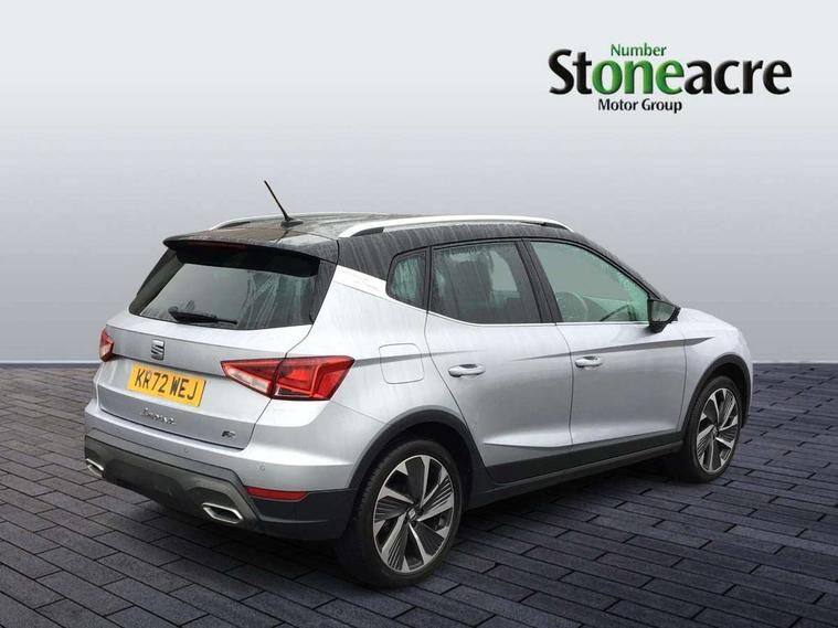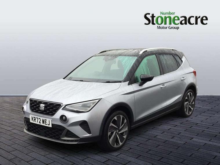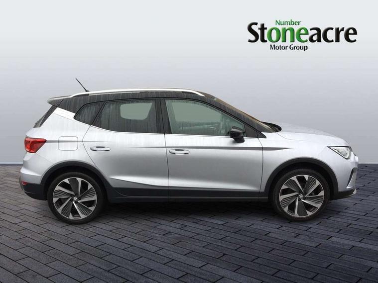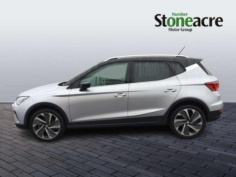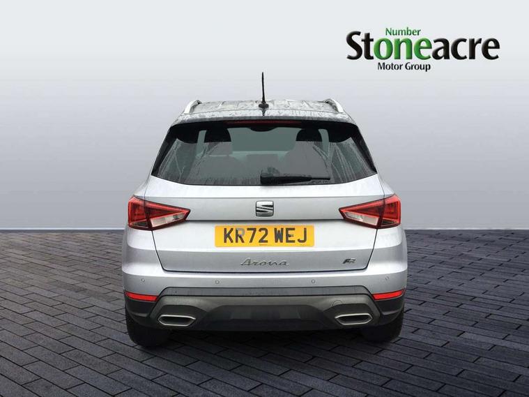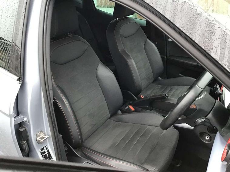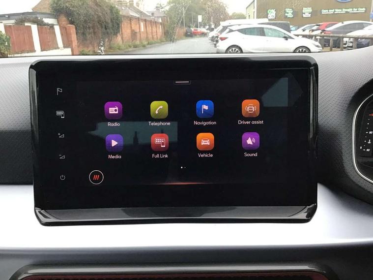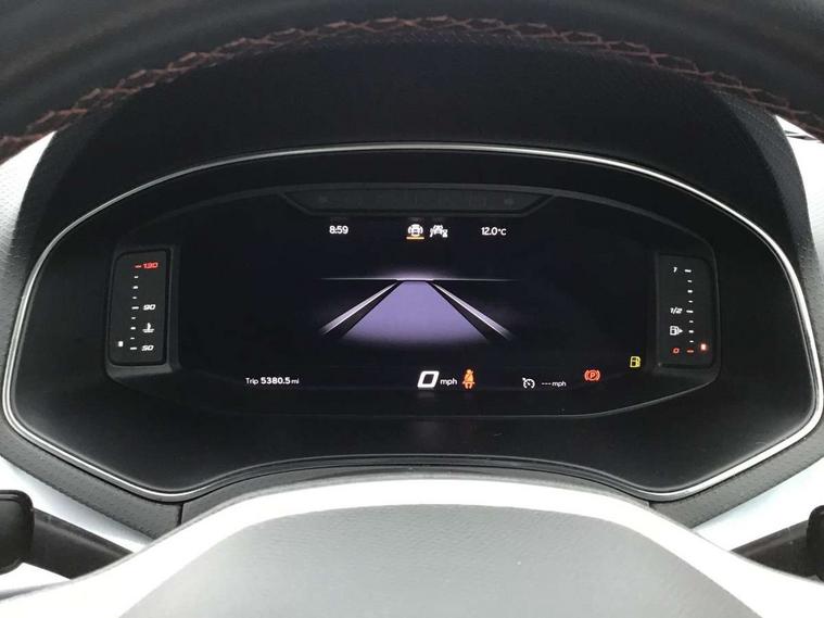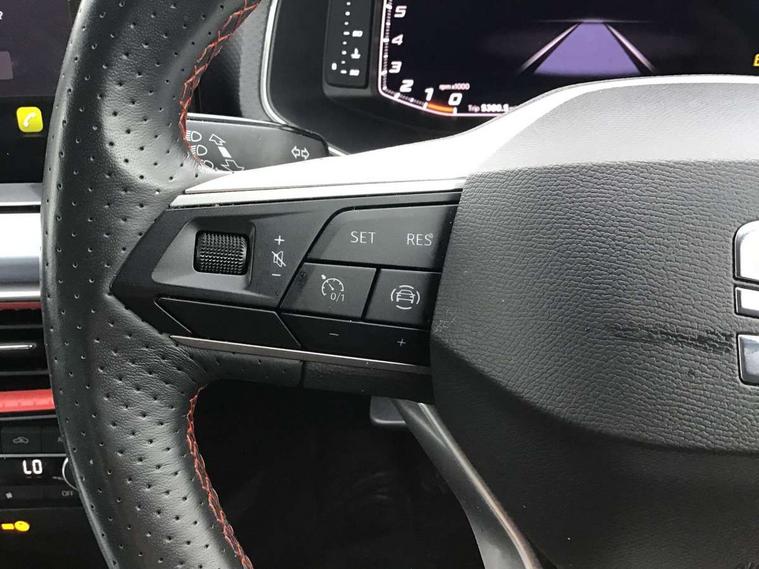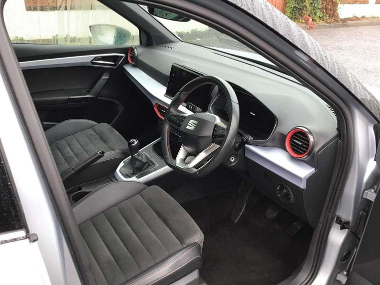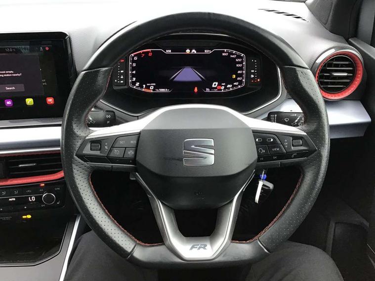 'Lights On' Reminder warning buzzer, 10" Digital cockpit, Digital clock, E-call, Electric speed sensitive power steering, Full Link Smartphone Integration with Mirror Link, Apple Car Play, Google Android Auto with USB Type C cable for Apple and Android compatibility, Low fuel warning light, Outside temperature display, Rear parking sensor, RPM counter, Seat connect with safety, service, remote and online, SEAT Drive profile - Four different models normal-sport-eco-individual, steering response, throttle response, Trip computer, Wireless phone charger, 9.2" colour touchscreen with navigation system, voice control and USB port (type c), Bluetooth interface for hands free and audio streaming, DAB digital radio and AM/FM radio, Steering wheel mounted audio controls, Anti theft roof antenna, Auto dimming interior rear view mirror, Automatic activation of hazard warning lights, Body coloured bumpers, Body coloured door handle inserts, Chrome roof rails and window surrounds, Dark tinted rear windows, Electric front/rear windows, Electrically adjustable, heated and folding door mirrors, Front fog lights with cornering function and rear fog light, FULL LED automatic headlights with dynamic headlight range control, coming and leaving home, LED daytime running lights, LED rear tail lights and licence plate lights, Protective side mouldings, Rain sensing wipers, Rear side wing doors, Rear spoiler, Rear window wash/wipe, Roof colour door mirrors, Third brake light, Twin exhaust pipe styling hidden exhaust pipe, Visible VIN plate, Windshield wiper with intermittent control and potentiometer, 2 cupholders, 3 seat bench in 2nd row, 60/40 split folding rear seat, Aircare filter, Black interior roof, Double boot floor, Driver sunvisor with covered mirror + card holder, Dual zone climate control, Front comfort seats, Front courtesy light with front and rear reading lights, Front seat back storage pockets, Gear shift indicator, Heated front seats, Height adjustable front seats, Height/reach adjustable steering column, Illuminated boot, Instrument lighting with brightness control, Interior ambient lighting, Interior light in footwell, central console and door panel, ISOFIX points in outer rear seats with top tether anchorage points, Microsuede cloth upholstery, Passenger sunvisor with vanity mirror, Perforated flat bottomed leather steering wheel/gear knob/handbrake with red stitching and FR logo, Single front passenger seat, Two front and three rear height adjustable headrests, Interior chrome pack - Arona, 3 point seatbelts on all rear seats, ABS, Active front headrests, Child locks on rear doors, Driver and front passenger airbags with front passenger airbag de activation, front side and curtain airbags, Electronic stability control, Emergency Brake Assist (EBA) and front assist, Front and rear seatbelt reminder, Hill hold control, Multi-Collision braking, Tiredness recognition system, Traction control, Tyre pressure monitoring system, Alarm with back-up horn, Electronic engine immobiliser, Locking wheel bolts, Remote central locking + deadlocks, Tow away protection, Titan black dashboard, 18" Performance Cosmo grey matt alloy wheels,