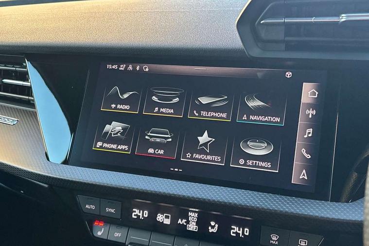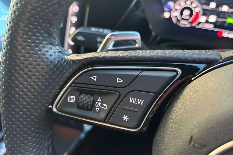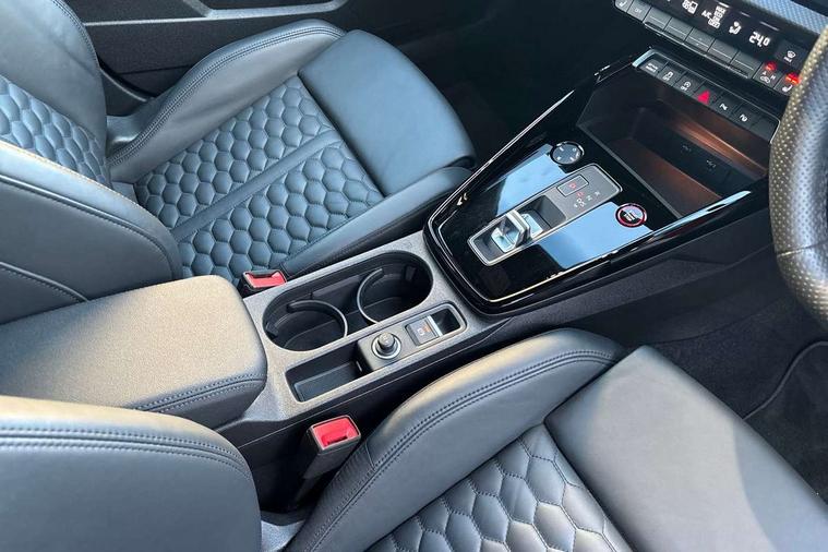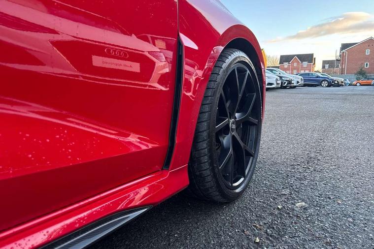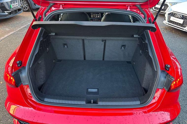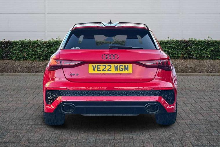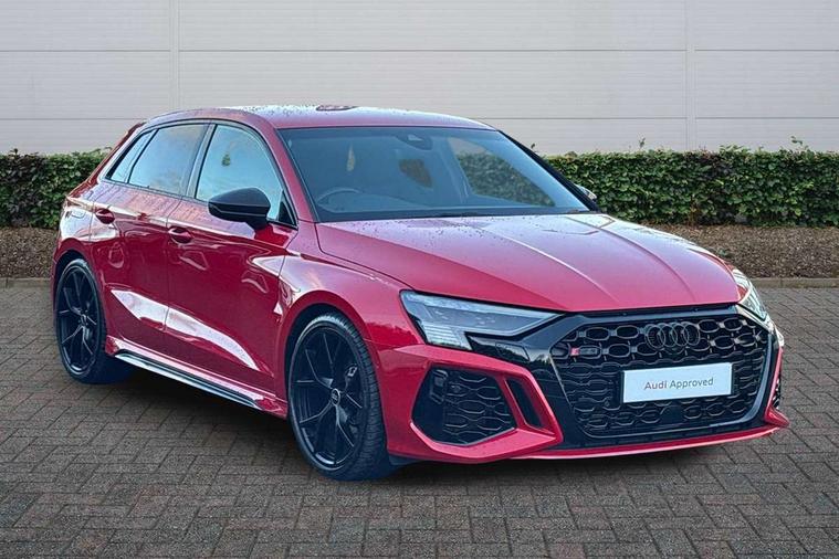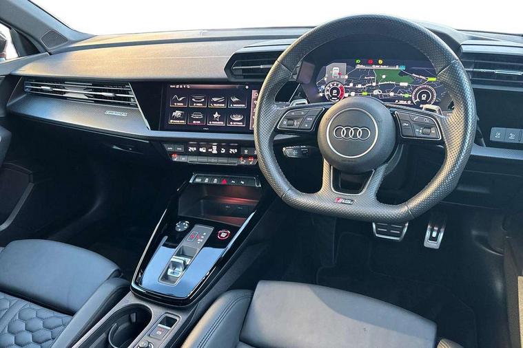 Audi smartphone interface, Audi virtual cockpit with RS specific display 12.3" full colour digital instrument cluster, Automatic start/stop system with recuperation, Bluetooth interface, Collision avoidance assistant, Emergency e-call, Lane departure warning system, Legal emergency call, Manual boot opening, Parking assist with parking system plus, Progressive power assisted steering, Quattro permanent four wheel drive, Rear suspension, DAB Digital radio, 3rd brake light, Acoustic glass windscreen, Audi beam uses LEDs to project the Audi sport logo onto the ground as you exit your RS 3, Audi matrix LED headlights, LED rear lights, dynamic front and rear indicators and headlight cleaning system, Auto dimming rear view mirror, Body colour roof, Carbon exterior door mirror, Carbon fibre engine cover, Carbon roof spoiler, Daytime running lights, Door mirrors - electrically adjustable, heated, folding and auto dimming on both sides, Headlight washers, Light and rain sensors, Privacy glass - dark tinted rear and rear side windows from B-pillar backwards, Rear side wing doors, Rear window wiper and washer system, RS exterior features in gloss black, RS sports exhaust system, Side skirt in carbon inlay, 3 seat bench in 2nd row, 40/20/40 split folding rear seat bench, Black cloth headlining, Dual zone electronic climate control, Front and rear headrests, Front centre armrest, Front sports seats RS embossed logo, Front/rear floor mats, Heated front seats, Honeycomb stitching and RS embossing, Illuminated door sill trims inlays in aluminium with RS 3 logo, Illuminated vanity mirror, Manually adjustable front seats, RS emblems, Single front passenger seat, Stainless steel pedals and front footrest in black, Tool kit, Aluminium interior elements pack - RS3, Ambient lighting pack - RS3, MMI navigation plus with MMI touch - RS3, RS bodystyling - RS3, Storage Pack - RS3, 3x3 point rear seat belts, ABS/EBD, ASR, Audi pre sense front, Driver/Front Passenger airbags, EDL, ESC - Electronic Stability Control + traction control, Front passenger airbag deactivation, Front side airbags with head airbags and interaction airbag, Hill hold assist, Seat belt reminder with passenger presence detection in rear, Tyre pressure loss indicator, Warning triangle and first aid kit, Anti theft alarm, Anti-theft wheel bolts, Electronically operated child lock, Remote control central locking, Carbon inlays, accent surfaces in the dashboard and centre console in platinum grey silk effect paint finish, Full decorative carbon trim, 19" 5 Y spoke matt black alloy wheels, Tyre repair kit,