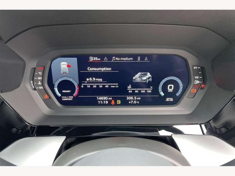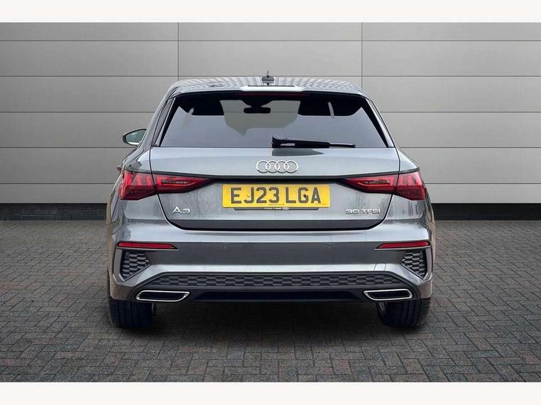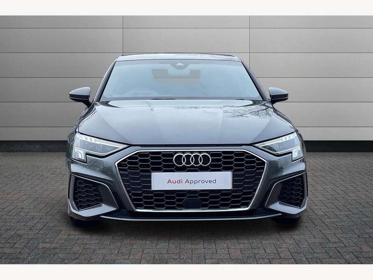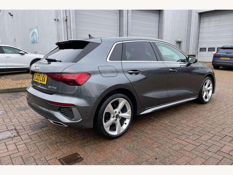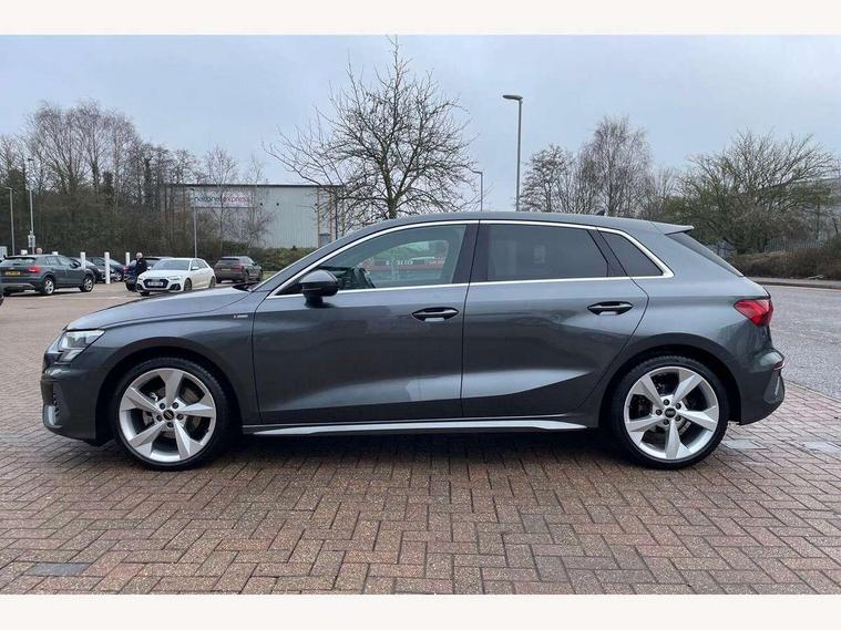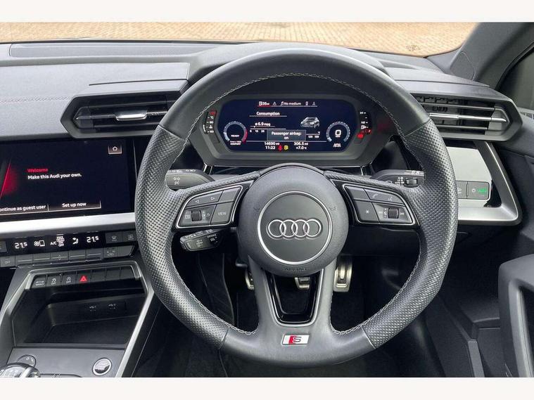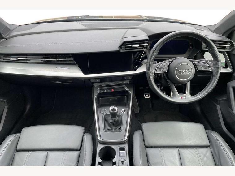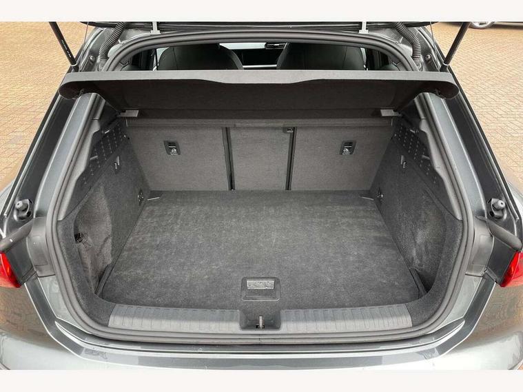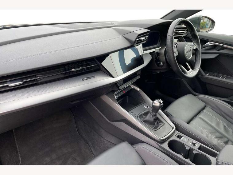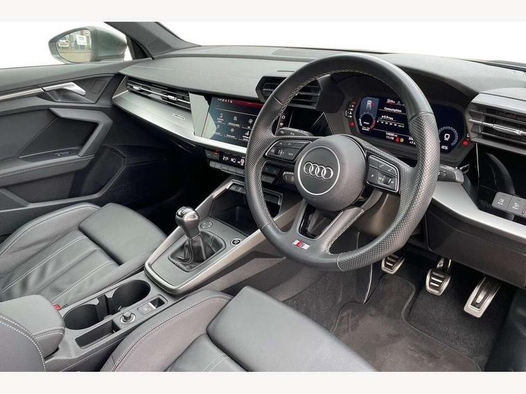 Audi drive select (Auto, Comfort, Dynamic and Individual), Audi smartphone interface, Audi Virtual Cockpit - 10.25" digital and colour instrument cluster, Automatic start/stop system with recuperation, Bluetooth interface, Camera based traffic sign recognition, Collision avoidance assistant, Cruise control, e-Call (emergency call), Electromechanical power speed sensitive steering, Lane departure warning system, MMI Navigation Plus with high resolution 10.1" colour touch screen display, Rear parking sensors, Service indicator, Trip computer, Voice control system with natural language interaction, Sports suspension, 2xUSB-C connection with data and charging functions, 6 passive loudspeakers, DAB Digital radio, 3rd brake light, Acoustic glass windscreen, Aluminium window trim, Auto dimming frameless rear view mirror, Body colour exterior mirrors, Electrically adjustable/heated/folding/auto dimming door mirrors with integrated LED indications + kerb view function for passenger side, Front electric windows, Illuminated aluminium inserts front door sills with S logo, LED daytime running lights, LED headlights with LED rear lights and dynamic rear indicators, Light and rain sensors, Privacy glass - dark tinted rear window, rear door and side windows, Rear electric windows, Rear side air outlets in grained matt black, Rear side wing doors, Rear wiper, S line bumpers, S roof spoiler, 12V socket and storage compartment in front centre console, 3 seat bench in 2nd row, 3 spoke leather multifunction steering wheel, 4 way electrically adjustable lumbar support for driver and front passenger, 60/40 split folding rear seat bench, Black cloth headlining, Dual zone electronic climate control, Front and rear centre armrest in leather, Front and rear headrests, Front/rear floor mats, Height and reach adjustable steering wheel, Interior lighting - glove compartment light and right hand side, Luggage compartment floor covering, Manual boot compartment lid, Manually adjustable front seats, Seat side bolsters, Single front passenger seat, Stainless steel pedals and front footrest in black, Twin leather upholstery with front sports seats S embossed logo, Aluminium interior elements pack - A3 Sportback, LED interior lighting pack - A3 Sportback, S line styling pack - A3 Sportback, 3x3 point rear seat belts, Driver and front passenger airbag with passenger airbag deactivation, Electronic Stabilisation Control (ESC) including ABS, ASR and EDL, First aid kit with warning triangle and 2 safety vests, Front side airbags with head airbags and interaction airbag, Pre-sense front with pedestrian and cyclist detection, Seatbelt monitoring, Tyre pressure loss indicator, Anti theft alarm, Anti-theft wheel bolts, Electronically operated child lock, Immobiliser, Remote control central locking, Dark spectrum aluminium inlays, accent surfaces in the dashboard and centre console in platinum grey silk effect paint finish,