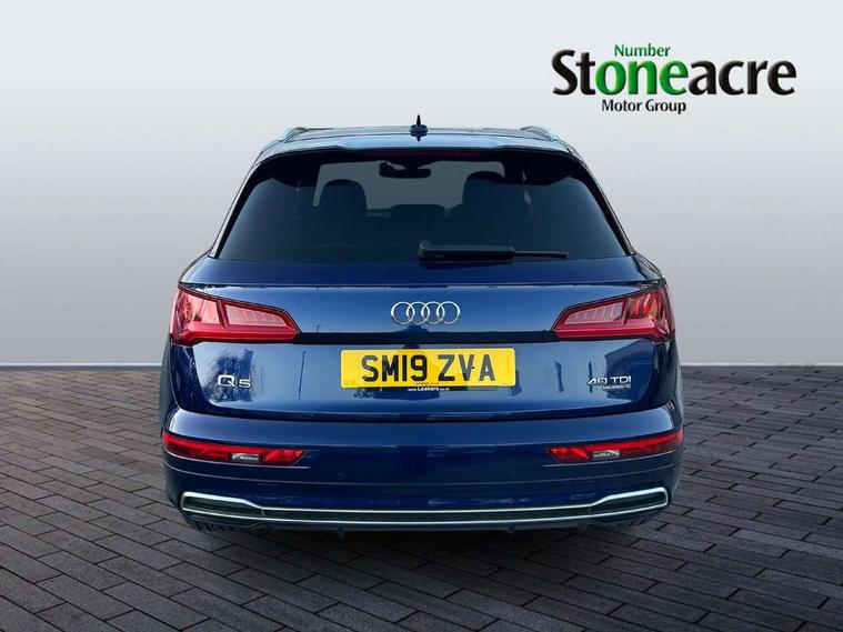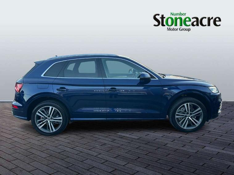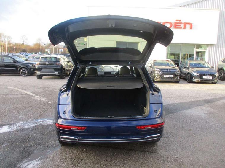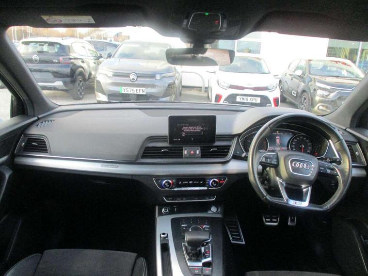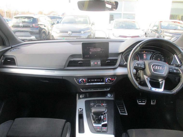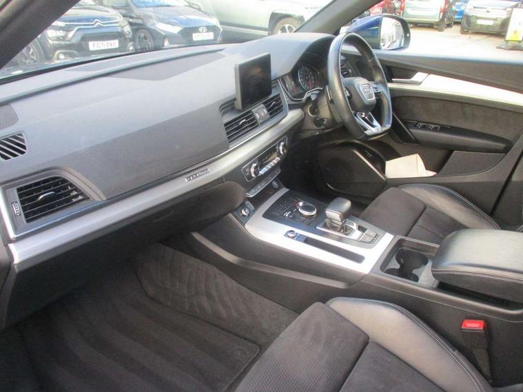 7" Colour driver information system, Audi drive select, Audi parking system plus with front and rear sensors, Audi smartphone interface, Electro - mechanical power assisted steering, MMI Navigation, Mobile telephone preparation - bluetooth interface, Power tailgate, Service interval indicator, Voice control system, Diesel particulate filter, 2x SD card slot, CD player, DAB Digital radio, MMI radio plus with 7" colour MMI screen and MMI controller, Acoustic windscreen, Air inlets in matt titanium black with blades in matt aluminium silver, Aluminium roof rails, Auto dimming rear view mirror, Automatic headlight levelling, Body colour bumpers, Body colour door mirrors, Body colour rear diffuser with matt aluminium silver surrounds, Body colour S Line side skirts, Body colour underbody protection, Chrome exhaust tailpipe, Front and rear electric windows, High beam assistant, Light and rain sensor for auto activation of lights and windscreen wipers, Loading sill protector in stainless steel, Privacy glass with front acoustic glazing, Rear wiper, S Line badges on the front wings, S Line front and rear bumpers/side air inlets and diffuser, S Line rear spoiler, Twilight grey matt radiator grille with matt aluminium horizontal chrome struts, 2 x USB charging port with aux input socket, 3 rear headrests, 3 zone climate control, 40:20:40 split folding rear seat with rear centre armrest, Black cloth headlining, Contrast stitching on seats, steering wheel and gear lever gaiter, Front centre armrest, Front sport seats with S embossed logo, Front/rear floor mats, Height adjustable front head restraints, Illuminated door sill trims with S logo, ISOFIX child seat mounting and top tether, Luggage compartment carpet, Perforated leather gearknob, Removable luggage compartment floor, Stainless steel pedals, Sunvisors with vanity mirrors, Tool kit, Trunk roller cover, High gloss pack - Q5, Non Smokers pack, 3 point seatbelts on all seats, 6 airbags - Driver, front passenger, curtain and side airbags, Electromechanical parking brake, Electronic stabilisation control including ABS, ASR and EDL, Front passenger airbag deactivation, Hill descent control, Hill hold assist, Multi collision brake assist, Pop-up bonnet for pedestrian protection, Pre sense city, Seat belt force limiter, Seatbelt monitoring, Tyre pressure warning, Warning triangle and first aid kit, Anti theft alarm, Anti-theft wheel bolts, Keyless Go access/ignition system, Remote central locking,