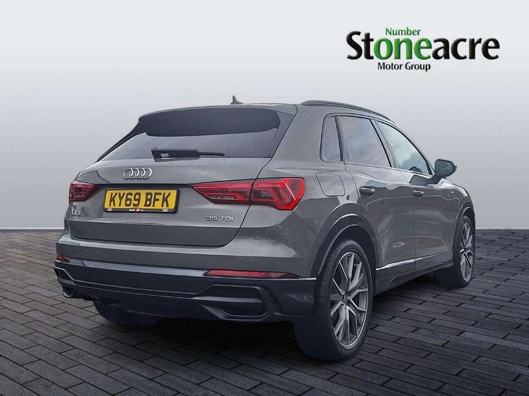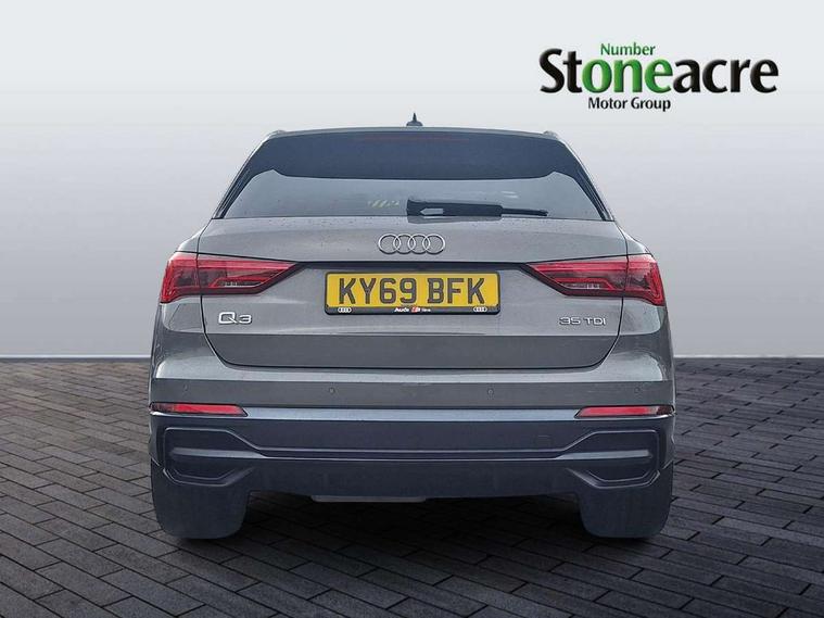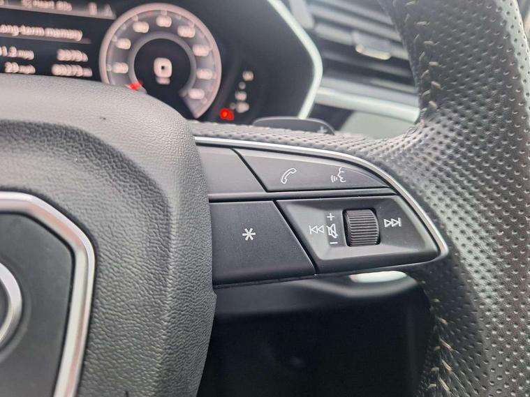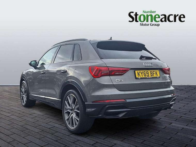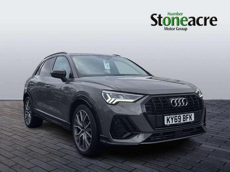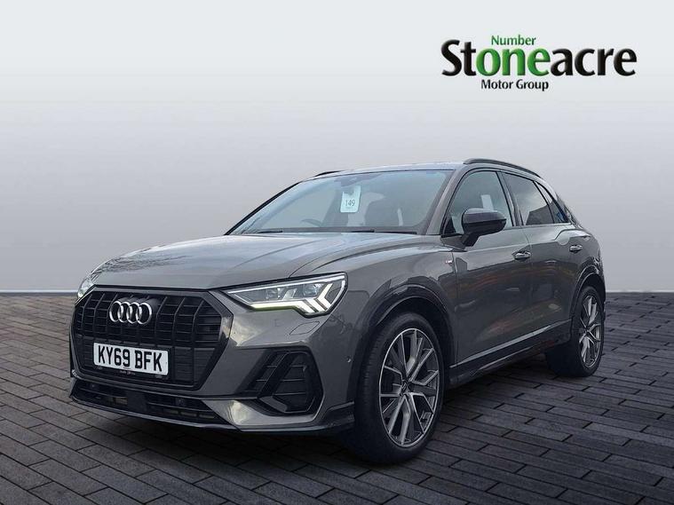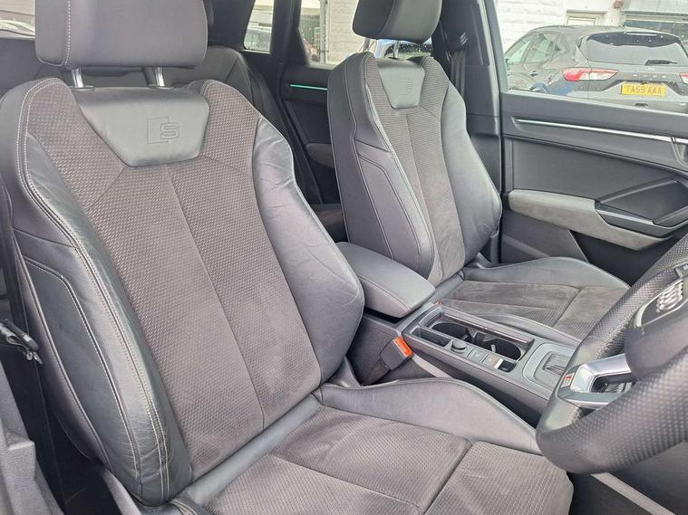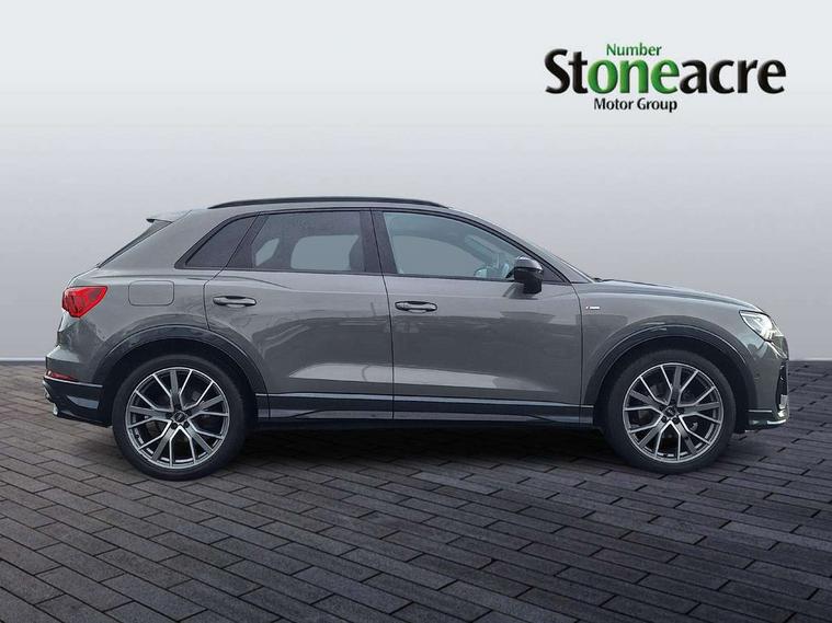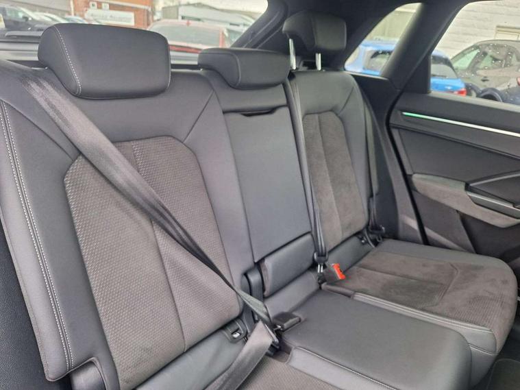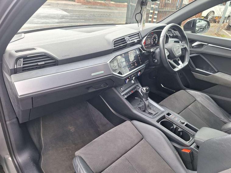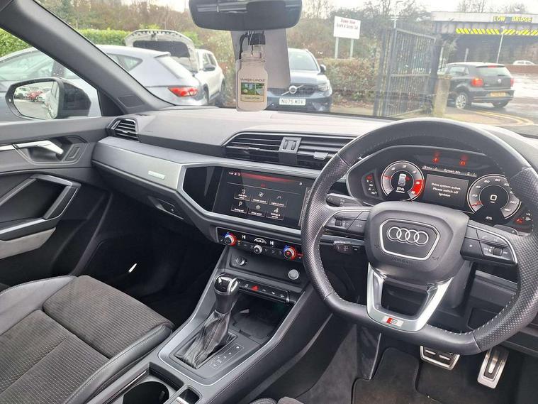 360 degree parking camera, Audi connect safety and service (e-call), Audi drive select, Audi lane departure warning, Audi parking system plus with front and rear sensors, Audi phone box with wireless charging, Audi side assist, Audi smartphone interface, Audi virtual cockpit plus, Bluetooth interface, MMI navigation plus with MMI touch, Power opening/closing tailgate, Progressive steering, Rear cross traffic alert, Service interval indicator, Stop/start system, Voice control system, Adaptive suspension with damping control, Diesel particulate filter, 1 x USB type C and 1 USB type A charging points, Bang & Olufsen 3D Premium Sound System, DAB digital radio module, Acoustic windscreen, Audi Beam uses LEDs to project the Audi Sport logo, Auto dimming and folding door mirrors, Auto dimming rear view mirror, Black roof rails, Contrast bumpers in Manhattan grey paint finish, Diffuser in matt Platinum grey, Electrically adjustable and heated door mirrors with integrated LED side indicators, Front and rear electric windows, Front fog lights, Front spoiler blade in matt platinum grey, Headlight washers, High gloss black finish B and C pillars, Matrix LED headlights with LED rear lights and dynamic front and rear indicator, Panoramic opening glass sunroof, Privacy glass, Rain and light sensors, Rear diffuser strip in matt titanium black, S line bumpers in contrasting Manhattan grey, 12V socket in rear centre console, 3 spoke flat bottomed high multi-function leather sport steering wheel with gearshift paddles, 4 way electric lumbar support for driver and front passenger, 40:20:40 split folding rear bench seat, Adjustable rear seat bench/backrest with centre armrest and cupholder, Aluminium door sill trims, Black cloth headlining, Dual zone climate control, Electrically adjustable front seats, Front and rear black floor mats with contrast stitching in rock grey, Front and rear headrests, Front and rear roof module including reading lights, Front centre armrest with storage compartment and angle adjustment, Glove compartment lighting, Heated front seats, Height and reach adjustable steering wheel, ISOFIX child seat mounting and Top Tether with front passenger airbag deactivation, Luggage compartment light, Perforated leather gearknob, Stainless steel luggage compartment sill finisher, Stainless steel pedals, Black styling pack - Q3, Driver Assistance Pack - Q3, Multi coloured extended ambient interior lighting pack - Q3, Non smoking pack - Q3, 3x3 point rear seatbelts, 6 airbags - Driver, front passenger, curtain and side windows, Audi pre-sense front with pedestrain and cyclist recognition, Electrically operated child locks on rear doors, Electromechanical parking brake, Electronic stabilisation control including ABS, ASR and EDL, Hill descent control, Hill hold assist, Pre sense basic, Seatbelt monitoring, Tyre pressure warning, Warning triangle and first aid kit, Advanced key, Anti theft alarm, Anti theft wheel bolts, Remote central locking, Dark matt brushed aluminium inlay, MMI touch colour display in gloss black with aluminium surround,