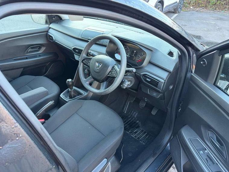 3.5" TFT instrument panel with on-board computer, Cruise control with speed limiter, eCall emergency call system, Eco mode, Electric power assisted steering, Rev counter, Stop/start system, Media Control - DAB Radio with display on instrument panel, Bluetooth, 2 Speakers, Pre-wiring for radio and speakers, USB connection for data transfer and charging, USB socket, 3 speed windscreen wipers, Auto lighting, Black door handles, Black door mirrors, Black radiator grille, Body coloured bumpers, Front electric windows, Heated rear window, High level third brake light, LED automatic daytime running lights, LED Y shape Dacia signature lighting, Manually adjustable door mirrors, Rain sensor, Rear manual windows, Rear side wing doors, Rear wash/wipe, Tinted windows, 1/3 to 2/3 split folding rear seats, 12 volt front socket, 3 height adjustable rear headrests, 3 seat rear bench, Black interior door handles, Fabric upholstery, Fixed smartphone holder on dashboard, Front armrest, Gear shift indicator, Height adjustable driver seat, Height adjustable front headrests, Height/depth adjustable steering wheel, Isofix points for child seats in both outer rear seats, Manual air conditioning, Satin chrome air vents, Single front passenger seat, Steering wheel controls, 3x3 point rear seatbelts, ABS and Emergency brake assist, Automatic emergency braking system, Child locks on rear doors, Door open warning, Driver airbag, ESC (Electronic Stability Control), ESP (Electronic Stability Program) + Hill Start Assist, Front curtain airbags, Front seatbelt pretensioners, Front side airbags, Height adjustable front seatbelts, Passenger airbag, Seatbelt reminder for driver and front passenger, Tyre pressure monitor, Automatic central locking, Immobiliser, Remote central locking, 15" Steel wheels with full wheel cap, Tyre inflation kit,