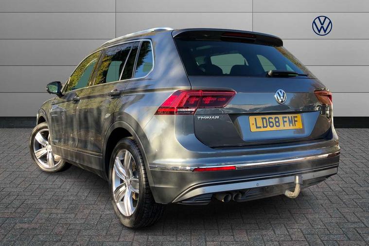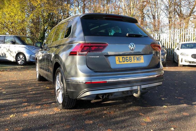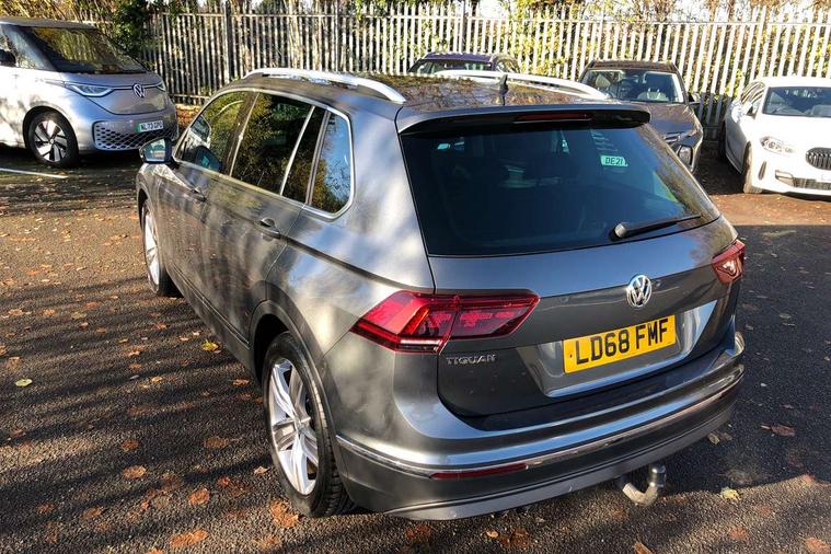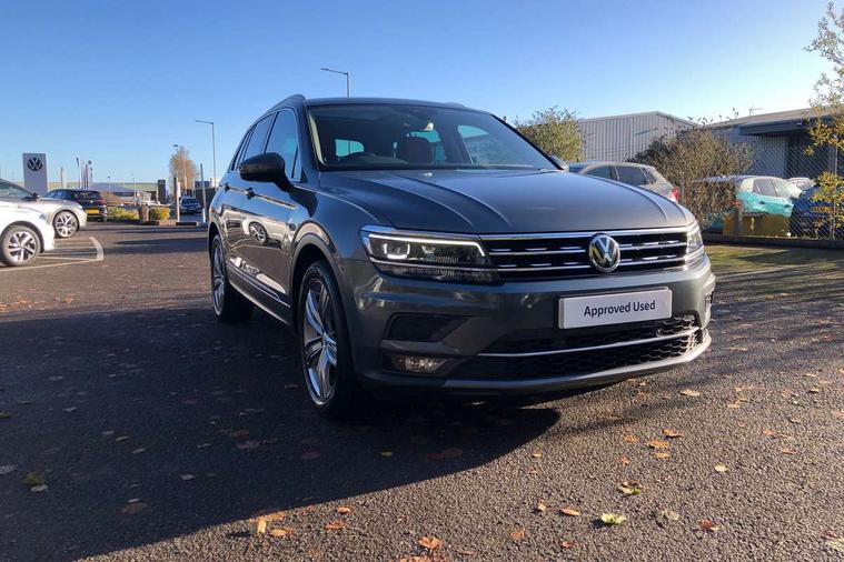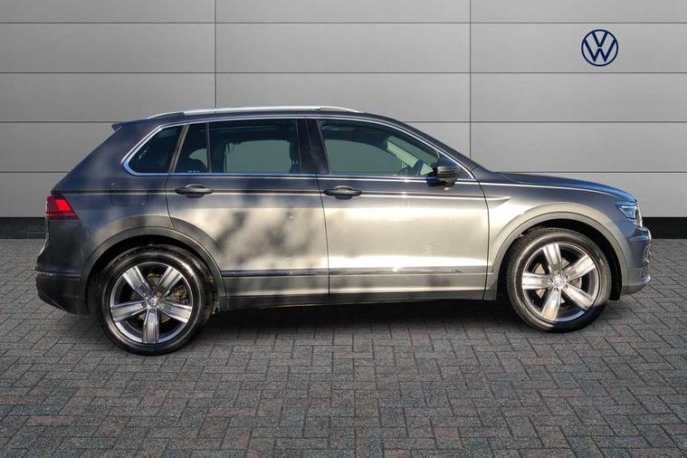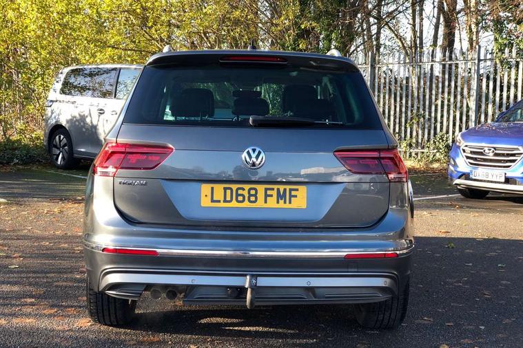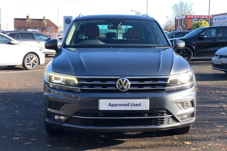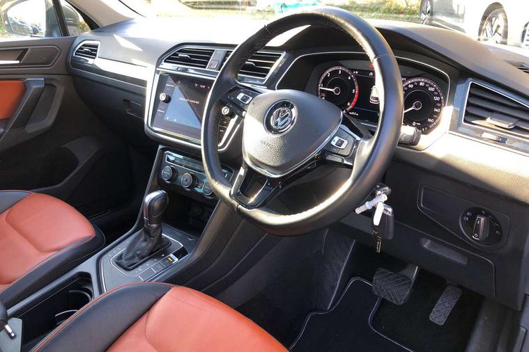 Active information display, Adaptive cruise control, App-Connect, Bluetooth phone integration system, Distance control assist, Fatigue detection system, Instrument cluster, Lane assist, Low washer fluid warning light, Outside temperature display, Service interval indicator, Speed limiter, Warning lights, Diesel particulate filter, XDS electronic differential lock, 2x USB sockets in front, Aux-in socket, DAB Digital radio, MP3 compatible single CD player, SD card slot, Auto dimming interior mirror, Automatic activation of hazard warning lights, Black door protector with chrome inserts, Body colour door handles, Body colour door mirrors, Body coloured bumpers, Chrome side body trim, Chrome side window surrounds, Chrome trimmed radiator grille, Coming/leaving home lighting function, Dusk sensor + auto driving lights, Electric folding door mirrors, Electric heated + adjustable door mirrors, Electric panoramic sunroof with sunblind, Front and rear electric windows, Heated rear window, LED headlights with dynamic light assist daytime running lights and cornering front fog lights, LED rear lights, Rain sensor windscreen wipers, Rear windscreen washer and wiper with interval delay, Silver rear diffuser trim, Silver roof rails, Silver under body guard, Tinted windows (B pillar backwards), Windscreen wipers/ intermittent wipe + 4 position delay, 12V Accessory socket in centre console, 3 rear headrests, 3 zone climate control, 4 load lashing points, 40:20:40 split folding rear seats, Bag hook in luggage compartment, Driver + front passenger lumbar support, Foldable passenger seatback, Front + rear carpet mats, Front centre armrest with 12v socket, Front centre armrest with storage + rear 2 air vents + cupholders, Front seatback folding tables, Height/reach adjust steering wheel, Illuminated driver/passenger vanity mirrors, Illuminated scuff plates, Interior light with delay, Isofix Preparation 2 Rear child seats, Leather gear knob, Load through provision with 2 cupholders when folded, Lockable cooled glovebox, Luggage compartment lighting, Luggage compartment side storage, Map pockets on front seats, Passenger seat height adjuster, Passenger underseat drawer, Rear cupholders, Removable luggage cover, Sliding/reclining rear seats, Storage compartment in driver's door, Storage compartment in passenger's door, Storage compartment in rear doors, Storage tray on dashboard, Sunglasses storage, Variable boot floor, Ambient lighting pack - Tiguan, 3 rear 3 point seatbelts, ABS+EBD+Brake assist, Active bonnet, Active pedestrian safety system, Curtain airbags, Driver/Front Passenger airbags, Driver/Passenger whiplash optimised head restraints, Drivers knee airbag, DTC - Drag torque control, Electronic parking brake with auto hold, ESP with EDL + ASR, First aid kit, Front assist including city emergency braking, Front side airbags, Head airbag system, Height adjustable front 3 point seatbelts + pretensioners, Hill hold control, Passenger airbag deactivate switch, Passenger knee airbag, Pre crash system, Rear side airbags, Seatbelt warning lamp and buzzer, Two tone horn, Warning triangle, Alarm with interior protection, Electronic engine immobiliser, Remote central locking with 2 remote folding keys, Chrome door trim inserts, Piano black interior trim, Steel space saver spare wheel,