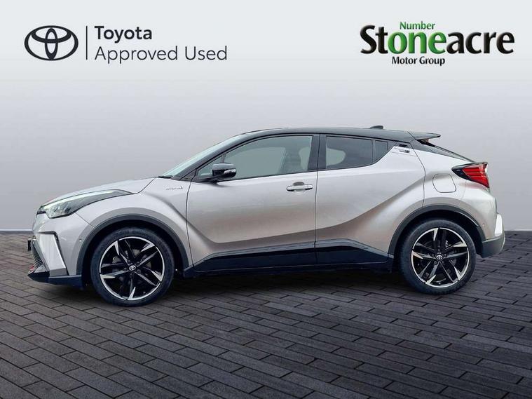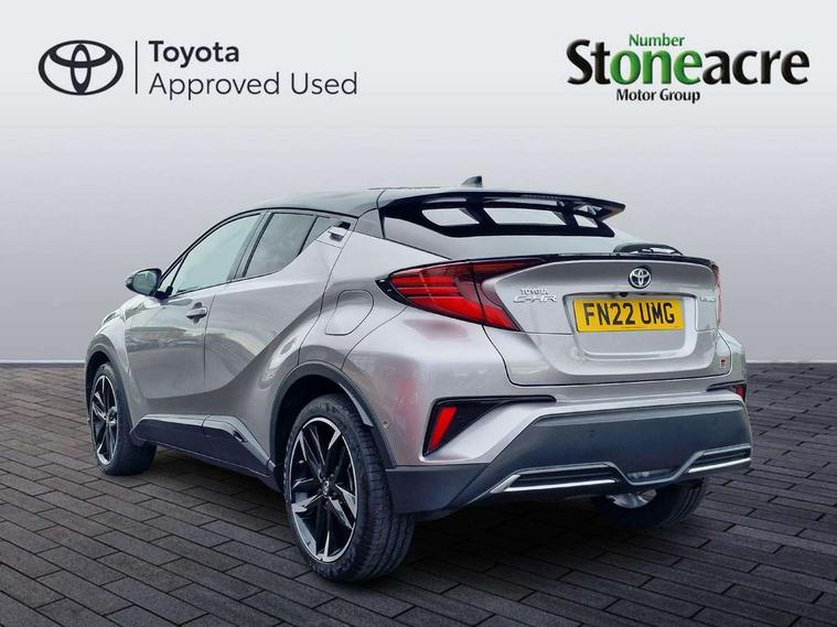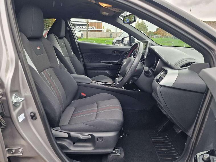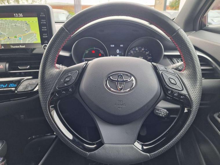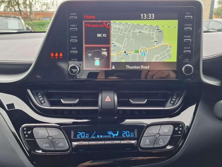 4.2" coloured TFT screen for multi-information display, Adaptive cruise control, Bluetooth connectivity, E-call, Electric power steering, Hybrid system indicator, Lane departure alert with steering control, Remote boot door release in cabin, Remote boot door release in key, Reversing camera, Road sign assist - RSA, Simple Intelligent parking assist, Touch 2 Go navigation system, Trip computer, Voice recognition, Vehicle Stability Control (VSC), 6 speakers, AM/FM radio, DAB Radio (Digital Audio Broadcasting), Toyota touch 2 multimedia system with 8" display, USB connector, Wi-fi connectivity, Adaptive front light system, Adaptive LED Headlights, Anti-jam protection on power windows, Auto high beam, Auto up and down function on all power windows, Automatic headlight levelling, Automatic headlights, Automatic headlights cut-off, Black and body coloured rear bumper, Black upper front grille, Body colour door handles, Body colour door mirrors, Body coloured front bumper, Boot door release with push button, Chrome front lower bumper, Electric heated door mirrors, Follow me home headlights, Front and rear power windows, Front spoiler lip in black, Honeycomb lower front grille, LED daytime running lights, LED fog lights, LED front light guide, LED High mounted stop light, LED rear brake lights, LED rear combination lights, Noise reduction layer on front windows and windscreen, Power adjustable door mirrors, Privacy glass, Rain sensor, Rear sequential indicators, Rear side wing doors, Rear spoiler, Rear tailgate, Rear window defogger, Rear window wiper, Shark fin antenna, UV-filter on driver and passenger windows, UV-filter on rear windows, 12v power outlet - front, 3 rear headrests, 3 seat bench in 2nd row, 3 spoke perforated leather steering wheel, 60/40 split folding rear seat, Adjustable rear headrests, Adjustable speed limiter switch on steering wheel, Assist grips front and centre pillar, Audio and telephone switches on steering wheel, Black front door assist grips, Blue ambient lighting on front cup holders, Blue ambient lighting on front doors, Boot light, Chrome interior door handles, Driver and front passenger personal light, Driver and front passenger Whiplash Injury Lessening seats, Driver and passenger seatback pockets, Dual zone automatic air conditioning, Fabric upholstery, Floor mats, Front cupholders, Front head restraints, Front sports seats, Glovebox with internal light, Hard tonneau cover, Heated driver and front passenger seats, Hooks for luggage holding net, Humidifying Nanoe air purifier, Illuminated entry system, Isofix attachments on outer rear seats, Leather gearshift, Light on driver sun visor, Light on passenger sun visor, Manual telescopic steering wheel, Manual tilt steering wheel, Manually height adjustable driver seat, Manually height adjustable front passenger seat, Manually reclining driver seat, Manually reclining front passenger seat, Manually sliding driver seat, Manually sliding front passenger seat, Microphone on front personal light, Mirror on driver sun visor, Mirror on passenger sun visor, Multimedia switches on steering wheel, Pollen filter, Power adjustable lumbar support on driver seat, Shopping bag hooks, Single front passenger seat, Slow opening on lower glovebox, Voice recognition switch on steering wheel, Tech with parking sensor pack - C-HR, 16 Disk front wheel brake, 3x3 point rear seatbelts, ABS+EBD+Brake assist, Electronic parking brake, Front and rear seatbelt reminder, Front passenger airbag on/off switch, Hill start assist control (HAC), Pre collision system with pedestrian detection, Pre-tensioners and force limiters, Rear door child safety locks, SRS Airbags - Driver + Front passenger, front side, front and rear curtain and driver's knee airbags, Toyota safety sense, Tyre pressure monitoring system, Acoustic vehicle alert system (AVAS), Glass-breaking alarm sensors, Immobiliser, Intrusion alarm, Intrusion sensor, Motion sensor alarm, Power door locks, Power passenger window lock, Remote central locking, Black lower dashboard, Black upper dashboard, Piano black console, Silver deco line on upper dashboard, 19" Black machined alloy wheels, Tyre repair kit,