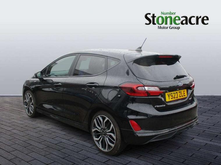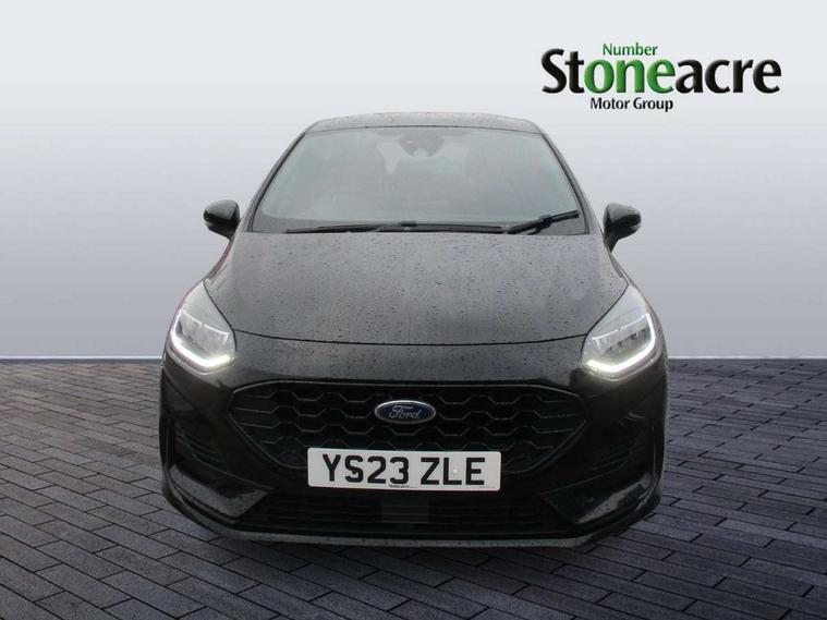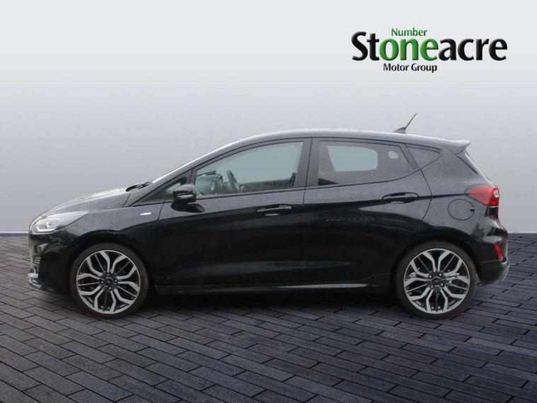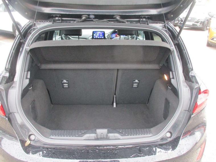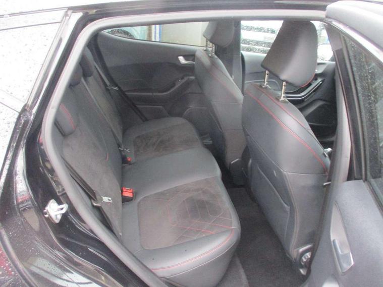 4.2" TFT instrument cluster screen, Bluetooth system, Electric power steering, Ford easy fuel, Rear parking distance sensors, Selectable drive modes (Normal, Sport, Track), Traffic sign recognition, Trip computer, Sports suspension, 2 USB ports, Auxiliary input socket, B&O Premium audio system with 8" touchscreen, 10 speakers, 360 degree sound system, Ford SYNC 3 navigation system and Ford pass connect, DAB Digital radio, Steering wheel mounted controls, Auto high beam, Body colour bumpers, Body colour door handles, Body colour large rear spoiler, Body coloured electrically operated and heated door mirrors with side indicators, Cornering front fog lights, Electric front windows/one touch facility, Electric rear windows, LED Night signature to rear lights, Power foldable door mirrors with puddle lights, Quickclear heated windscreen, Rain sensing wipers and auto dimming rear view mirror, Rear privacy glass, Rear wiper, Unique ST-Line upper grille & full bodystyling kit with ST-Line wing badges, 3 spoke flat bottomed leather steering wheel, 60/40 split folding rear seat, Adjustable head restraints, Black headlining, Boot carpet, Centre console with opening armrest, 2x cupholders, 12v and USB, Chrome inner door handles, Drivers and Passenger lumbar support, EATC - Electronic Auto Temperature control, Footwell illumination, Front floor mats in velour, Front map reading lights, Front seat and rear pockets, Height adjustable passenger seat, Illuminated glovebox, Leather gaiter, LED ambient lighting, Load area light, Manual 4-way driver seat adjust, Overhead console with sunglasses holder, Pollen filter, Rake/reach adjustable steering wheel, Sensico wrapped steering wheel, Sports front seats, NCAP Pack - Fiesta, ST-Line X Trim Pack - Fiesta, 3 point seatbelts on all rear seats, ABS+EBA, Curtain airbags, Driver and passenger airbags, Drivers knee airbag, Electronic stability control with hill start assist, Front passenger airbag deactivation, Front side airbags, Seatbelt warning, Two tone horn, Tyre pressure monitoring system, Ford keyfree system with Keyless entry and keyless start, MyKey system, Remote central locking & engine immobiliser, Thatcham Cat.1 alarm, 18" 5 spoke alloy wheels with rock metallic machined finish,