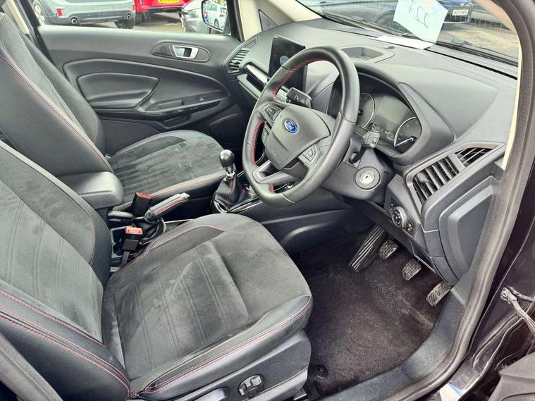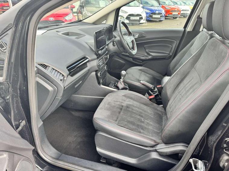 Cruise control, e-Call (emergency call), Easy fuel capless refuelling system, Ford SYNC 3 nav system with DAB radio, 8" screen, emergency assistance, Apple car play/Android auto, 2x USB, 6 speakers, Ford pass connect, Intelligent speed limiter, PAS, Rear parking sensors, Rear view camera, Traffic sign recognition, Trip computer, Sports suspension, Steering wheel mounted audio controls, Auto dimming rear view mirror, Automatic front wipers, Automatic headlights, Black roof rails, Body colour door handles, Body coloured bumpers, Chrome lower window surround, Electrically adjustable and heated door mirrors, Front fog lights, Front grille bars and surround in black, Headlight levelling control, Large rear roof spoiler, LED day running lights, LED third brake light, Power front and rear windows, Puddle lights, Quick-clear heated windscreen, Rear side wing doors, Rear wiper, ST Line body styling kit - Black headlamp bezel, front and rear sport bumpers, body colour lower door claddings, 12V socket in front and rear, 3 seat bench in 2nd row, 60/40 split rear seats, Ambient lighting, Centre console with sliding front armrest, Cooled glovebox, Courtesy lights with map reading light, Driver seat height/lumbar adjust, Driver's side glovebox, Driver/passenger sunvisors and lidded vanity mirrors, EATC - Electronic Auto Temperature control, Folding grab handles, Front head restraints, Front seat back map pockets, Illuminated glovebox, Illuminated luggage compartment, Isofix system on outer rear seats, Luggage compartment carpet, Neosuede/Partial sensico leather upholstery, Overhead console with sunglasses holder, Rake adjustable rear seats, Reach + rake adjustable steering column, Rear headrests, Sensico trimmed steering wheel, handbrake and gearshift gaiter with red stitching, Single front passenger seat, ST-Line Front floor mats with red stitching, Stainless steel sports pedals, Storage drawers under front seats, Tie down hooks, Variable boot floor, 3x3 point rear seatbelts, ABS, Autonomous emergency braking, Child locks on rear doors, Curtain airbags, Driver airbag, Drivers knee airbag, Electronic Stability Programme with hill launch assist, Front passenger airbag deactivation, Front side airbags, Passenger airbag, Pre collision assist system with AEB, Seatbelt reminder for driver and front passenger, Traction control, Tyre pressure monitoring system, Immobiliser, MyKey system, Remote central locking, Thatcham 1 volume sensing alarm, Low rolling resistance tyres, Tyre inflation kit,