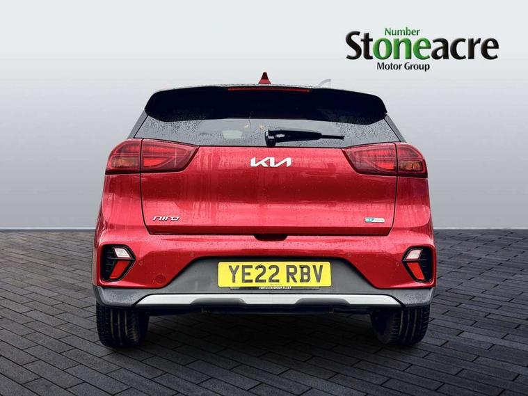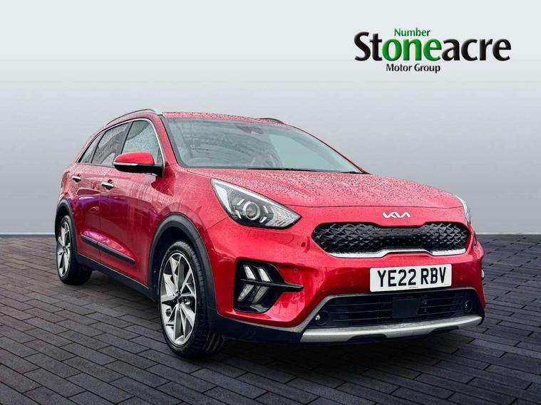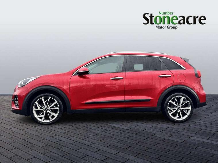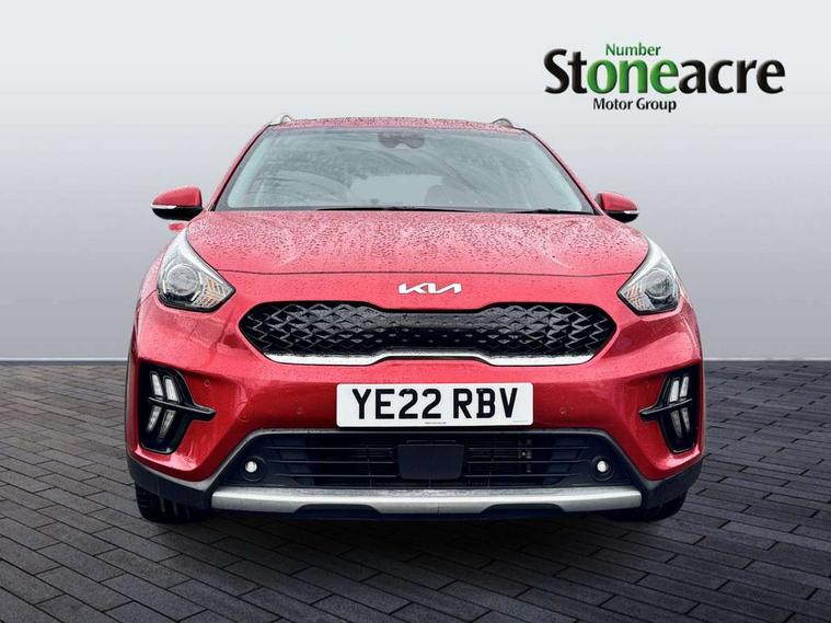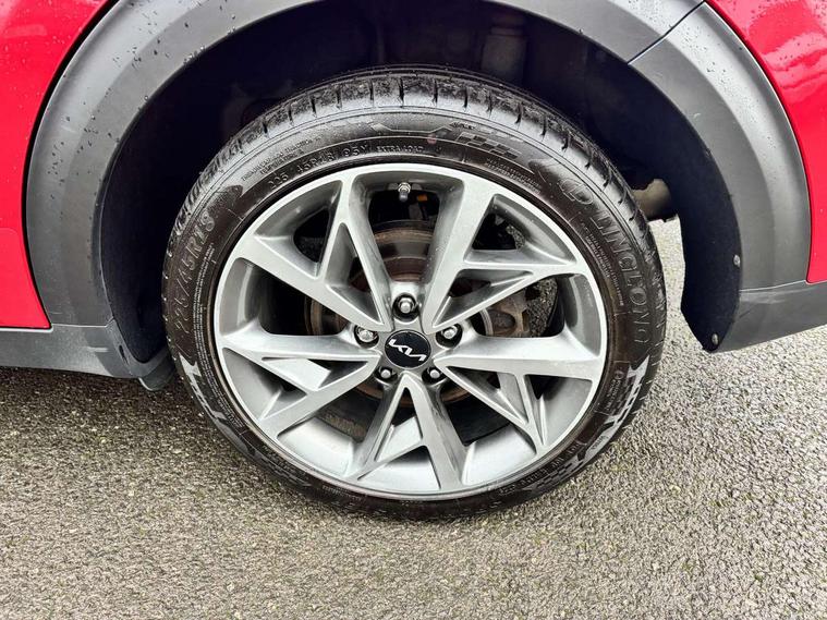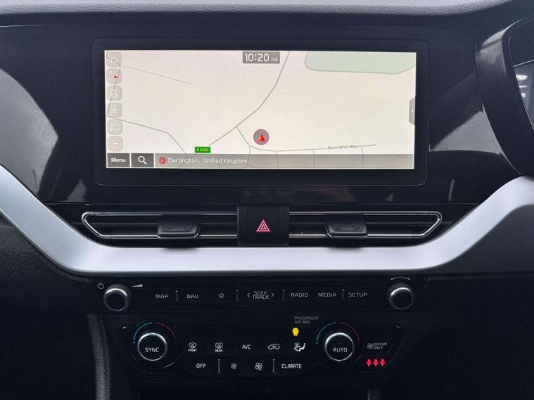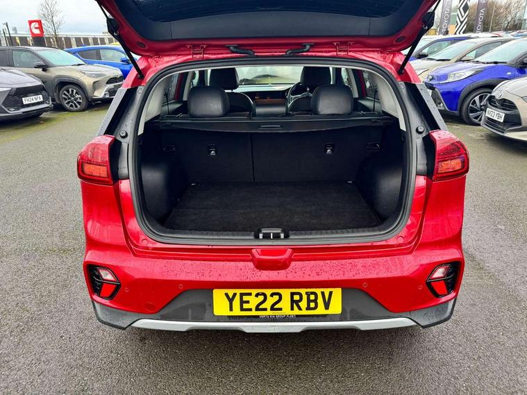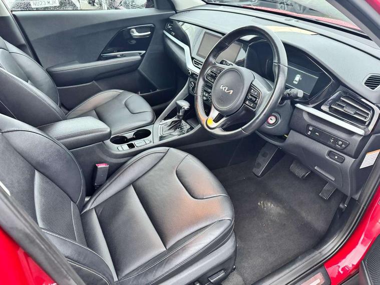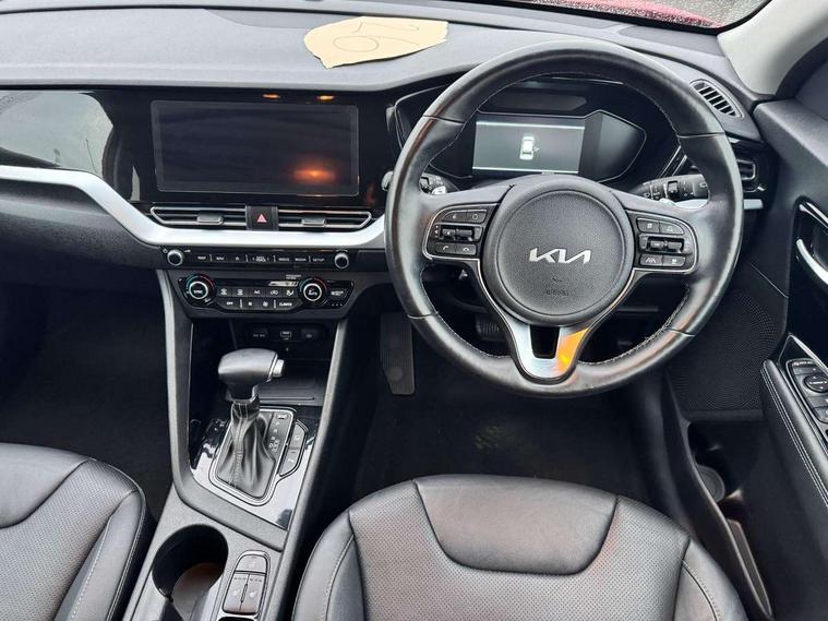 10.25" Touch screen satellite navigation with european mapping and traffic messaging channel, 7" full supervision cluster with TFT colour display, Adaptive smart cruise control function (SCC) with stop and go, Apple car play/Android Auto with voice control, Digital clock, Drive mode selector, Driver attention warning, Emergency call service, Emergency stop signalling system, Forward collision avoidance assist, Front parking sensors, Kia connected services featuring TomTom live, Lane Following Assist (LFA), Lane keep assist, Motor driven power steering, Rear parking sensors, Reversing camera, Speed limiter, Trip computer with distance/fuel consumption/average speed, UVO connect, Wireless Smartphone charger, 'Shark fin' mobile antenna, 6 speakers, Bluetooth with music streaming, DAB Radio with MP3, Steering wheel mounted controls, USB connection located in centre console, USB port, All round electric windows with drivers and front passenger auto up/down function, Auto dimming rear view mirror, Automatic defog system, Automatic headlight control system, Black beltline mouldings, Black side sills, Black wheel arch mouldings, Body colour bumpers, Body coloured/high gloss door mirrors, Chrome door handles, Driver's side wide angle mirror, Electrically folding/adjustable/heated door mirrors with LED indicators, LED daytime running lights, LED fog lights, LED rear combination lights, LED third brake light, Manual headlight levelling, Matt black radiator grille, Privacy glass - Rear windows and tailgate, Projector headlamps, Rain sensing front wipers, Rear side wing doors, Rear spoiler, Rear wiper, Roof rails, Solar glass, Variable front intermittent wipers, Waistline black paint, Welcome and follow-me home light functionality, 3 seat bench in 2nd row, 3 x passenger assist grips, 60/40 split/folding 2nd row of seats, 8 way electric adjustable drivers seat, All-round height adjustable headrests, Aluminium door scuff plates, Bulb type overhead console lamp with sunglasses case, Centre console storage box, Centre room lamp, Cupholders in rear armrest, Driver/passenger sunvisors with illuminated vanity mirrors, Drivers seat power lumbar support, Dual zone automatic air conditioning, Front and rear door storage, Front/rear centre armrests, Headlining in Light grey, Heated front seats, Heated steering wheel, High gloss black lower console trim, High gloss black steering wheel trim, Illuminated ignition key hole, Interior door lock/unlock function, ISOFIX Child seat top tethers and anchor fixings, Leather trimmed door armrests, Leather trimmed steering wheel, Leather trimmed steering wheel and gearshift, Leather upholstery, Luggage area lamp, Luggage area load cover, Luggage net with hooks, Paddle shifts, Passenger seat height adjuster, Satin finish inner door handles, Seatback pocket - driver, Seatback pocket - front passenger, Single front passenger seat, Tilt/telescopic adjustable steering wheel, Under floor storage box, Ventiliation ducts to rear compartment, Towing pack - Niro, 3 point seatbelts on all seats, ABS, Automatic unlocking of doors in case of impact, Drivers knee airbag, Electric parking brake with auto hold function, Electronic stability control, Front passenger airbag cut-off switch, Height adjustable front seatbelts, Hill start assist control (HAC), Manual child lock in rear doors, Traction control, Twin curtain airbags with roll over sensor, Twin front and side airbags, Tyre pressure monitoring system, Alarm system and engine immobiliser, Deadlocks, Locking wheel nuts, Remote central door locking with fold away key, Speed sensitive auto door locking, Visible vehicle identification number, High gloss black centre fascia, High gloss black door inserts, 18" Alloy wheels, Tyre mobility kit,