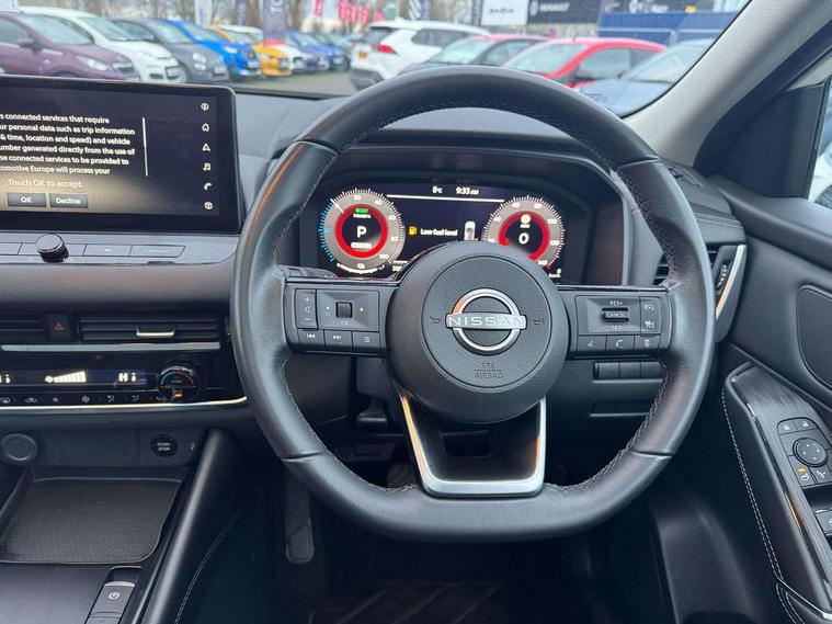 Android auto/Apple CarPlay (Wired), Blind spot warning, Drive modes (sport, normal, eco), Electric speed sensitive power steering, Emergency and breakdown call, Front and rear parking sensors, Full Digital 12.3" TFT Digital Combimeter, Google maps services - search, weather, 3D maps and Google street view, Idle stop/start system, Intelligent around view monitor, Intelligent Cruise control (ICC), Intelligent driver alert system, Intelligent forward collision warning, Intelligent lane intervention, Lane departure prevention, Lane departure warning system, Maximum speed limiter, Moving object detection, Nissan connect 12.3 inch touchscreen infotainment system, Nissan connect navigation, Push button starter, Rear cross traffic alert, Rear view camera, Remote control services - door locks, lights, horn and car locator, Telematics - notifications and connectivity services, TomTom live traffic services, Traffic sign recognition with legal speed adjustment, Trip computer, Virtual personal assistant and firmware over the air capability, Wireless apple carplay, 6 speakers, AM/FM audio system with DAB, Bluetooth audio streaming, Front USB connections (Type-A and Type-C), Rear USB charging only ports (Type-A and Type-C), Auto dimming rear view mirror, Auto rear wiper when reversing, Automatic hazard signal with emergency stop signal, Body colour mirror caps, Body coloured door handles, Bodyside mouldings, Chrome side window finisher, Door handle with button, e-POWER badging, Electric auto folding door mirrors, Electrically adjustable and heated door mirrors with LED turn indicator, Follow me home headlights, High beam assist, Intelligent auto headlights, LED daytime running lights, LED Headlights, LED rear lights, One touch front and rear electric windows with remote opening and closing, Partially body coloured bumpers, Privacy glass, Rear bumper with graphite insert, Rear reversing light (bulb lighting), Rear roof spoiler, Rear side wing doors, Rear styling plate, Shark fin antenna, Splash free rain sensing wipers, Super UV and infrared cut glass, Three blink turn signal, 12v power socket in dashboard and luggage, 2x Rear coat hooks, 3 bench rear seats in 2nd row, 3 rear headrests, 4 folding assist grip, 6-way manually adjustable driver's seat, 60/40 split folding rear seat bench, Ambient lighting around centre console, Centre console storage tray, Chrome interior door handles, Cloth monoform upholstery, Driver and front passenger sunvisors with illuminated vanity mirrors, Driver seat back pocket, Dual zone automatic climate control with pollen filter, e-POWER shifter, Front and rear door storage, Front centre console and armrest, Front cupholders x 2, Front door with bottle holders, Glovebox with light, Hard trunk cover, Height adjustable driver's seat, Height adjustable front headrests, Height adjustable passenger seat, Leather steering wheel, Luggage board system, Luggage space lighting, Manually adjustable passenger (slide recline + lifter), Multifunction steering wheel, Passenger seat back pocket, Rear armrest with 2 cupholders, Rear door bottle holders, Single front passenger seat, Soft PVC kneepad, Steering wheel switches, Sunglasses holder, Tilt/telescopic adjustable steering wheel, Two rear isofix child seat anchorage points with top tether, Welcome light and console tray ambient lighting, 3x3 point rear seatbelt pretensioners + load limiters, ABS with EBD and brake assist, Active brake limited slip, Auto hold function, Child locks on rear doors, Curtain and front side, far side airbags, Driver and passenger airbags, Driver, passenger and 2nd row rear seat belt reminder, Electronic parking brake, Front seatbelt pretensioners + load limiters, Height adjustable front seatbelts, Hill start assist, Intelligent blind spot intervention, Intelligent front emergency braking with pedestrian, cyclist recognition and junction assist, Intelligent rear automatic braking, Tyre pressure monitoring system, Vehicle dynamic control, Capless fuel filler, Engine immobiliser, Intelligent Key, Remote central door locking with deadlocking, Thatcham Cat.1 alarm, Interior instrumental panel B finisher, 18" Diamond cut alloy wheels, Tyre puncture repair kit,