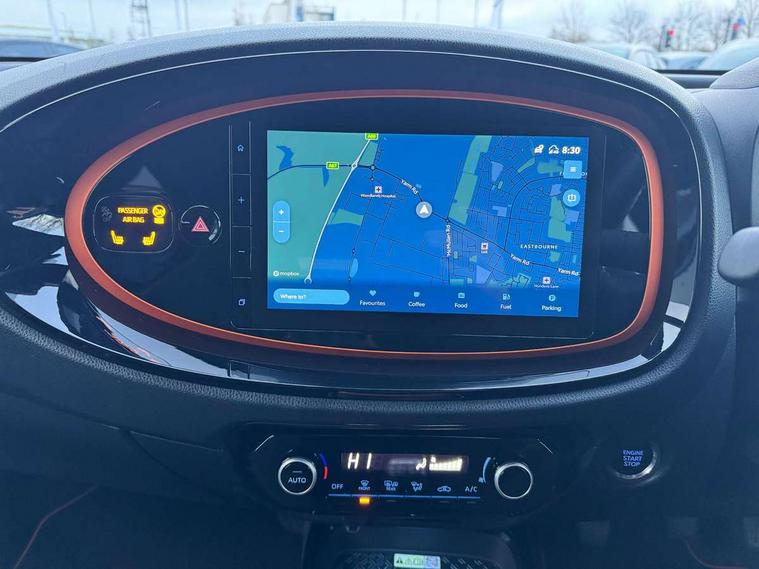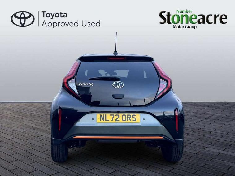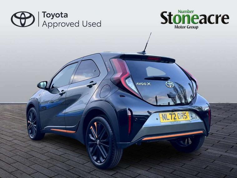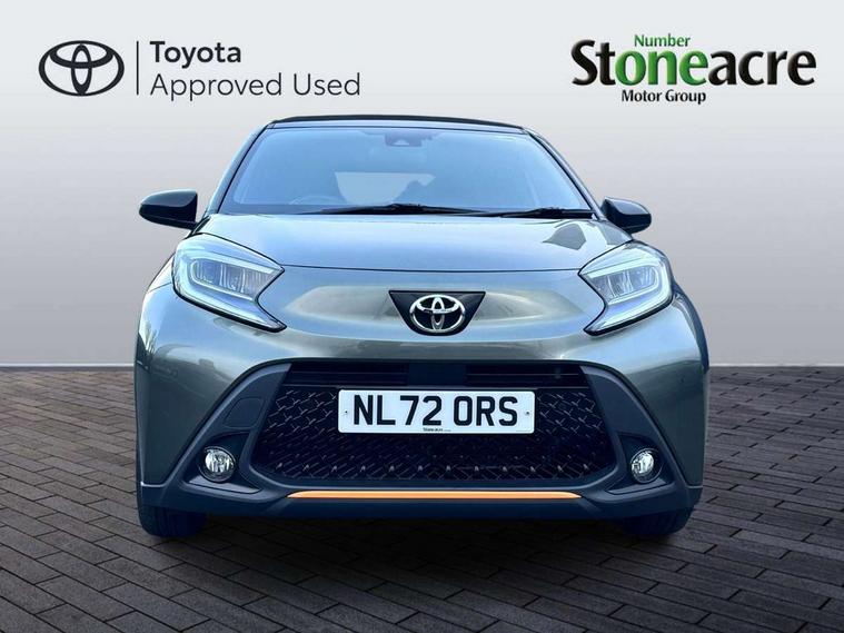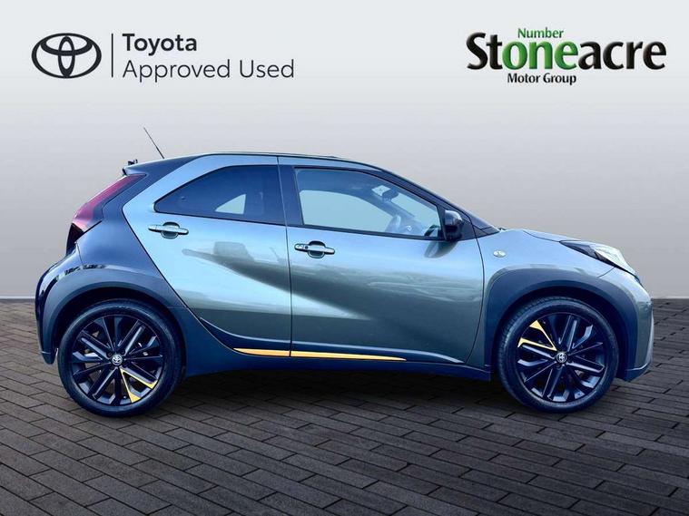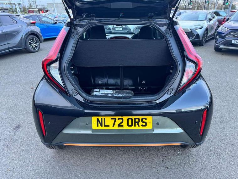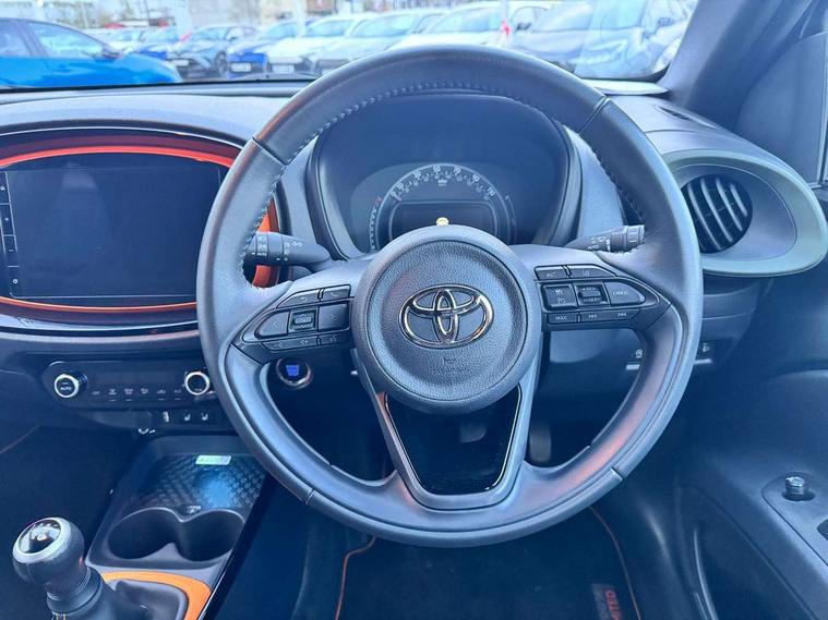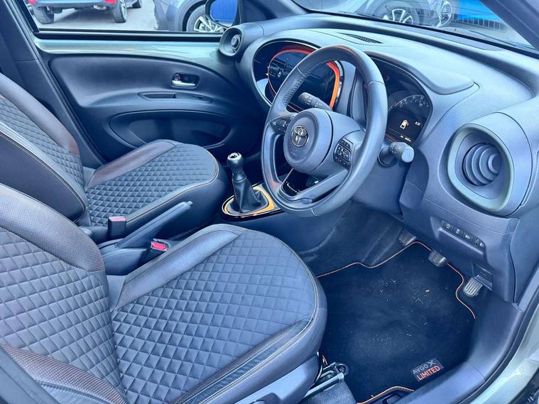 4.2" TFT colour screen, Adjustable speed limiter, Analogue speedometer, Bluetooth connectivity, Digital tachograph, Driver attention alert system, eCall emergency call system, Electric power steering, Front and rear parking sensors with auto brake, Intersection turn assist, Key reminder warning, Noise reduction kit, Pre collision system with emergency steering assist, Remote boot door release on key, Reversing camera with static guide lines, Smart entry and push button start, Speed limit display, Start and stop, Wireless charger, Wireless Smartphone Integration includes Apple CarPlay and Android auto, Vehicle Stability Control (VSC), 4 speakers, 9" HD multimedia display touch screen with Toyota smart connect, DAB digital audio broadcast, USB connector, Auto headlights, Auto wipers, Automatic headlights cut-off, Automatic high beam On/Off switch, Bicycle towing hook, Black fog light surrounds, Black side protection mouldings, Black wheel arch mouldings, Body colour door handles, Body coloured front bumper, Boot door scuff plate, Canvas roof, Eclipse black rear bumper, Electric heated door mirrors, Follow me home headlights, Front fog lights, Front power windows, Gloss black door mirrors, Gloss black upper front grille, Headlight cut-off reminder, LED daytime running lights guide, LED front light guide, LED High mounted stop lamp, LED projector headlights, Limited edition logo on C pillar, Magnolia strip on lower front and rear bumpers, Manual day/night rear view mirror, Manual headlight levelling, Metallic Bi-tone paint, Power adjustable door mirrors, Privacy glass, Rain sensor, Rear combination lights LED bulb type, Rear side wing doors, Rear windscreen defogger, Rear windscreen wiper, Remote hazard lights system, Short antenna, Variable intermittent windscreen wipers, 12v power outlet - front, 2 seat bench in 2nd row, 3 spoke leather steering wheel, 50/50 split folding rear seat, Adjustable speed limiter switch on steering wheel, Audio and telephone switches on steering wheel, Auto air conditioning, Black insert on steering wheel, Black roof lining, Boot light, Canvas top headlining, Centre room light, Chrome interior door handles, Chrome surround on air conditioning buttons, Clean air filter, Driver and front passenger heated seats, Floor mats, Front and rear cup holders, Front head rest deco art, Front head restraints, Height adjustable driver seat, Intelligent adaptive cruise control switch on steering wheel, ISOFIX child restraint system on rear seats, Lane departure alert switch on steering wheel, Leather gearshift knob, Light blue ambient lighting in centre console, Manual tilt steering wheel, Manually reclining and sliding driver seat, Manually reclining and sliding front passenger seat, Multimedia switches on steering wheel, Partial leather seats, Pollen filter, Rear door pockets, Rear head restraints, Satin silver insert on gear shift knob, Single compartment glovebox with lights, Single front passenger seat, Soft tonneau cover, Sun visors with mirror on driver and passenger side, Voice recognition switch on steering wheel, Toyota safety sense pack - Aygo X, Anti lock braking system + Electronic brake force distribution, Child safety door lock, Emergency brake light signal (EBS), Hill start assist control (HAC), Passenger airbag on/off switch, Seat belt reminder for front and rear seats, Supplement restraints system (SRS) - 6 airbags, Traction control, Tyre pressure warning system, Immobiliser, Remote power door locks, Black wheel centre caps, Mandarina Orange wheel insert, Tyre repair kit,