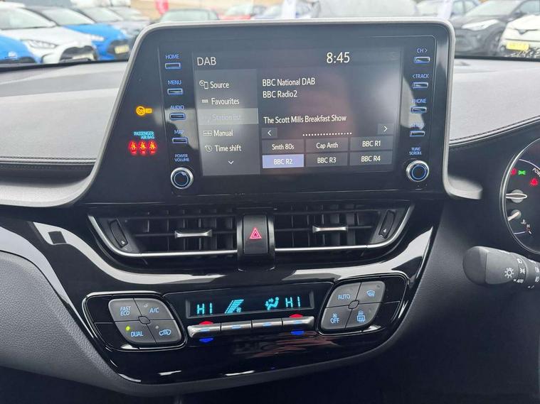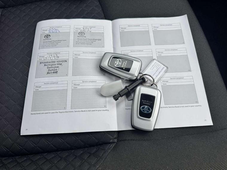 4.2" coloured TFT screen for multi-information display, Adaptive cruise control, Bluetooth connectivity, E-call, Electric power steering, Hybrid system indicator, Lane departure alert with steering control, Lane trace assist, Push button start, Push button tailgate release, Remote boot door release in cabin, Remote boot door release in key, Reversing camera, Road sign assist - RSA, Smart voice assist, Trip computer, Voice recognition, Vehicle Stability Control (VSC), 6 speakers, AM/FM radio, DAB Radio (Digital Audio Broadcasting), Toyota touch 2 multimedia system with 8" display, USB connector, Wi-fi connectivity, Anti-jam protection on power windows, Auto high beam, Auto up and down function on all power windows, Automatic headlights, Automatic headlights cut-off, Black and body coloured rear bumper, Black lower front grille, Black upper front grille, Body colour door handles, Body colour door mirrors, Body colour front spoiler lip, Body coloured front bumper, Boot door release with push button, Electric heated door mirrors, Follow me home headlights, Front and rear power windows, Front fog lights, Headlight cut off reminder, Honeycomb lower front grille, LED daytime running lights, LED High mounted stop light, LED rear brake lights, LED rear combination lights, Manual headlight levelling, Manually retractable door mirrors, Noise reduction layer on front windows and windscreen, Power adjustable door mirrors, Rear side wing doors, Rear spoiler, Rear tailgate, Rear window defogger, Rear window wiper, Reflective LED headlights, Shark fin antenna, UV-filter on driver and passenger windows, UV-filter on rear windows, 12v power outlet - front, 3 rear headrests, 3 seat bench in 2nd row, 3 spoke leather steering wheel, 60/40 split folding rear seat, Adjustable rear headrests, Adjustable speed limiter switch on steering wheel, Assist grips front and centre pillar, Audio and telephone switches on steering wheel, Black front door assist grips, Boot light, Chrome interior door handles, Cloth upholstery, Driver and front passenger personal light, Driver and front passenger Whiplash Injury Lessening seats, Dual zone automatic air conditioning, Floor mats, Front cupholders, Front head restraints, Front sports seats, Glovebox with internal light, Hard tonneau cover, Hooks for luggage holding net, Humidifying Nanoe air purifier, Illuminated entry system, Isofix attachments on outer rear seats, Leather gearshift, Light on driver sun visor, Light on passenger sun visor, Manual telescopic steering wheel, Manual tilt steering wheel, Manually adjustable lumbar support on driver seat, Manually height adjustable driver seat, Manually height adjustable front passenger seat, Manually reclining driver seat, Manually reclining front passenger seat, Manually sliding driver seat, Manually sliding front passenger seat, Microphone on front personal light, Mirror on driver sun visor, Mirror on passenger sun visor, Multimedia switches on steering wheel, Pollen filter, Shopping bag hooks, Single front passenger seat, Slow opening on lower glovebox, Voice recognition switch on steering wheel, 16 Disk front wheel brake, 3x3 point rear seatbelts, ABS+EBD+Brake assist, Electronic parking brake, Front and rear seatbelt reminder, Front passenger airbag on/off switch, Hill start assist control (HAC), Pre collision system with pedestrian detection, Pre-tensioners and force limiters, Rear door child safety locks, SRS Airbags - Driver + Front passenger, front side, front and rear curtain and driver's knee airbags, Toyota safety sense, Tyre pressure monitoring system, Tyre pressure warning system, Acoustic vehicle alert system (AVAS), Glass-breaking alarm sensors, Immobiliser, Intrusion alarm, Intrusion sensor, Motion sensor alarm, Power door locks, Power passenger window lock, Remote central locking, Black lower dashboard, Black upper dashboard, Grey deco line on upper dashboard, Matte black centre console, Tyre repair kit,