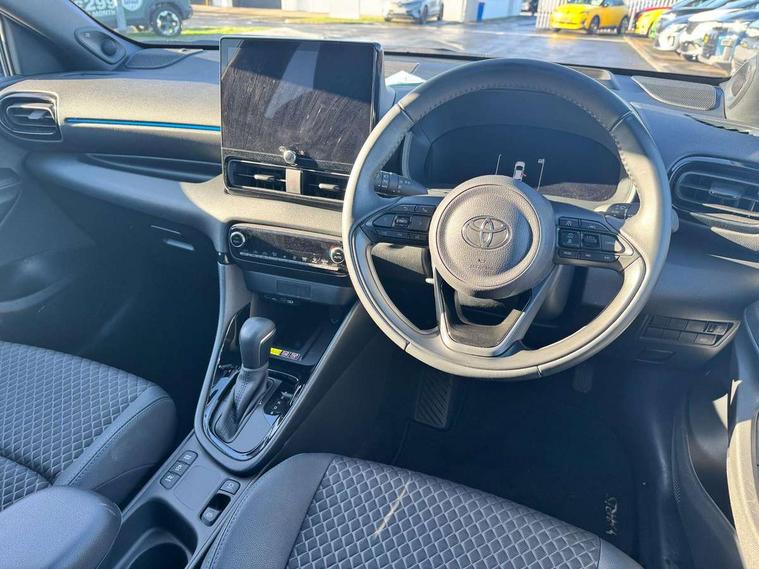 12.3" Digital Combimeter, Adaptive cruise control, Adjustable speed limit with speed warning, Bluetooth connectivity, Colour binocular inspired displays with digital speedometer, E-call, Electric power steering, Head up Display, Hybrid energy display, Multi information display switches on steering wheel, Reversing camera, Tailgate, Voice recognition, Wireless charger, Vehicle Stability Control (VSC), 10.5" Toyota smart connect multimedia with wireless smartphone integration incl apple car play and cloud Navigation, 6 speakers, 8 Speakers, JBL speaker system, Toyota Touch 3 system with DAB radio, USB connection, Acoustic windscreen glass, Auto windscreen wipers, Automatic headlights, Body coloured door mirrors, Dark chrome lower front grille, Electric adjustable heated door mirrors, Follow me home headlights, Front auto power windows with anti jam protection, Full LED rear lights, LED daytime running lights, LED front fog lights, LED front light guide, LED Headlights, LED High mounted stop lamp, LED Indicators, LED rear light guide, Manual headlight levelling, Painted chequered front grille with hot stamp in mesh design, Rain sensor, Rear auto power windows with anti jam protection, Rear privacy glass, Rear side wing doors, Rear spoiler, Rear wiper, Shark fin antenna, Turning signal integrated indicators in door mirrors, Variable front intermittent wipers, 3 adjustable rear headrests, 3 seat bench in 2nd row, 3 spoke leather steering wheel, 60/40 split folding rear seat, Active headrests, Adjustable boot height, Black roof lining, Coat hooks in rear grab handles, Cup holders (2 front & door), Data Communication Module (DCM) connected services, Dual zone automatic air conditioning, Front armrest, Front sport seats, Glovebox, Height adjustable driver's seat, Height adjustable passenger seat, Isofix seat fixing, Leather gearshift, Map pockets on the backs of the front seats, Nanoe-X air purifier, Partial leather upholstery, Pollen filter, Shopping bag hooks, Single front passenger seat, Tilt/telescopic steering column, Safety pack - Yaris, 3 point seatbelts on all rear seats, ABS+EBD+Brake assist, Electronic parking brake, Emergency brake light system (EBS), Front passenger airbag on/off switch, Front seatbelt reminder, Hill start assist control (HAC), Rear child proof door locks, Rear seat belt reminder, Supplemental Restraint System (SRS) 8 airbags: Driver & passenger's airbags, dual side curtain airbags, side impact airbags, front centre airbag, Toyota Safety Sense 3 with over the air updates, Tyre pressure warning system, 2x Master key, Alarm/immobiliser, Keyless smart entry with push button start, Remote AC via MyT, Remote locking via MyT, Remote powered central double locking doors, Smart digital key, Piano black interior trim, Soft touch instrument panel, 17" Black Machined-face, 5 double spoke alloys wheels, Space saver spare wheel,