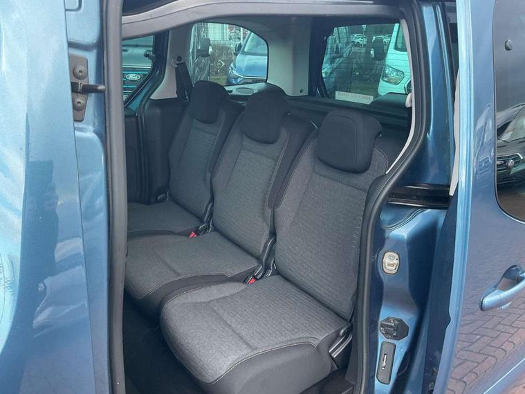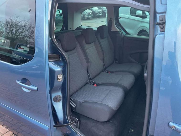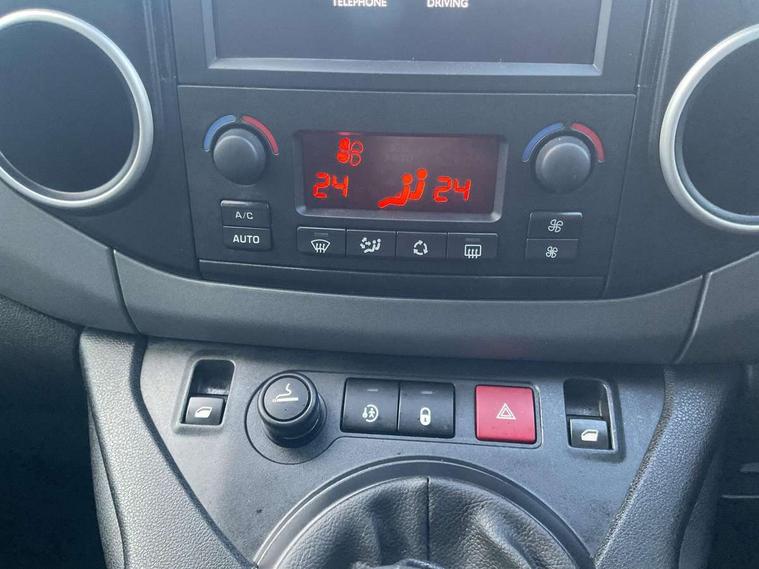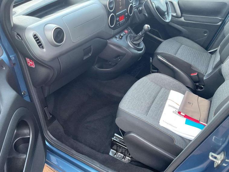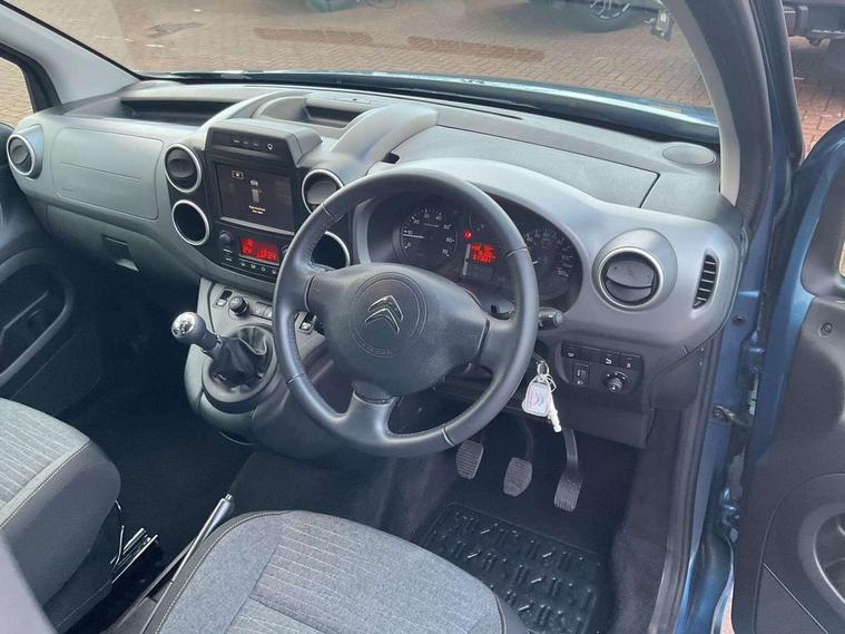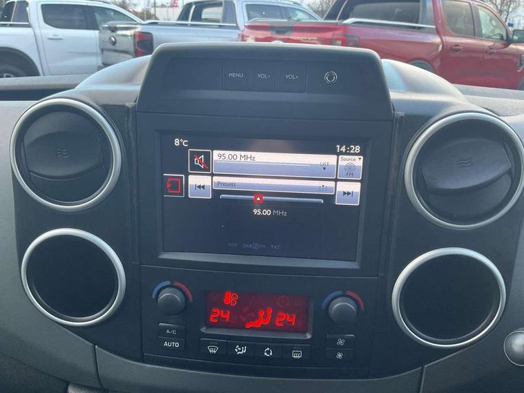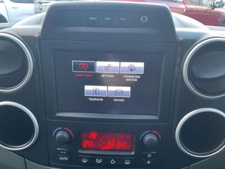 7" touch screen, Bluetooth with USB Box, Cruise control + speed limiter, Front parking sensor, Multi function trip computer, Rev counter, Service interval indicator, Variable PAS, Warning buzzer and light for front seatbelts unfastened, 4 speakers, Audio remote control in steering wheel, DAB Digital radio, RDS stereo radio + CD player/mp3 facility, 2 speed front wipers + intermittent wipe, Automatic activation of hazard warning lights, Automatic headlights and windscreen wipers, Body colour bumpers, Body colour door handles, Body colour door mirrors, Body colour rear plate number moulding, Electric front windows/one touch facility, Electrically adjustable door mirrors, Front fog lamps, Headlight height adjustment, Laminated windscreen, LED daytime running lights, Longitudinal roof bars, Rear tailgate with rear heated window, Rear wiper, Split opening tailgate with dark tinted rear glass, Tilt opening rear windows, Twin sliding side doors, Air conditioning, Aircraft type trays in front seat backrests, Carpeted loadspace, Cigarette lighter, Driver and passenger sunvisors, Front armrest, Front head restraints, Front seat storage pockets, Height adjustable driver's seat, Height/reach adjustable steering column, Isofix system on outer rear seats, Leather steering wheel, Liberal cloth upholstery, Overhead storage shelf, Rear head restraints, Removable / retractable luggage cover, Removable rear seats, Three individual sliding/fold flat rear seats [row 2], Under floor storage compartment [row 2], Serenity pack with heated mirrors - Berlingo, 3 point seatbelts on all rear seats, ABS/EBD, Curtain airbags, Driver and passenger airbags, EBA, ESC - Electronic Stability Control + traction control, Front lateral airbags, Front passenger airbag deactivation, Height adjustable front seatbelts + pretensioners, Hill start assist, Side airbags, Tyre pressure sensor, Deadlocks, Immobiliser, Locking fuel filler cap, Remote central locking, 16" Managua alloy wheels, Space saver spare wheel,
