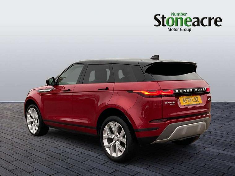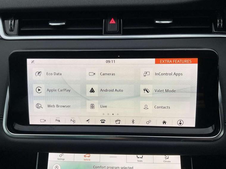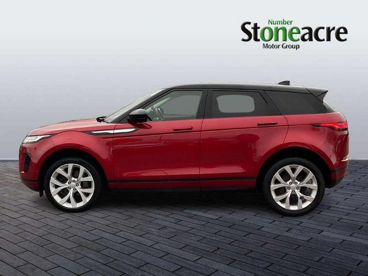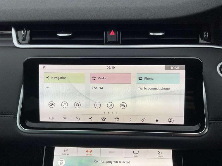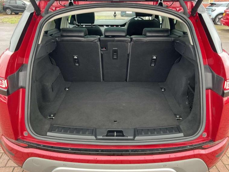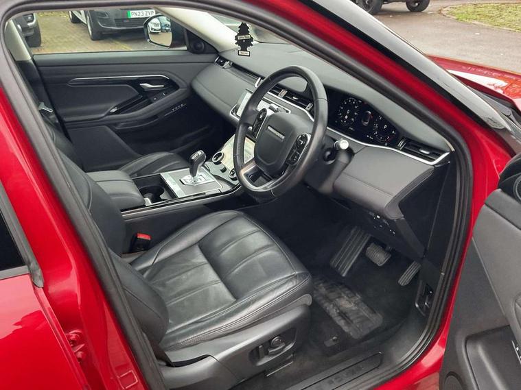 360 degree parking aid, Android Auto, Apple car play, Bluetooth connectivity, Brake pad wear indicator warning light, Clear exit monitor, Driver condition monitor, Duo touch pro, Electronic power assisted steering (EPAS), InControl remote, Interactive Driver display instrument cluster, Land Rover InControl apps, Lane keep assist, Navigation pro system, Park assist - Parallel, perpendicular and parking exit, Pro services and wifi hotspot, Push button starter, Rear traffic monitor, Smart settings, Traffic sign recognition with adaptive speed limiter, Voice control system, All terrain progress control, Efficient Driveline, Large fuel tank, Passive suspension, Terrain Response 2 Auto, Digital Audio Broadcast radio-DAB, Steering wheel mounted controls, Automatic headlight levelling, Electric windows with one touch open/close and anti trap, Evoque badge, Flush deployable exterior door handles, Heated rear window with timer, Heated washer jets, Heated windscreen, Power fold, auto-dimming, heated door mirrors with memory and approach lights, Rain sensing windscreen wipers, Rear fog lights, Standard roof, Tailgate spoiler, 40:20:40 split folding rear seats, Isofix system on outer rear seats, Overhead lighting console, Overhead stowage for sunglasses, Passive front head restraints, Rear air vents, Rear centre headrest, Sunvisors with illuminated vanity mirrors, Twin front cupholders with cover, Twin sliding front centre armrest, Two zone climate control, Anti-lock braking system (ABS), Customer configurable autolock, DSC - Dynamic Stability Control, Electronic brake force distribution, Electronic parking brake, Electronic traction control, Front and rear seatbelt reminder, Hill descent control, Hill launch assist, Low traction launch, Power operated child locks, Roll stability control, Six airbags - Driver and passenger airbags/driver knee airbag/front side airbag and curtain airbags, Torque vectoring brake, Tyre pressure monitoring system, Alarm, Immobiliser, Intrusion sensor, Locking wheel nuts,
