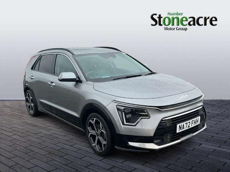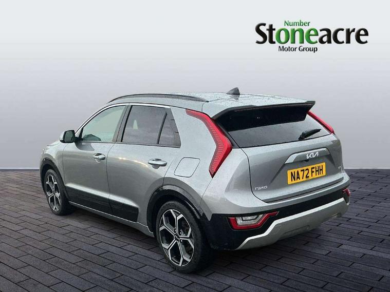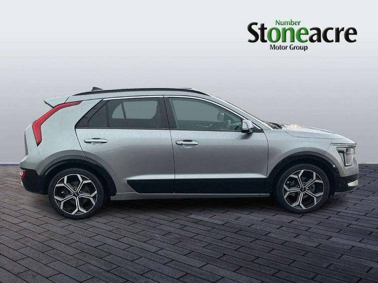 10.25" Supervision colour cluster display, 10.25" touchscreen satellite navigation, Adaptive smart cruise control function (SCC) with stop and go, Apple car play/Android Auto with voice control, Blind spot collision avoidance assist, Drive mode select (Eco, sport), E-call, Emergency stop signalling system, Forward Collision-Avoidance Assist (FCA) 1.5 - City/Pedestrian/Cyclist/Junction turning, Front parking sensors, Head up Display, Highway Driving Assist (HDA), Kia Connect (UVO), Lane Following Assist (LFA), Lane keep assist, Motor driven power steering, Parking collision avoidance assist (PCA), Power opening/closing tailgate, Rear cross traffic alert, Rear parking sensors, Remote smart parking assist, Reversing camera with dynamic guide lines, Safe exit warning (SEW), Speed limit assist, Trip computer with distance/fuel consumption/average speed, Wireless Smartphone charger, 220v AC Inverter, 'Shark fin' mobile antenna, 2 type C USB ports on front seats, 2 USB ports in centre console including 1 type C, 6 speakers, Bluetooth with music streaming, DAB Digital radio, Steering wheel mounted controls, Acoustic windshield, All round electric windows with drivers and front passenger auto up/down and safety function, Auto dimming rear view mirror, Automatic defog system, Automatic headlight control system, Black beltline mouldings, Black grille with chrome surround, Body colour bumpers, Body colour exterior door handles, Deluxe door scuff plates, Dual LED headlights (low and high projection), Electric heated door mirrors, Electrically folding door mirrors, Front and rear chrome skid plates, Front fog lights, Heated rear window with timer, High gloss black cladding, High gloss black door mirrors, LED daytime running lights, LED rear combination lights, LED third brake light, One touch single tilting/sliding power sunroof, Privacy glass - Rear windows and tailgate, Rain sensing front wipers, Rear fog lights, Rear side wing doors, Rear spoiler, Rear wiper, Roof rails, Solar glass windscreen, Welcome and follow-me home light functionality, Windscreen Washer Level Warning, 12V socket in front, 12V socket in luggage compartment, 3 seat bench in 2nd row, 60:40 split remote folding rear seats, All-round height adjustable headrests, Aluminium pedals, Artificial leather centre console storage box, Artificial leather steering wheel, Centre console cupholder, Chrome coating interior door handles, Driver and front passenger power adjusted seat, Driver power adjusted memory seat, Driver/passenger sunvisors with illuminated vanity mirrors, Drivers seat power lumbar support, Dual zone automatic air conditioning, Front and rear door storage, Heated front seats, Heated outer rear seats, Heated steering wheel, Illuminated glovebox, Interior door lock/unlock function, ISOFIX Child seat top tethers and anchor fixings, LED overhead console, 2nd row and luggage lamp, Luggage area load cover, Luggage board, Paddle shifts, Passenger premium relaxation seat, Power adjustable lumbar support on front passenger seat, Rear armrest, Seatback pocket - driver, Seatback pocket - front passenger, Shift by wire SBW, Single front passenger seat, Tilt/telescopic adjustable steering wheel, Vegan leather upholstery, Ventilated front seats, Ventiliation ducts to rear compartment, Towing pack - Niro, 3 point seatbelts on all seats, ABS, Automatic unlocking of doors in case of impact, Centre side front airbags, Curtain and side airbags, Drivers knee airbag, Dual shell horn, Electric parking brake with auto hold function, Electronic stability control, Front passenger airbag deactivation, Height adjustable front seatbelts, Hill start assist control (HAC), Manual rear child locks, Rear seat alert system, Traction control, Tyre pressure monitoring system, Alarm system and engine immobiliser, Deadlocks, Engine Start/Stop Button with Smart Entry System, Locking wheel nuts, Visible vehicle identification number, Warranty - 7 Years/ 100, 000 miles, Centre fascia chopped carbon, 18" Alloy wheels, Tyre mobility kit,