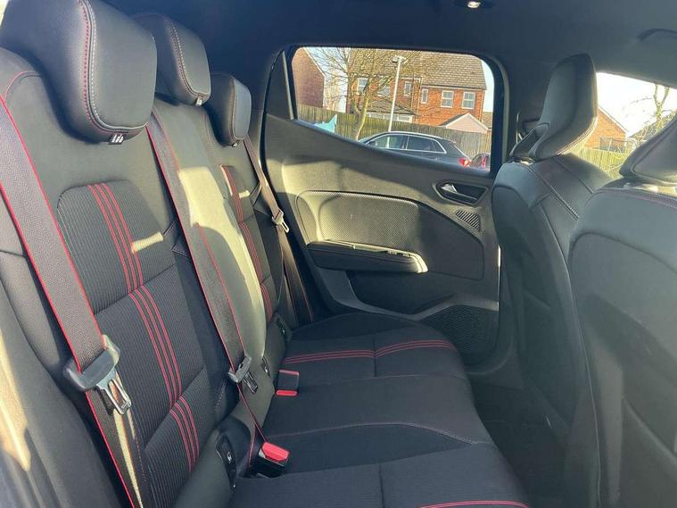10" TFT Driver information display, Apple car play/Android Auto, Cruise control + speed limiter, E-call, Easy link navigation with 9.3" touchscreen+4x20W amplifier+FM DAB double tuner, sound auditorium, 2xUSB/1xjack/bluetooth, smartphone integration plus, Eco mode driving function, Front parking sensors, Gear change indicator, Lane departure warning system, Lane keep assist, Over speed prevention, Rear parking sensors, Rear view camera, Traffic sign recognition, Trip computer, Variable assistance electric PAS, Wireless phone charger, Auto dimming rear view mirror, Auto light control and rain sensing wiper, Automatic headlights, Body colour door handles, Body colour door mirrors, Body coloured bumpers, Body coloured rear spoiler, Chrome exhaust tailpipe, Chrome front grille, Chrome side window surrounds, Drivers one touch window with anti-pinch feature, Electric adjustable heated door mirrors, Electric front windows, Electric rear windows, Exterior rear hidden door handles, Extra tinted glass on rear windows + tailgate, Full C-shape LED front and rear signature lighting, Full LED front and rear headlamps integrating daytime running lights at the front and rear, Gun Metal insert on lower side doors with Clio embossing, LED front fog lights, LED Roof light, LED third brake light, Rear fog lights, Rear side wing doors, Rear wiper, RS Line badging, RS Line exterior styling, RS Line sports front bumper, RS Line sports lower grill, RS marker chrome gun metal grey sport rear bumper with chrome oval exhaust pipe, Shark fin antenna, Variable speed on front windscreen wipers, Wing Mirror design - non-body coloured, 12V Accessory socket, 3 rear height adjustable headrests, 3 seat bench in 2nd row, 6.2L front glovebox, 60/40 split and fixed base rear seat bench, Air recirculation control, Auto climate control, Black headlining, Dark roof lining and aluminimum pedal set, Driver's seat height adjustment, Front cupholders, Front decor strip in red, Front door storage bin, Height adjustable front headrests, Height/reach adjust steering wheel, Isofix system on outer rear seats, Luggage nets in boot, Multi function steering wheel, Multisense including ambient lighting and selectable drive modes, Pollen filter, RS branded top grain leather steering wheel, RS Line cloth upholstery, RS Line Interior trim including airvent stripe and gearshifter in red, Single front passenger seat, System for Restraint and Protection SRP-front seats, 3 point seatbelts on all rear seats, ABS+EBA, Active emergency braking system, Curtain airbags, Distance warning alert, Driver and passenger front and side airbag deactivation, Driver/Front Passenger airbags, Electronic parking brake with auto hold, ESC - Electronic Stability Control + traction control, Front side airbags(head+thorax), Height adjustable driver's seatbelt, Hill start assist, Seatbelt warning, Tyre pressure warning, Central door locking, Deadlocking system, Hands free key card with push button, start and stop function, Locking fuel filler cap, RAID (Renault Anti-Intruder Device) with automatic door locking, Rear side wing door and window child locking function (front driver door control panel), Remote central locking with thatcham approved immobiliser, Black side panel personalisation with contouring, 17" RS diamond cut alloy wheels,
