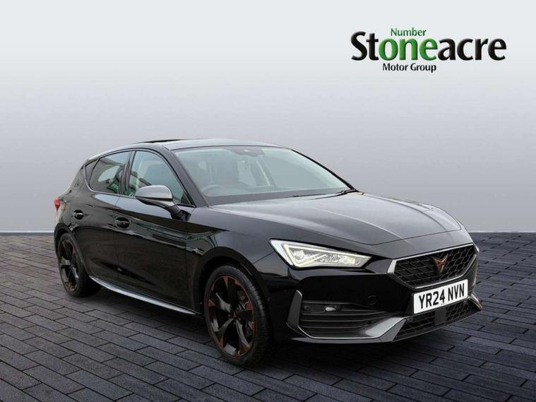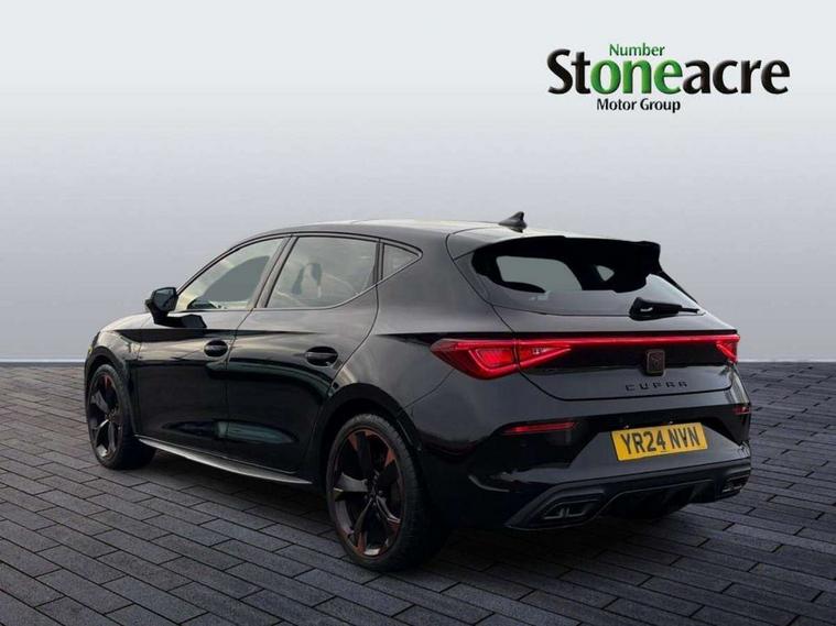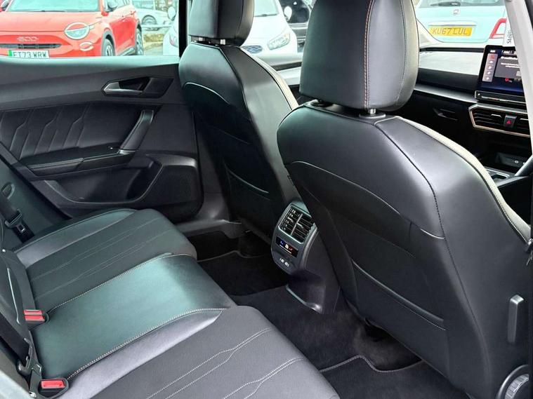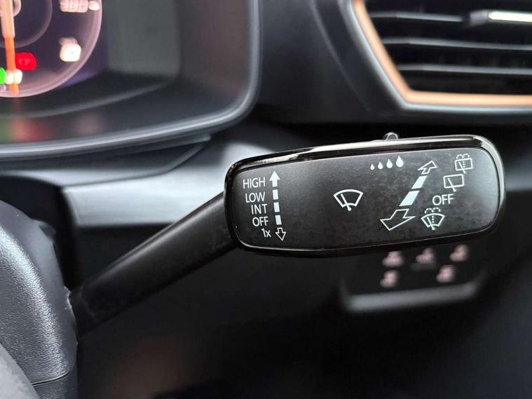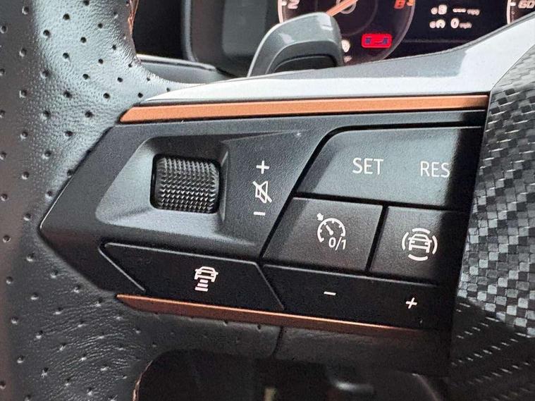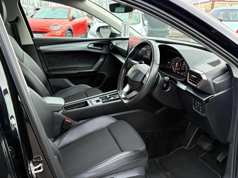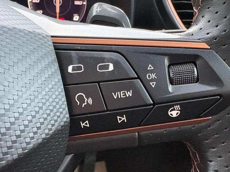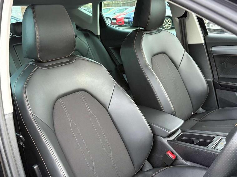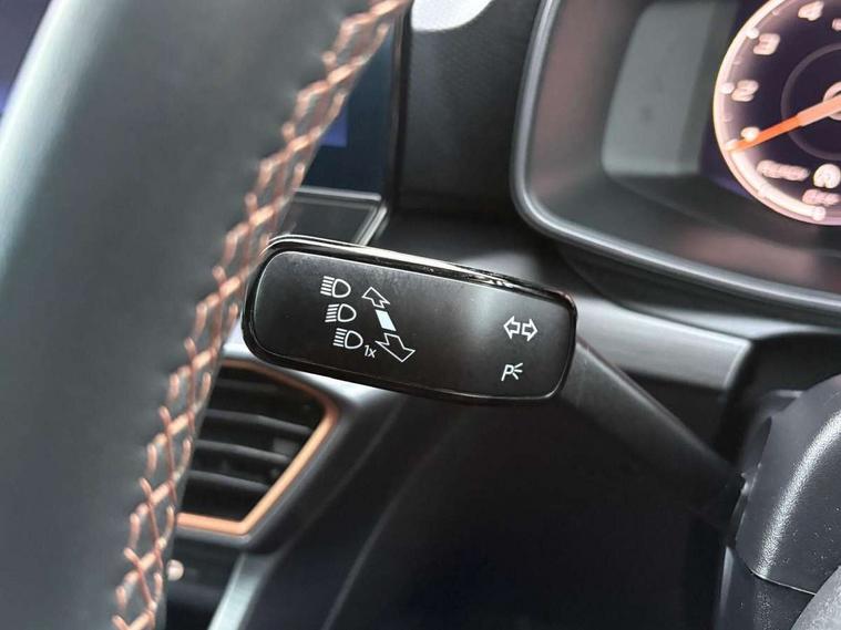 CUPRA drive profile selection with 4 modes (Comfort/Cupra/Sport/Individual), throttle response and gearshift mode, Digital cockpit, E-call, Electro mechanical speed sensitive power steering, Front assist with forward collision warning braking reaction to vehicles, pedestrians and cyclists, Full link smartphone integration with Mirror Link, wireless Apple CarPlay and wired Google Android Auto, Lane assist, Lockable tailgate, Park assist (inc front/rear parking sensors), Rear view camera, RPM, trip computer, outside temp gauge, instrument light brightness, low fuel warning light, lights on reminder, gearshift indicator, Service interval indicator, Start/stop system with regenerative braking, Wireless phone charger, Sports suspension, Auxiliary input socket, Auto dimming rear view mirror, Body colour door handles, Body coloured bumpers, Cupra sports bumpers, Dark tinted rear windows, Electric front/rear windows, Electrically adjustable, heated and folding door mirrors, LED front fog lamps with cornering function, LED headlights with dynamic turn signals, tail lights, rear fog lights with rear coast to coast lighting, Panoramic sunroof, Rain sensing wipers, Rear diffuser with twin exhaust pipe on each side, Rear side wing doors, Rear wash/wipe, Separate daytime running light with automatic headlight control and coming home feature, Third brake light, 12v power supply in centre console, 3 seat bench in 2nd row, 5 headrests, 60/40 split rear bench seat with armrest, Ambient lighting with glovebox, footwell and single monocolour, CUPRA Leather flat bottomed, heated, perforated steering and gearshift paddles, Driver/passenger manual seat height adjustment, Folding boot cover, Four x USB Type C ports (2 in front and 2 in rear), Front and rear reading lights X 4, Front centre armrest, Front seats manual lumbar adjustment, Grey headlining, Height/reach adjust steering wheel, Illuminated interior front door sills, ISOFIX points in outer rear seats with top tether anchorage points, Jack and tool kit, PVC/Cloth upholstery with copper stitching, Single front passenger seat, Sports seats, Storage pockets on rear of front seats, Sunvisors with illuminated mirror, Three zone climate control, Design pack - Cupra Leon, Media system plus with navigation pack - Leon Cupra, Safety and driving pack (M) - Cupra leon, 3 point seatbelts on all rear seats, ABS, Brake control system - ESC and brake booster, Child proof door locks, Cupra black brake calipers, Driver and front passenger airbags with front passenger airbag de-activation, front side and curtain airbags, Electronic parking brake, Extended safety system - seat belt tensioner, window closure and hazard lights, Hill hold control, Rear disc brakes, Seat belt reminder for front and rear seats, Tiredness recognition system, Tyre pressure monitoring system, Anti theft alarm system with interior monitoring in cab, backup horn and towing protection, KESSY Advanced - Keyless start, keyless entry, Locking wheel bolts, Chrome and copper interior detailing, 18" Machined sport black and copper alloy wheels with 92Y sport tyres,