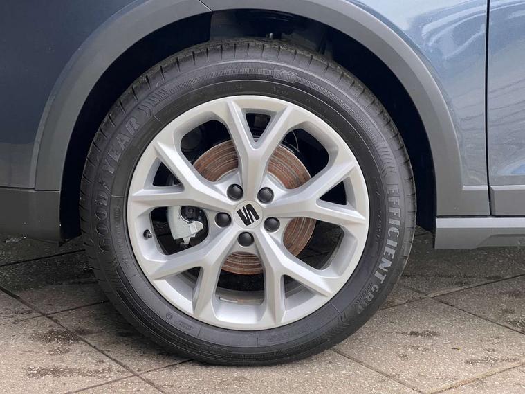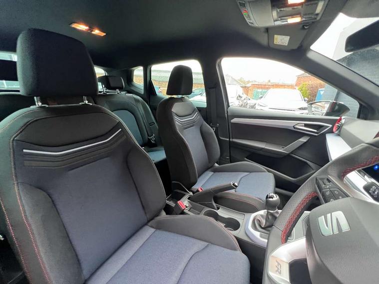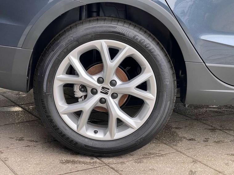 'Lights On' Reminder warning buzzer, 8" Digital cockpit, Digital clock, E-call, Electric speed sensitive power steering, Full link smartphone integration with mirror link, wireless apple carplay, Google android auto + USB Type C cable for apple and android devices, Lane keeping system, Low fuel warning light, Outside temperature display, RPM counter, SEAT Drive profile - Four different models normal-sport-eco-individual, steering response, throttle response, Trip computer, Wireless phone charger, 6 speakers, 9.2" colour touchscreen with navigation system, voice control and USB port (type c), Bluetooth interface for hands free and audio streaming, DAB digital radio and AM/FM radio, Steering wheel mounted audio controls, Anti theft roof antenna, Auto dimming interior rear view mirror, Automatic activation of hazard warning lights, Body coloured bumpers, Body coloured door handle inserts, Chrome roof rails and window surrounds, Dark tinted rear windows, Electric front/rear windows, Electrically adjustable, heated and folding door mirrors, Front fog lights with cornering function and rear fog light, FULL LED automatic headlights with dynamic headlight range control, coming and leaving home, LED daytime running lights, LED rear tail lights and licence plate lights, Protective side mouldings, Rain sensing wipers, Rear side wing doors, Rear spoiler, Rear window wash/wipe, Roof colour door mirrors, Third brake light, Twin exhaust pipe styling hidden exhaust pipe, Visible VIN plate, 2 cupholders, 3 seat bench in 2nd row, 60/40 split folding rear seat, Aircare filter, Black interior roof, Cloth upholstery, Double boot floor, Driver sunvisor with covered mirror + card holder, Dual zone climate control, Front courtesy light with front reading lights, Gear shift indicator, Height adjustable front seats, Height/reach adjustable steering column, Illuminated air vent surrounds, Illuminated boot, Instrument lighting with brightness control, Interior ambient lighting, Interior light in footwell, central console and door panel, ISOFIX points in outer rear seats with top tether anchorage points, Passenger sunvisor with vanity mirror, Perforated flat bottomed leather steering wheel/gear knob/handbrake with red stitching and FR logo, Potentiometer, Single front passenger seat, Two front and three rear height adjustable headrests, Interior chrome pack - Arona, Safe and driving pack (S) - Arona, 3 point seatbelts on all rear seats, ABS, Active front headrests, Child locks on rear doors, Driver and front passenger airbags with front passenger airbag de activation, front side and curtain airbags, Emergency Brake Assist (EBA) and front assist, Front and rear seatbelt reminder, Hill hold control, Multi-Collision braking, Tiredness recognition system, Traction control, Tyre pressure monitoring system, Alarm with back up horn with tow away protection, Deadlock, Electronic engine immobiliser, Locking wheel bolts, Remote central locking, Titan black dashboard, 17" Dynamic alloy wheels,