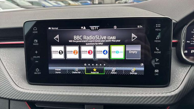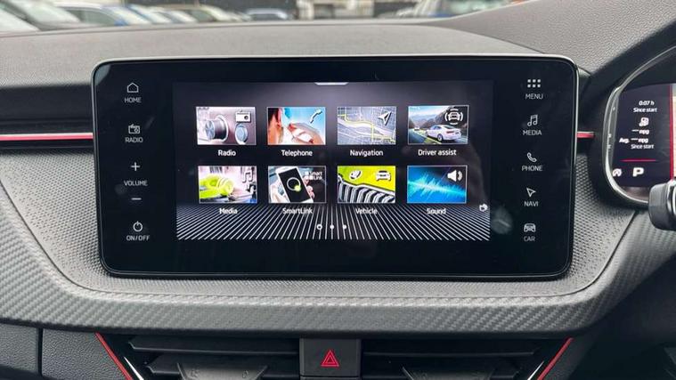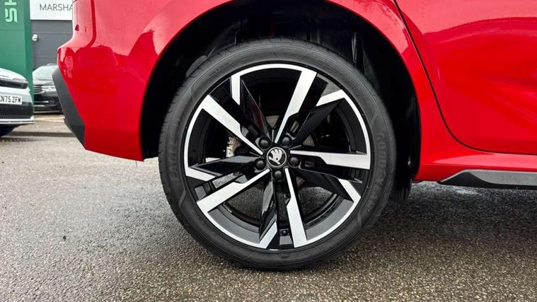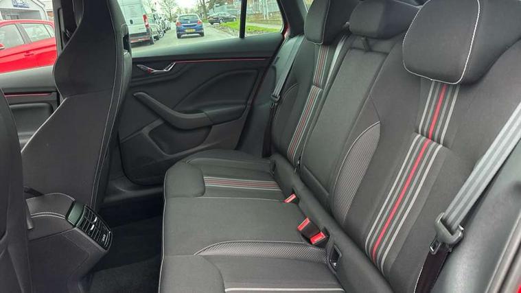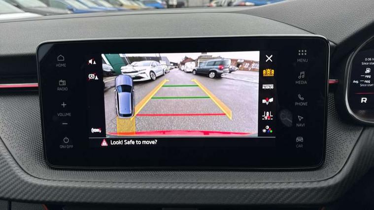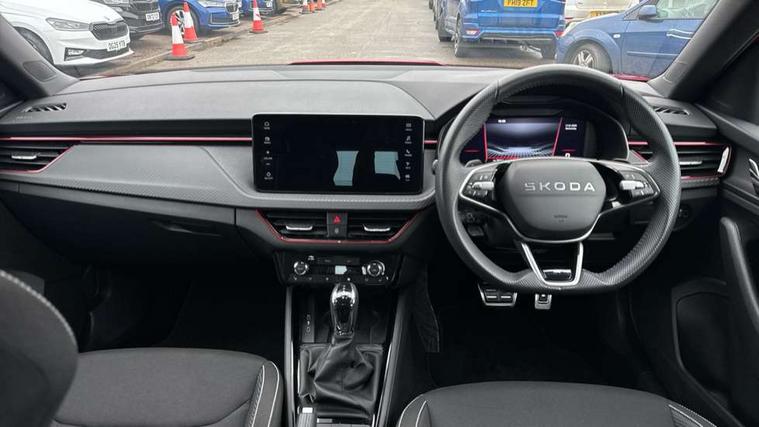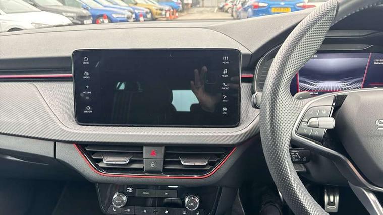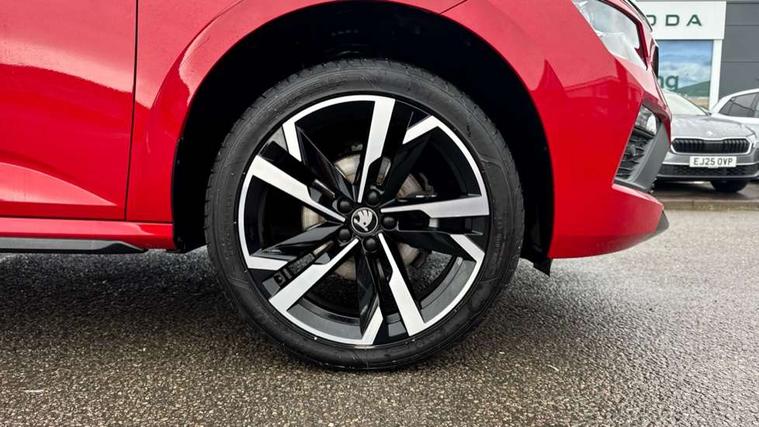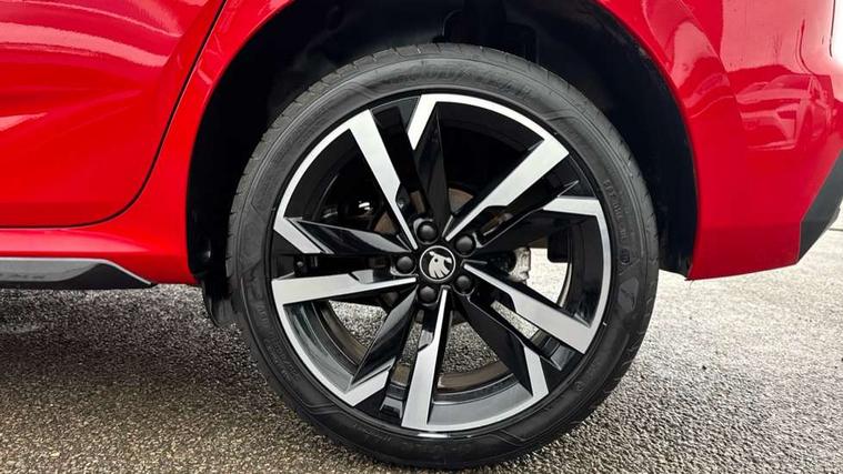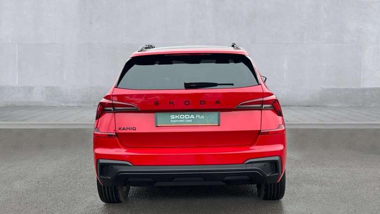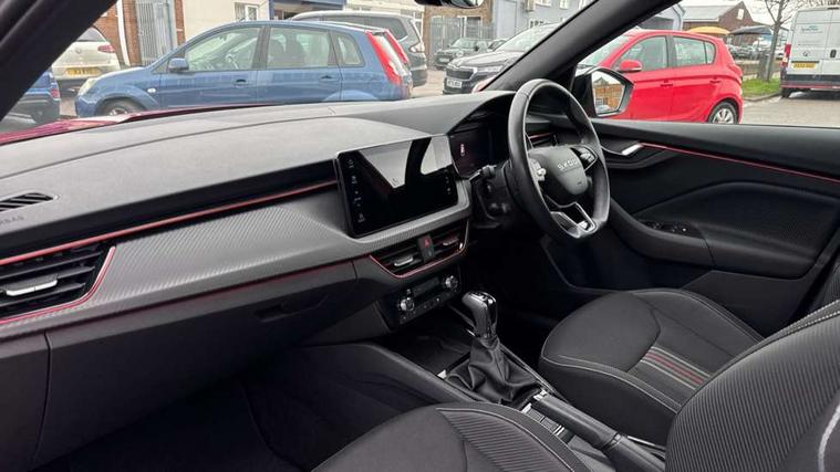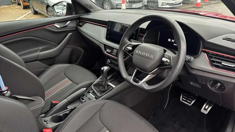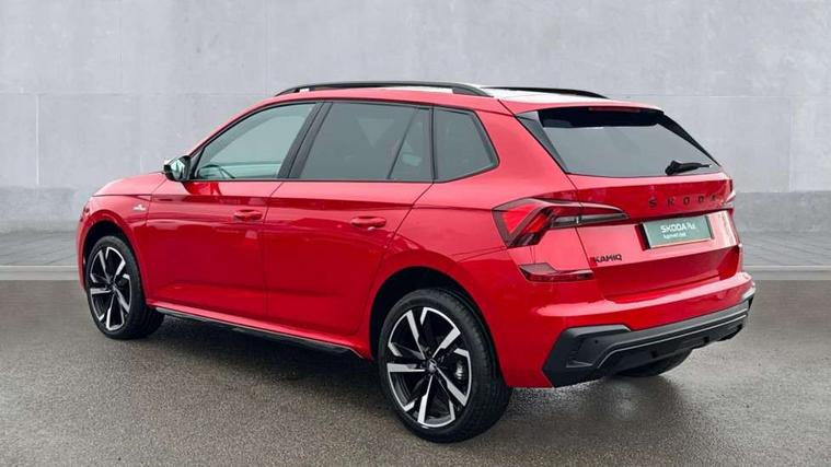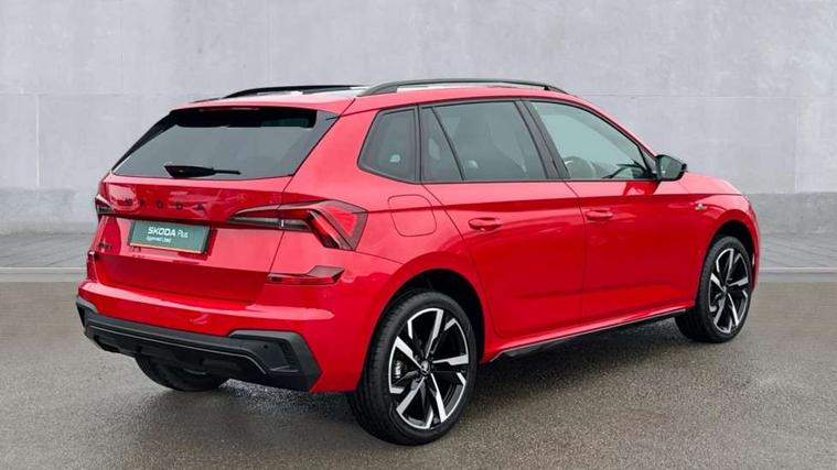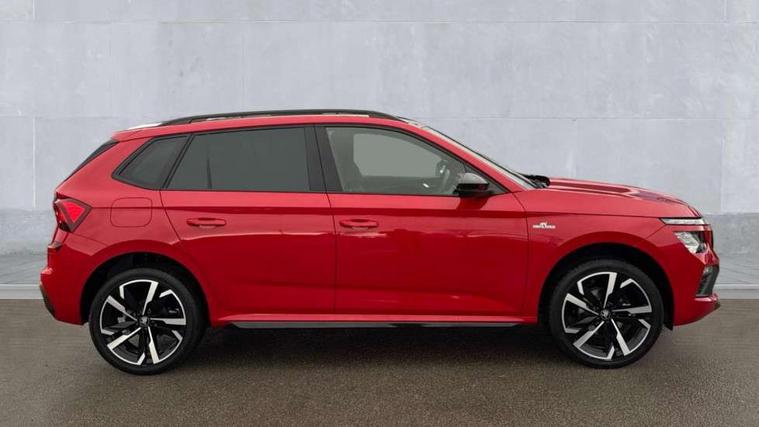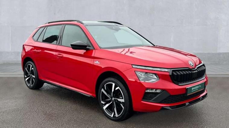 Advanced driver attention and drowsiness monitor, Bluetooth system, E-call, Front assist system, PAS, Rear parking sensors, Rear view camera, Service indicator, Speed limiter, Traffic sign recognition, Virtual cockpit with 10.25" display, Voice control system, Wireless smartlink, 4 USB C ports, 8 Speakers, 9.2" Skoda navigation display, DAB Digital radio, Auto dimming rear view mirror, Automatic headlight control with coming home and leaving home feature, Black door mirrors, Black radiator grille, Black rear diffuser, Black roof spoiler, Body colour bumpers, Body colour door handles, Boot lettering in black, Extended tailgate glass, Fixed panoramic sunroof with black roof rails, Front and rear electric windows, Heated rear window, LED daytime running lights, LED high beam, LED low beam, LED third brake light, Light sensors, Monte carlo plaque, Privacy glass, Rear side wing doors, Rear wiper, Ticket holder inside windscreen, 12V socket in luggage compartment, 3 seat bench in 2nd row, Aluminium pedals, Ambient lighting in white/red, Art leather carbon decor inserts, Art leather carbon door inserts, Black roof lining, Cargo elements, Chrome inner door handles, Driver and passenger sun visors with vanity mirror, Dual zone climate control, Front and rear roof lights, Front centre armrest, Front head restraints, Glove compartment with illumination, Height adjustable driver seat, Height adjustable front passenger seat, Ice scraper, Inner circulation control with pollen filter, ISOFIX on front passenger seat, Isofix preparation for back seats, Leather gearknob and handbrake lever, Manual lumbar support for front seats, Monte Carlo cloth upholstery, Net package and top tether hooks in boot space, Net under rear shelf, Pocket on the back of both front seats include mobile phone pockets, Rake/reach adjustable steering wheel, Reading lights, Rear centre armrests, Red hotstamping, Single front passenger seat, Sports seats, Textile floor mats, Third rear headrest, Top tether for front passenger seat, Umbrella in driver's door, Light and view plus package - Kamiq, 3x3 point rear seatbelts, Airbags - driver and front passenger, Disc brakes, ESP, Extended and predictive pedestrian/cyclist protection, Front passenger airbag deactivation switch, Front side airbags with curtain airbags, Hill hold control, Manual leather parking brake, Manual rear child locks, One tone horn, Seatbelt reminder for driver an co-driver, Traction control, Tyre pressure monitor, Anti-theft alarm system with interior monitoring, backup horn, towing protection and remote central locking with SAFE system, Anti-theft wheel bolts, Electronic engine immobilizer, 18" Ursa black diamond cut alloy wheels,