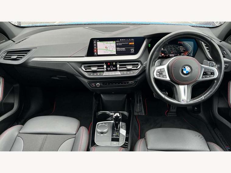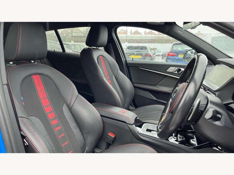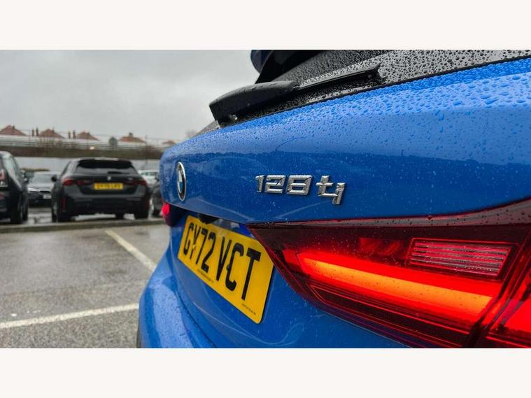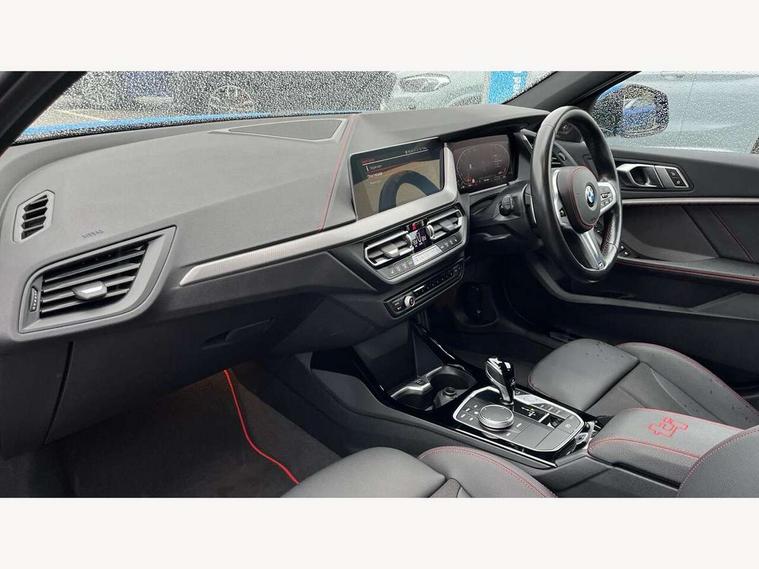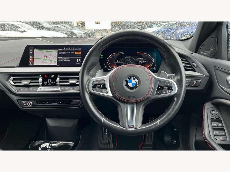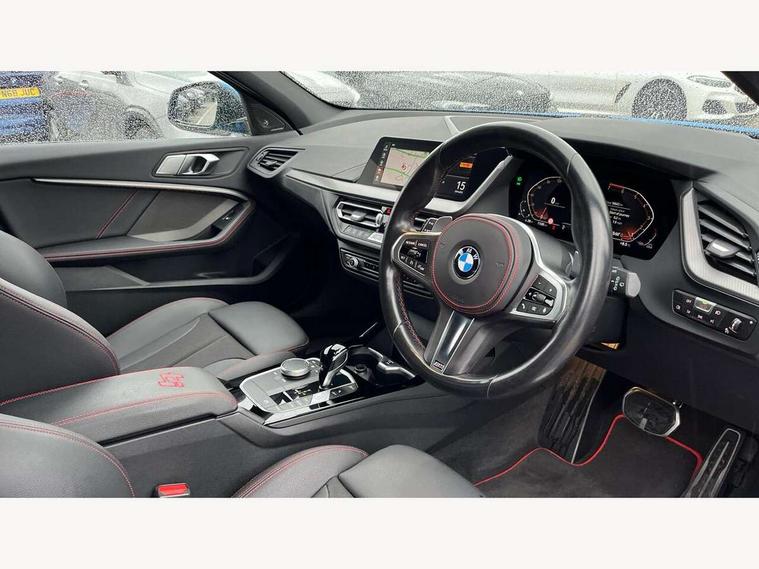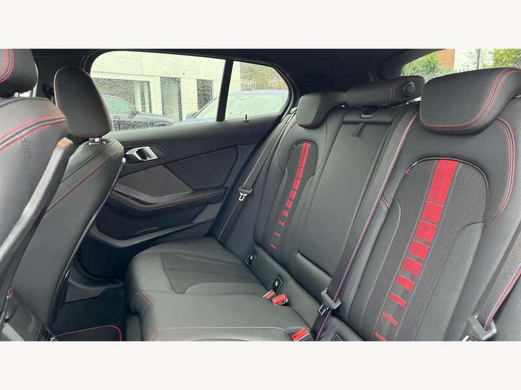 Active guard plus, Attentiveness assist, BMW ConnectedDrive online services, BMW Teleservices, Check Control warning system for monitoring of lights and door/luggage compartment open warning, Cruise control with brake assist, Eco pro mode, Electric power steering with Servotronic steering optimised at all speed ranges, Front axle single joint with specific axle kinematics to minimise drive influences on steering + provide increased rigidity agile driving behaviour, Integrated owners handbook, Lane departure warning system, Oil sensor for level and grade, On board computer, Optimum shift indicator, Personal Profile, Pull away assistant, Rigidly mounted rear subframe - Multi link construction with separate spring / damper configuration and excellent driving characteristics, Speed limit Info including no-overtaking indicator, Speed limiter, Aluminium lightweight construction, Anti roll bar front and rear, Balancer shaft, Double VANOS twin scroll turbocharging system, Drive Performance Control, Eight speed sport automatic transmission with gearshift paddle switches, Electronic differential lock, High precision injection, Larger fuel tank capacity (50 litres), M sport suspension with M128i xDrive specific settings, Petrol Particulate Filter, Twin tube gas filled shock absorbers with degressive characteristic curve, VALVETRONIC engine management, DAB Digital radio, Auto dimming rear view mirror, Automatic headlight beam throw control, Automatic windscreen wipers and automatic headlight, Black chrome tailpipe finishers, BMW individual high gloss shadow line with extended content, Body colour door handles, Body colour mirror caps, Body colour roof trims, Chrome 'M' logo side designation, Chrome kidney grille frame with Satin Aluminium struts, Direction indicator side lights in exterior mirrors, Fading support, Folding side mirrors with auto dimming/folding wing mirrors with auto dimming, Follow me home headlights, Front and rear bumper system with replaceable deformation elements, Front and rear electric windows with open and close fingertip control, anti trap facility and comfort closing, Front door sill finishers in black plastic with M designation in metallic look, Green tinted heat protection glazing, Heated, electrically adjustable exterior mirror aspheric on driver side, convex on passenger side, High gloss shadowline window frame, Recess cover mirror frames and B/C pillar embelisher trim, High level third brake light, Integrated front windscreen with washer jets, Kidney frame and struts in high gloss black extended, LED daytime running lights, LED eyebrow turn indicators, LED front fog lights, LED Headlights, Lightweight engineering, Matt black air guide grilles, Matt black wheel arch trim, Model designation on electric bootlid, Nearside reverse light in rear light cluster, Preparation for high beam assistant, Rear fog lights, Rear side wing doors, Rear window wiper, Shark fin antenna, Trailer stabilisation logic, Visible VIN plate, Welcome lighting, 12V power socket in front centre console with blanking plug, 3 rear seat head restraints, 3 seat bench in 2nd row, Anthracite headlining, Black boot net with lashing eyes, Cargo function on 2nd seat row, Centre armrest in black/red highlight including embroidered 'ti' designation in red, Child seat ISOFIX attachment for two outer rear seats and front passenger seat with anchorage points, Conditioned based service, Driver and front passenger seat heating, Floor mats with red binding, Folding rear clothes hook, Four grab handles integrated in roof lining, Front and rear door pockets with bottle holders, Front and rear side armrest integrated into door trim, Front armrest, Front sports seats, Glove compartment, Height adjustable front head restraints, Instrument panel top section , door armrests and door panels in black/red highlight, Luggage compartment for bag hooks on left and right, foldable luggage compartment liner and four lashing eyelets, Manual adjust steering wheel, Multi-function controls for steering wheel, Single front passenger seat, Storage compartment in centre console, Sun visors with vanity mirrors and insert tab, Three spoke M sport design multi function leather steering wheel in unique red stitching, Two front centre console cupholders, Two zone automatic air conditioning, Additional interior lighting pack - 1 Series, BMW live cockpit professional pack- 1 Series, Connected pack professional - 1 Series, Interior lights pack - 1 Series, M Sport exterior styling aerodynamics pack - 1 Series, 2 tone horn, 3 point seatbelts on all seats, front pyrotechnic belt tensioners, stopper and belt force limiters, rear coded belt buckles, Airbags - Front driver/passenger, front and rear curtain head protection, front side, manual deactivation of front passenger airbag, Anti lock braking system (ABS) with brake assist, BMW emergency call, Brake drying, Braking readiness, Child proof locking system in rear door, City braking function, Comfort modes, Cornering brake control, Crash sensor activating central locking release, hazard warning lights, fuel cut off, interior lighting + activation of safety battery terminal clamp, Driver and front passenger seat belt security check, Dynamic stability control + (DSC+), Dynamic Traction Control - DTC, Electrically operated hand brake including automatic hold function, Front and rear disc brakes, M Sport brakes with red calipers, M Sport seatbelts, Seatbelt warning, Side impact protection, Tyre pressure monitoring system, Warning triangle and first aid kit, Central locking switch for all doors, fuel filler cap and luggage compartment, Deadlocking function system to all doors, Drive away locking system on all doors and luggage compartment with de-activated in iDrive settings, Locking wheel bolts, Remote control with integrated key with High-gloss Black inlay and M designation and 1 button for open/ close lock, window, open luggage compartment, Start/stop button illuminated in centre console with keyless e