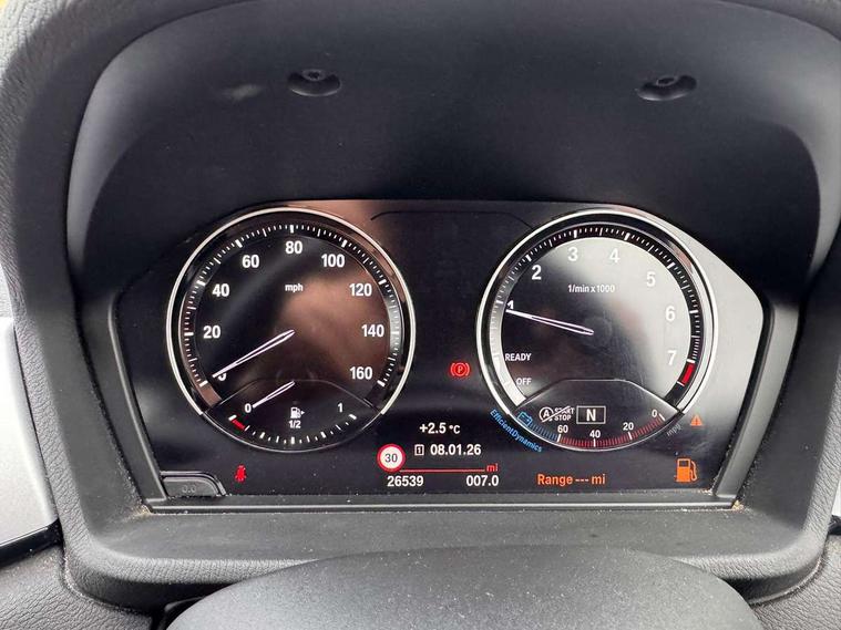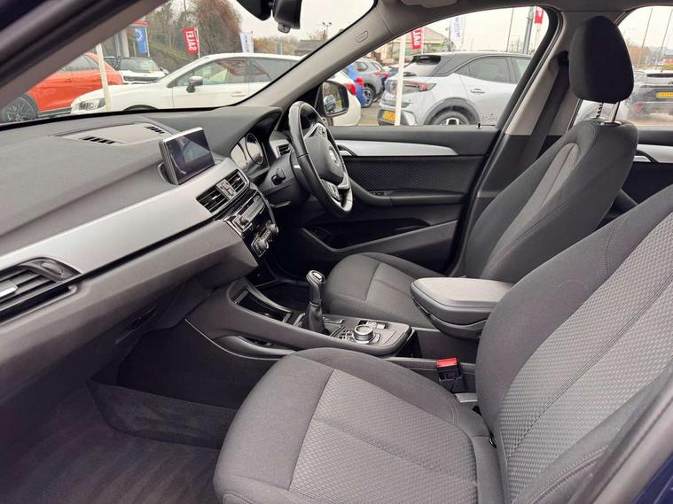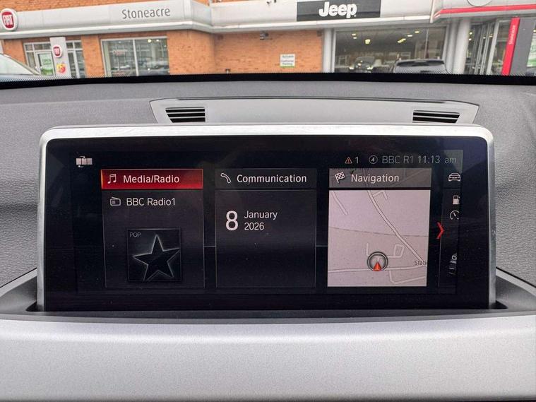 Active Guard incl speed limiting and lane departure functions with auto steering, and front collision warning with brake intervention, Ambient temperature display, Apple CarPlay, Arrow pointers, north up, direction of travel and perspective map displays, Attentiveness assist, Automatic tailgate opening, BMW ConnectedDrive, BMW Online services, BMW remote services, BMW Teleservices, Brake pad wear indicator in front and rear, Characteristic map controlled oil pump system, Cruise control with brake assist, Front axle single joint with specific axle kinematics to minimise drive influences on steering + provide increased rigidity agile driving behaviour, Front/rear park distance control (PDC), Instrument cluster with Black optic display featuring superimposed dials and 5.7" colour display, Instrument cluster with speedometer with miles per hour read out, tachometer and fuel gauge, Integrated hard drive with map data updates via USB interface, Lights on warning by audio warning signal when ignition is switched off, On board computer, Operation by iDrive with direct selection buttons and 8 programmable buttons, Optimum shift indicator, Outside temperature gauge, Park assist system, Personal Profile - automatic lock when driving away selectable, Real time traffic information, Rigidly mounted rear subframe - Multi link construction with separate spring / damper configuration and excellent driving characteristics, Service interval indicator, Servotronic PAS, Tyre puncture warning system, 12V compressor with integrated sealant injection bottle and hose, Aluminium lightweight construction including crankcase, Anti-roll bars, Balancer shaft, Double VANOS, Drive performance control with ECO PRO comfort + sport mode, High precision injection, Performance Control, Standard suspension, Stop/start function, Turbocharger with Valvetronic, Twin tube gas filled shock absorbers with degressive characteristic curve, BMW professional radio includes amplifier power 100w, Two mide range speakers in door trims and two woofers as central bass speaker under front seats, DAB Digital radio, Adjustable headlights, Aero curtain, Automatically dimming rear view mirror, Black roof rails, BMW Icon design LED daytime driving lights, Body colour bumpers, Body colour door handles, Body colour door mirrors, Direction indicator side lights integrated exterior mirrors, Dynamic brake lights, Electric windows - front and rear, with open/close fingertip control, anti-trap facility and comfort closing, Electrically adjustable door mirrors with aspheric on driver side, convex on passenger side with integrated indicators, Follow me home headlights, Front air guide finished in black silver, Front and rear bumper system, Green tinted heat protection glazing glass, Headlight beam throw control, Heated door mirrors, Heated windscreen washer jets, High level third brake light, Kidney grille with 14 chrome black vertical bars, LED direction indicator lights in headlight eyebrow, LED front fog lights, Lightweight engineering, Model designation, Rain sensor including auto headlights activation, Rear fog lights, Rear window aerial, Rear window wash/wipe, Reversing light in rear light cluster, Roof mouldings in matt black, Shark fin antenna, Sill cover finished matt black, Single chrome exhaust tailpipe, Two eye face design on light, Visible VIN plate, Welcome lighting, 12v power point in centre console, 2 cup holders in front, 3 rear headrests, 3 spoke sport leather steering wheel, 40:20:40 split folding rear bench seat, Black door sill finishers with BMW designation, Boot light, Centre armrest in 20 degree part rear seat backrest, Child seat ISOFIX attachment for two outer rear seats and front passenger seat with anchorage points, Conditioned based service, Driver/front passenger seat backrest back with luggage net, Dual zone automatic air conditioning, Four grab handles integrated in roof linings, Front and rear side armrests integrated into door trim, Front centre armrest/sliding cover, Front centre interior light over interior mirror and rear centre automatic interior light when door is opened/ignition switched off or via remote key, Front standard seats, Front/rear adjustable head restraints, Illuminated glovebox, Leather gearknob/gaiter/handbrake grip, Luggage area underfloor compartment, Luggage compartment access via recessed handle below tailgate, Luggage compartment lighting, Manually adjustment steering wheel column, Multifunction steering wheel, Rear coded belt buckles, Standing free front adjustable armrest and fixed in different positions, Velour floor carpets, Extended storage package - X1, ABS/EBD, Audio/visual collision warning system, Automatic Stability Control (ASC), Battery safety cut-off, BMW emergency call, Brake drying, Brake energy regeneration, Braking readiness, Collision mitigation braking system, Cornering brake control (CBC), Crash Sensor - activates hazard/interior lighting + unlocks doors, Driver/Front Passenger airbags, Driver/front passenger side airbags, Dynamic brake control, Dynamic stability control + (DSC+), Dynamic Traction Control - DTC, Electronic differential lock control (EDLC), Electronic parking brake, Front and rear head airbags, Front passenger airbag deactivation, Front seatbelt force limiters, Front ventilated disc brakes, Hill start assist, Pyrotechnically pre-tensioned front seatbelts, Rear disc brakes, Rear door child safety locks, Seatbelt security check for driver and front passenger, Side impact protection, Three point seat belts in all seats, Twin horns, Tyre pressure monitor, Warning triangle and first aid kit, Central locking switch for all doors, fuel filler cap and luggage compartment, Check control system for monitoring of lights and door/luggage compartment open warning, Engine immobiliser, Locking wheel bolts, Remote control Thatcham category 1 alarm, Remote control with integrated two key, Start/stop button with comfort go keyless engine start and auto start stop deactivation bu