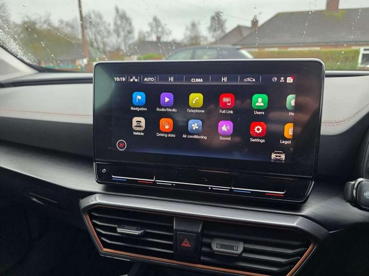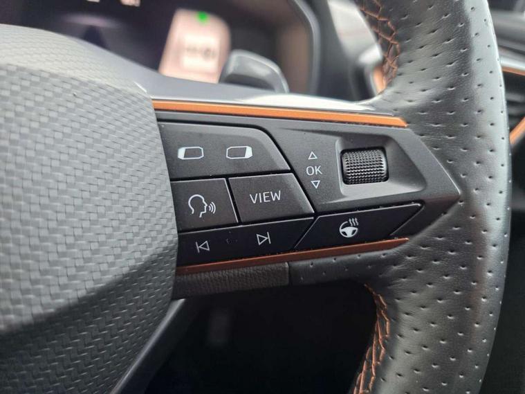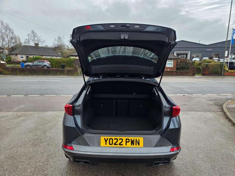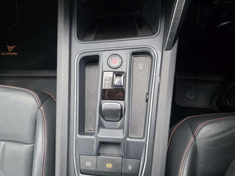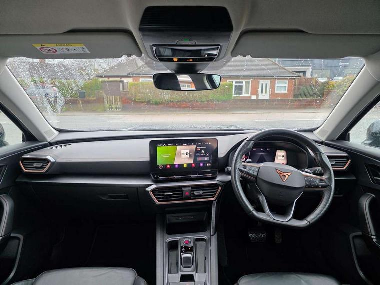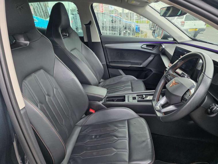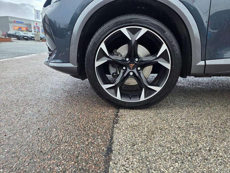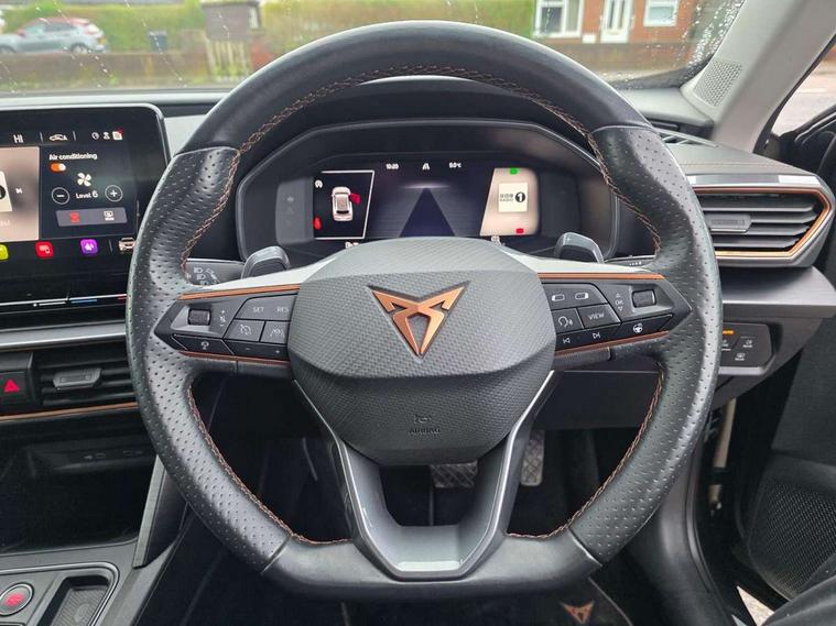Digital cockpit and configurable dashboard, Driver alert system, Driving profile selection, E-call, Forward collision warning with automatic braking, Lane assist, Park assist (inc front/rear parking sensors), PAS, Predictive adaptive cruise control with speed limiter, Rear view camera, RPM, trip computer, outside temp gauge, instrument light brightness, low fuel warning light, lights on reminder, gearshift indicator, Service interval indicator, Start/stop system with regenerative braking, Wireless apple carplay, Wireless phone charger, Electronic locking differential and dynamic traction support, Standard suspension, 2 front and 2 rear USB type C sockets, Auxiliary input socket, DAB radio, Auto dimming rear view mirror, Body colour door handles, Body coloured bumpers, Dark grey wing mirror, Daytime running light with automatic headlight control and coming home feature, Dynamic headlight range control, Electric front/rear windows, Electrically adjustable heated and folding door mirrors with memory function, Front fog lamps with cornering function, Gloss black roof rails and window surrounds, LED Headlights, LED Taillights with dynamic indicator, Rain sensing wipers, Rear diffuser with black simulated exhaust pipes, Rear side wing doors, Rear wash/wipe, Third brake light, Tinted rear windows, Welcome lights, 12v power supply in centre console, 12V socket, 12v socket in loadspace, 2 front and 2 rear reading lights, 230V socket, 3 seat bench in 2nd row, 60/40 split rear bench seat with armrest and mechanical seat release, Dust/pollen filter, Front and rear head restraints, Front centre armrest, Height/reach adjust steering wheel, Illuminated interior front door sills, Illuminated sunvisor with mirror, Isofix, Leather multi function heated steering wheel with gear shift paddles, Luggage tie-down hooks, Single front passenger seat, Three zone climate control with control panel in rear, Variable luggage/load compartment floor, Wraparound lighting, Genuine Nappa leather Pack - Cupra, Navigation system pack with 10" navigation system - Formentor, 3 point seatbelts on all rear seats, ABS, Brake control system - ESC and brake booster, Child proof door locks, Driver and front passenger airbags with front passenger airbag de-activation, Electronic parking brake, Front and rear disc brakes, Front side curtain airbags, Hill hold control, Seat belt reminder for front and rear seats, Tyre pressure monitoring system, Anti theft alarm system, Keyless entry and start system (KESSY), Locking wheel bolts, Copper and aluminium interior detailing, 19" 'Exclusive' machined sport matte black and silver alloy wheels,