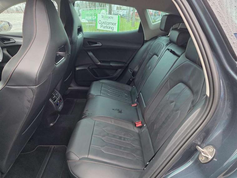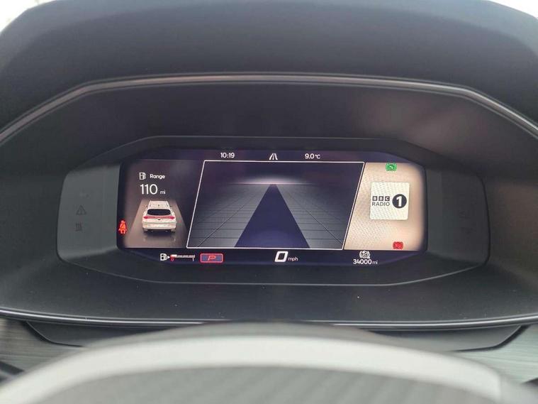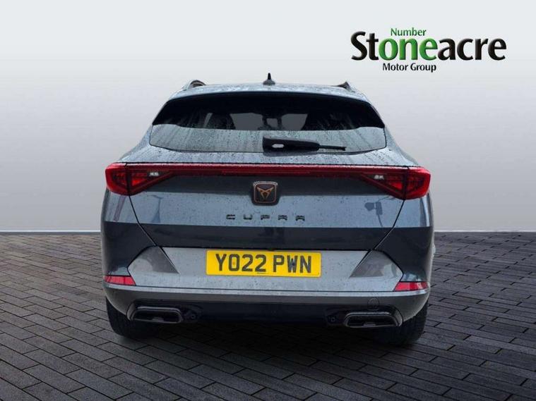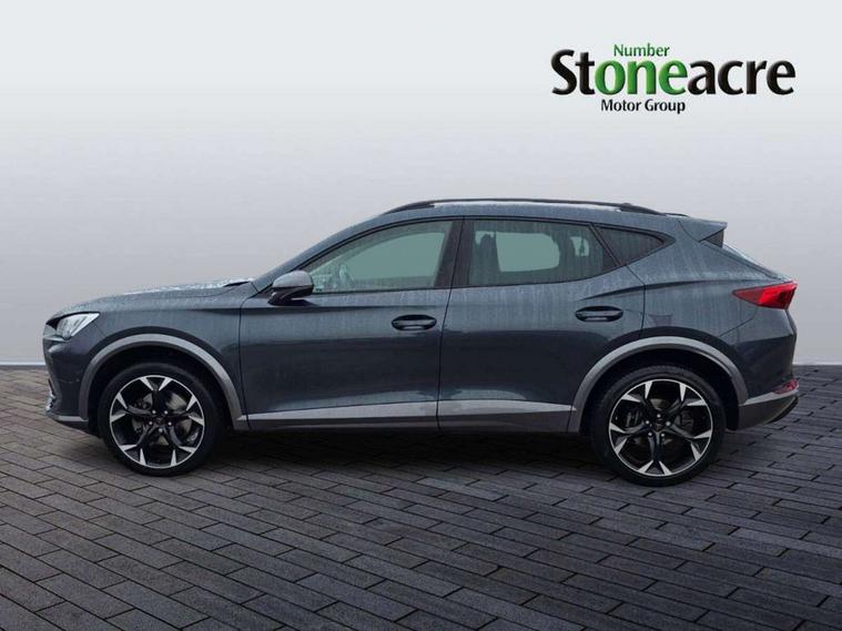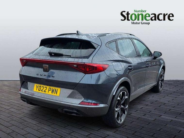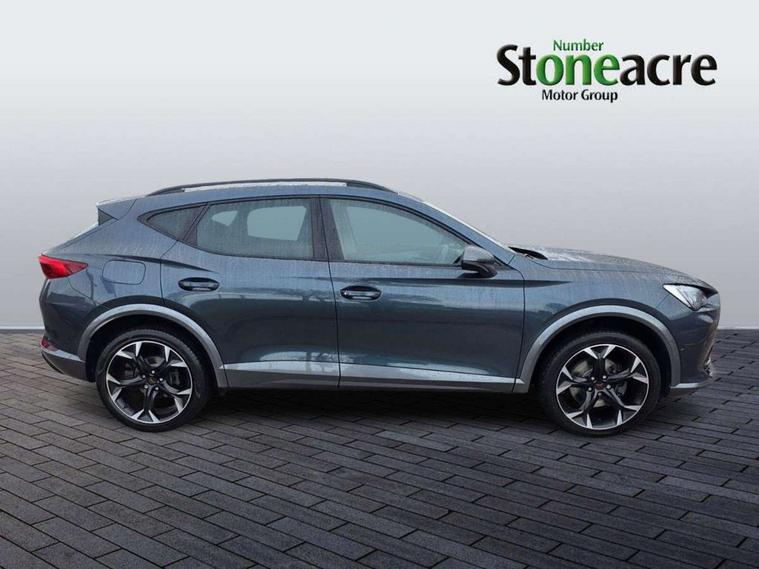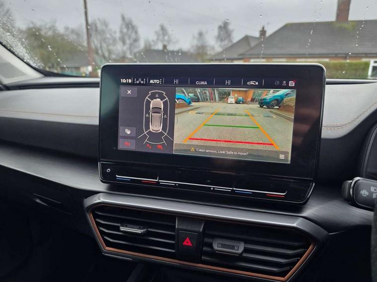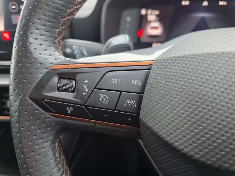 Digital cockpit and configurable dashboard, Driver alert system, Driving profile selection, E-call, Forward collision warning with automatic braking, Lane assist, Park assist (inc front/rear parking sensors), PAS, Predictive adaptive cruise control with speed limiter, Rear view camera, RPM, trip computer, outside temp gauge, instrument light brightness, low fuel warning light, lights on reminder, gearshift indicator, Service interval indicator, Start/stop system with regenerative braking, Wireless apple carplay, Wireless phone charger, Electronic locking differential and dynamic traction support, Standard suspension, 2 front and 2 rear USB type C sockets, Auxiliary input socket, DAB radio, Auto dimming rear view mirror, Body colour door handles, Body coloured bumpers, Dark grey wing mirror, Daytime running light with automatic headlight control and coming home feature, Dynamic headlight range control, Electric front/rear windows, Electrically adjustable heated and folding door mirrors with memory function, Front fog lamps with cornering function, Gloss black roof rails and window surrounds, LED Headlights, LED Taillights with dynamic indicator, Rain sensing wipers, Rear diffuser with black simulated exhaust pipes, Rear side wing doors, Rear wash/wipe, Third brake light, Tinted rear windows, Welcome lights, 12v power supply in centre console, 12V socket, 12v socket in loadspace, 2 front and 2 rear reading lights, 230V socket, 3 seat bench in 2nd row, 60/40 split rear bench seat with armrest and mechanical seat release, Dust/pollen filter, Front and rear head restraints, Front centre armrest, Height/reach adjust steering wheel, Illuminated interior front door sills, Illuminated sunvisor with mirror, Isofix, Leather multi function heated steering wheel with gear shift paddles, Luggage tie-down hooks, Single front passenger seat, Three zone climate control with control panel in rear, Variable luggage/load compartment floor, Wraparound lighting, Genuine Nappa leather Pack - Cupra, Navigation system pack with 10" navigation system - Formentor, 3 point seatbelts on all rear seats, ABS, Brake control system - ESC and brake booster, Child proof door locks, Driver and front passenger airbags with front passenger airbag de-activation, Electronic parking brake, Front and rear disc brakes, Front side curtain airbags, Hill hold control, Seat belt reminder for front and rear seats, Tyre pressure monitoring system, Anti theft alarm system, Keyless entry and start system (KESSY), Locking wheel bolts, Copper and aluminium interior detailing, 19" 'Exclusive' machined sport matte black and silver alloy wheels,