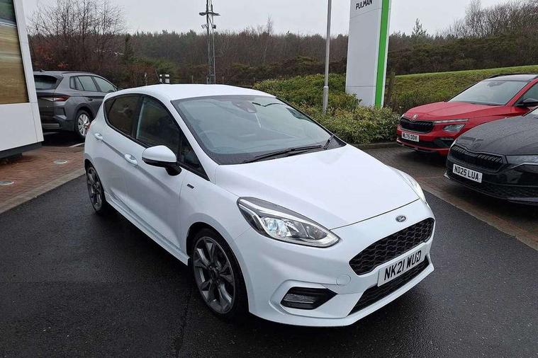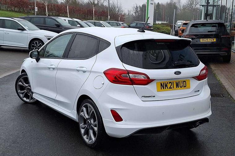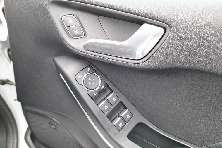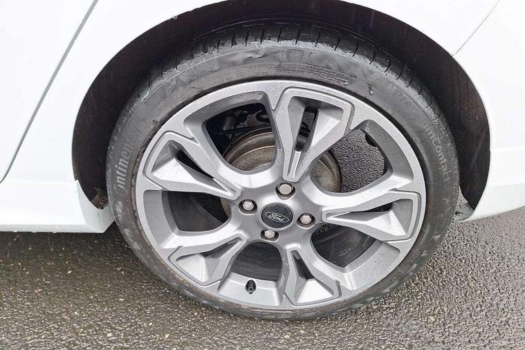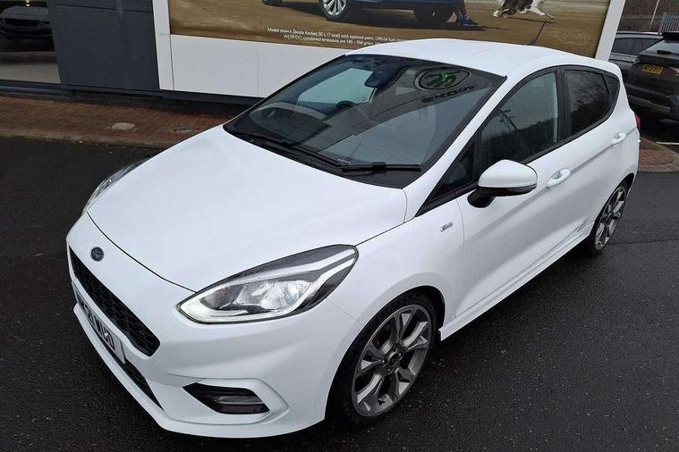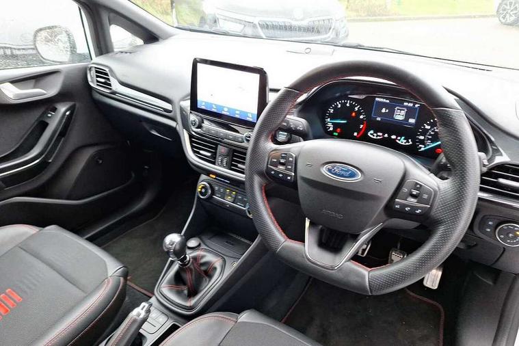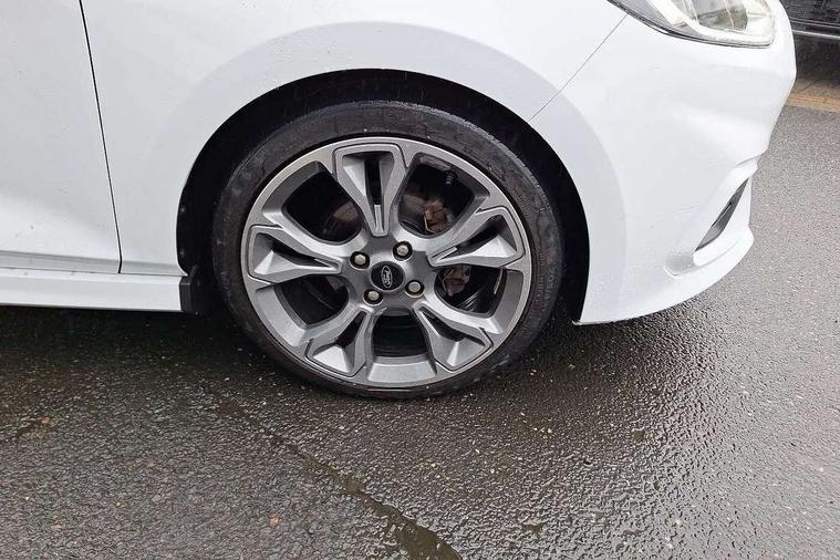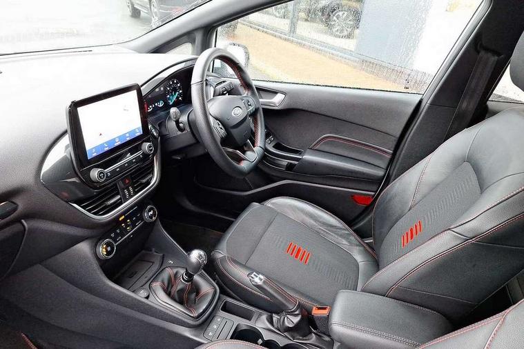 4.2" TFT instrument cluster screen, Bluetooth system, Electric power steering, Ford easy fuel, Rear parking distance sensors, Selectable drive modes (Normal, Sport, Track), Traffic sign recognition, Trip computer, Sports suspension, 2 USB ports, Auxiliary input socket, B&O Premium audio system with 8" touchscreen, 10 speakers, 360 degree sound system, Ford SYNC 3 navigation system and Ford pass connect, DAB Digital radio, Steering wheel mounted controls, Auto high beam, Body colour bumpers, Body colour door handles, Body colour large rear spoiler, Body coloured electrically operated and heated door mirrors with side indicators, Cornering front fog lights, Electric front windows/one touch facility, Electric rear windows, LED Night signature to rear lights, Power foldable door mirrors with puddle lights, Quickclear heated windscreen, Rain sensing wipers and auto dimming rear view mirror, Rear privacy glass, Rear wiper, Unique ST-Line upper grille & full bodystyling kit with ST-Line wing badges, 3 spoke flat bottomed leather steering wheel, 60/40 split folding rear seat, Adjustable head restraints, Black headlining, Boot carpet, Centre console with opening armrest, 2x cupholders, 12v and USB, Chrome inner door handles, Drivers and Passenger lumbar support, EATC - Electronic Auto Temperature control, Footwell illumination, Front floor mats in velour, Front map reading lights, Front seat and rear pockets, Height adjustable passenger seat, Illuminated glovebox, Leather gaiter, LED ambient lighting, Load area light, Manual 4-way driver seat adjust, Overhead console with sunglasses holder, Pollen filter, Rake/reach adjustable steering wheel, Sensico wrapped steering wheel, Sports front seats, NCAP Pack - Fiesta, ST-Line X Trim Pack - Fiesta, 3 point seatbelts on all rear seats, ABS+EBA, Curtain airbags, Driver and passenger airbags, Drivers knee airbag, Electronic stability control with hill start assist, Front passenger airbag deactivation, Front side airbags, Seatbelt warning, Two tone horn, Tyre pressure monitoring system, Ford keyfree system with Keyless entry and keyless start, MyKey system, Remote central locking & engine immobiliser, Thatcham Cat.1 alarm, 18" 5 spoke alloy wheels with rock metallic machined finish,