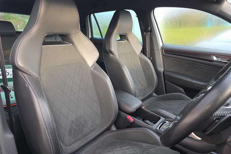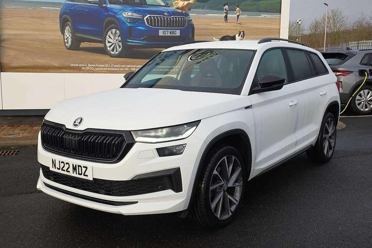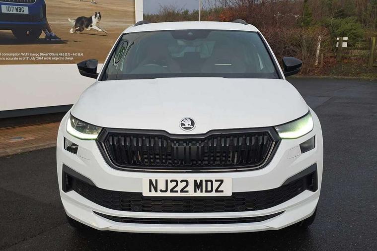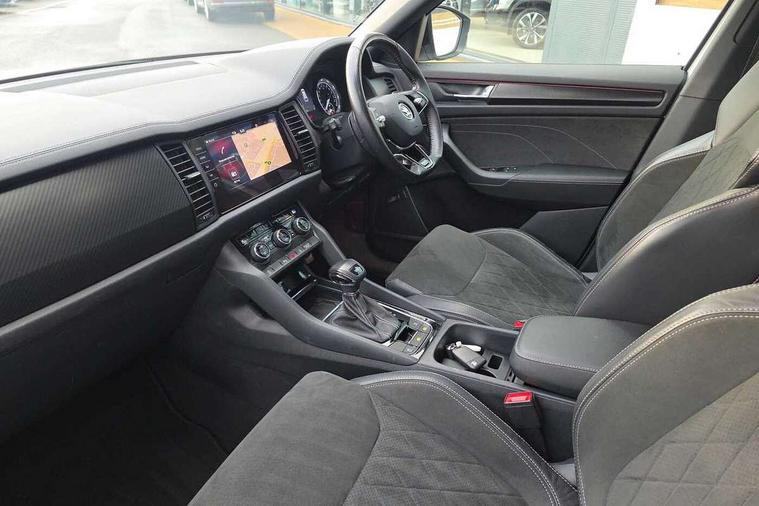 Bluetooth system, Columbus satellite navigation with 9.2" touchscreen, integrated Wi-Fi, web radio, E-call, ECO Stop/start function, Exterior temperature indicator, Progressive steering, Rear view camera, Smartlink wireless for apple carplay and wired for android auto, Speed limiter, Tailgate unlocking from outside, USB C Port x 2 in front centre console, Wireless charging, 8 Speakers, DAB Digital radio, Aero front windscreen wipers with intermittent function, Aero rear window wiper, Auto dimming rear view mirror, Black roof rails, Black sports styling including front grille and window surrounds, Black wheel arch surrounds, Body colour bumpers, Body colour door handles, Electric adjustable/heated/folding door mirrors, driver side auto dimming with boarding sports and memory function, Electric front and rear windows, Extended rear spoiler with finlets in gloss black, Front fog lights, Full LED matrix headlights with AFS (adaptive front light system), cornering function and AWL (all weather lighting system), Gloss black door mirrors, Headlight washers, Heated rear window, Invisible tailpipe, LED daytime running lights, LED rear fog light, LED third brake light in rear spoiler, Light assistant (coming/leaving home/tunnel light), Off-road style lower front bumper element, Privacy glass, Rain and light sensors, Rear diffuser, Rear LED lights (high functionality) with welcome effect and dynamic indicators, Rear side wing doors, Safety reflectors on front and rear doors, Sportline badge on front fender, Sports front and rear bumpers including lower rear chrome strip, Tailgate lettering in Black, Window control switches with black trim, 12V socket in boot, 2 rails with 2 hooks, 2 seat bench in 3rd row, 3 seat bench in 2nd row, 4 foldable roof handles with rear coat hooks, 60:40 foldable rear seat with sliding adjustment and backrest angle adjustment, Aluminium pedals, Black roof headlining, Bottle holders in door panel in the 1.5 litre front and 1 litre rear, Cargo storage compartments, Chrome headlight control button, Chrome interior door handles, Coat hooks on B pillar, Covered storage compartment on driver side, Decorative door sills in the front and rear, Front centre armrest with storage compartment, cup holder and 12V socket, Front courtesy lights, Gear shift lever with chrome frame and black gloss insert, Grey stitching in front and rear armrests and door armrests + door inserts, Height adjustable front headrests, Illuminated and cooled glovebox, Illuminated luggage compartment, Isofix child seat fittings in outer rear seats with top tether, Manually adjustable steering column, Microsuede door panels, Net programme in boot (1x horizontal Net, 2x vertical Nets), Overhead glasses storage compartment, Pollen filter, Rear centre armrest with cupholders, Single front passenger seat, Sliding trunk cover, Small Bags on the inner sides of the front backrests, Sports seats, Sunvisors with illuminated vanity mirrors, Three rear height adjustable headrests, Ticket holder on A Pillar, Umbrella in door panel, Variable boot floor, LED Interior light pack - Kodiaq, Auto door release and activation of warning lights in the event of an accident, Child locks on rear doors, Driver and front passenger airbag with knee airbag and front passenger airbag deactivation, Electronic parking brake with hill start assist, Emergency rear braking signal, ESC (incl. ABS+MSR+ASR+EDS+HBA+DSR+RBS+MKB), Front assist with autonomous emergency braking, Front side airbags with curtain airbags, Fuel cut off safety device, Height adjustable front 3 point seatbelts + pretensioners, Hill hold control, Rear disc brakes, Safety vest holder in door, Seat belt reminder for all seats, Three point rear seat belts, Two tone horn, Tyre pressure monitor, Alarm with interior monitoring and tilt sensor with safe function, Anti-theft wheel bolts, Immobiliser, Keyless entry and start system (KESSY), Remote central locking with 2 keys, Black air vent surround, Carbon finish dashboard and door inserts, Grey stitching in dashboard, 20" Vega Anthracite alloy wheels, Temporary spare wheel (space saver),