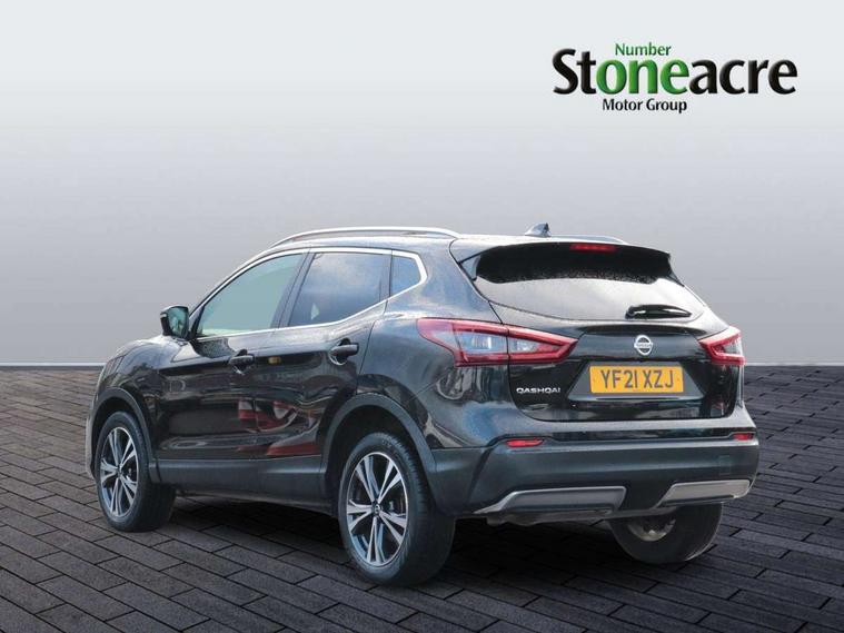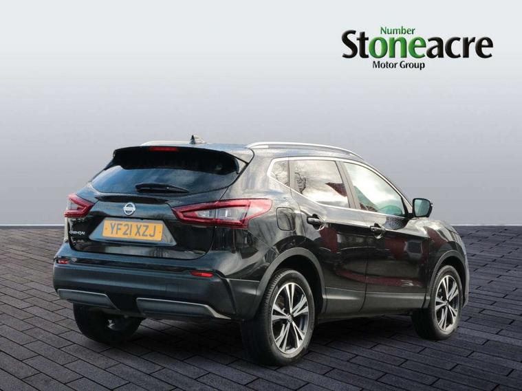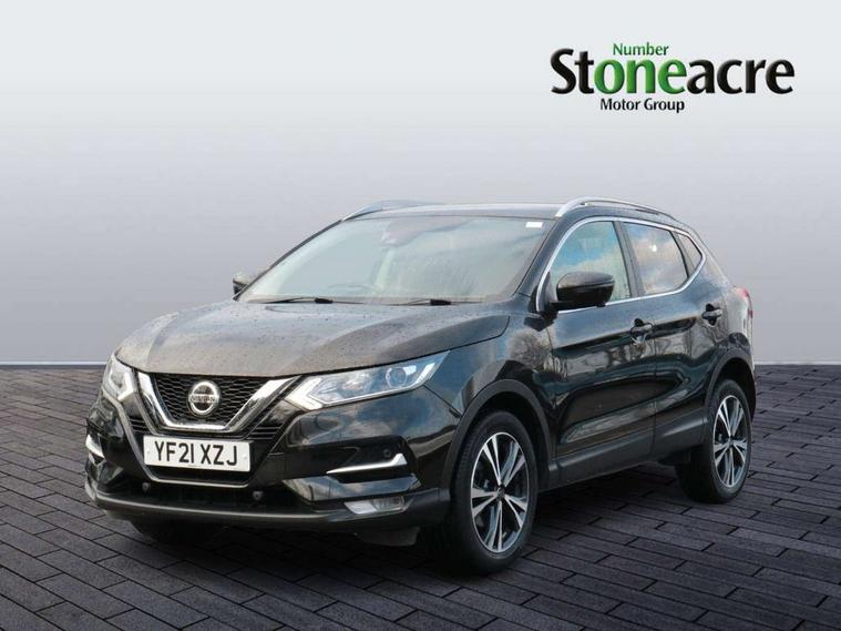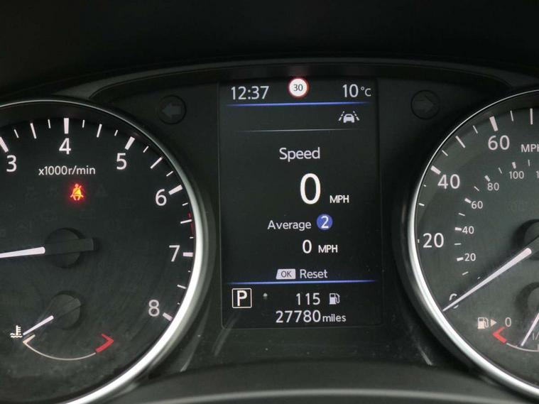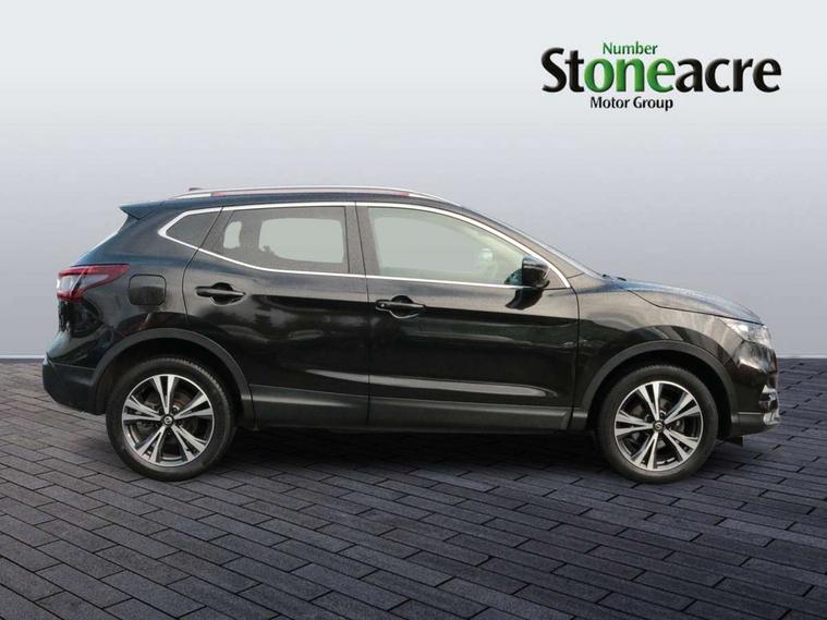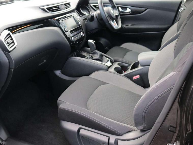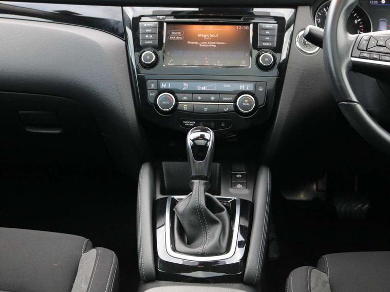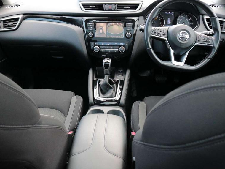 360 degree Intelligent around view monitor, Advanced drive assist display 5'' TFT coloured screen, Apple car play/Android Auto, Bluetooth connectivity, Cruise control + speed limiter, Electric speed sensitive power steering, Front parking sensors, Idle stop/start system, Intelligent park assist, Lane departure warning system, Nissan connect evo 7" touchscreen navigation and entertainment system, Normal or sport selectable steering, Outside temperature sensor, Premium Tomtom connected services, Push button starter, Rear parking sensors, Service interval indicator, Smartphone integration, Traffic sign recognition, Trip computer, Voice control system, Nissan chassis control (intelligent ride control, intelligent trace control, intelligent engine brake), 6 speakers, AM/FM radio, CD audio system, Aux-in socket, DAB Digital radio, Steering wheel mounted audio controls, USB port, Anti dazzle rear view mirror, Auto wipers, Body colour bumpers, Body coloured door handles, Body coloured door mirrors, Chrome window surround, Daytime running lights dip function when turn signal applied, Electric folding door mirrors, Electric front and rear windows with one touch illuminated window controls, Electrically adjustable door mirrors, Front fog lights, Halogen headlights, Heated door mirrors, High beam assist, Intelligent auto headlights, LED indicators in door mirrors, Matt silver roof rails, Privacy glass, Rear roof spoiler, Rear wiper with reverse link, Shark fin antenna, Signature LED daytime running lights, Silver rear styling plate, Underbody vortex generators, 2 X front 12v power sockets, 3 height adjustable rear headrests, 60/40 split folding rear seat, Ambient interior lighting, Ambient lighting around centre console, Bi-colour cloth upholstery, Boot lighting, Centre console storage box/armrest, Chrome interior door handles, Driver's seat manual height adjust, Dual zone climate control, Front and rear door pockets with bottle holders, Front and rear seat belt pre-tensioners with load limiters, Height adjustable front headrests, ISOFIX restraints on outer rear seats x2, Leather D shaped steering wheel, Leather gear lever, Leather knee pad, Luggage board system, Manual height adjustable passenger seat, Manual lumbar support on driver seat, Manual lumbar support on passenger seat, Monoform front sport seats with plastic backboard, Parcel shelf stow function under luggage board, Pollen filter, Rear armrest with 2 cupholders, Synthetic leather wrapped door handle with contrasting stitching, Tilt/telescopic adjustable steering wheel, Velour floor mats, Glass roof pack - Qashqai, 6 airbags - Driver, front passenger, curtain and side airbags, ABS, ESP, EBD and brake assist, Auto hold function, Child locks on rear doors, Electronic parking brake, Front and rear seat belt warning, Height adjustable front seatbelts, Hill start assist, Intelligent emergency braking with pedestrian recognition, Passenger airbag deactivation system, Three 3 point rear seatbelts, Tyre pressure monitoring system, Anti-theft immobiliser, Intelligent Key, Remote central locking, Thatcham Cat.1 alarm, Carbon graphite dash trim, 18" Two tone alloy wheels,