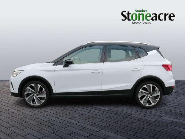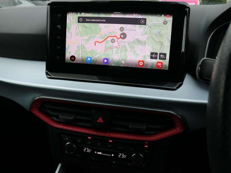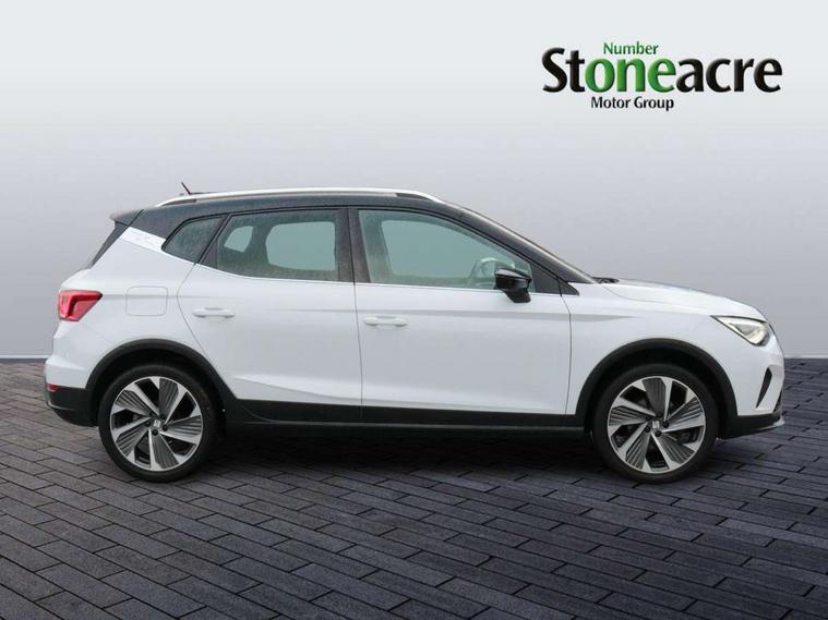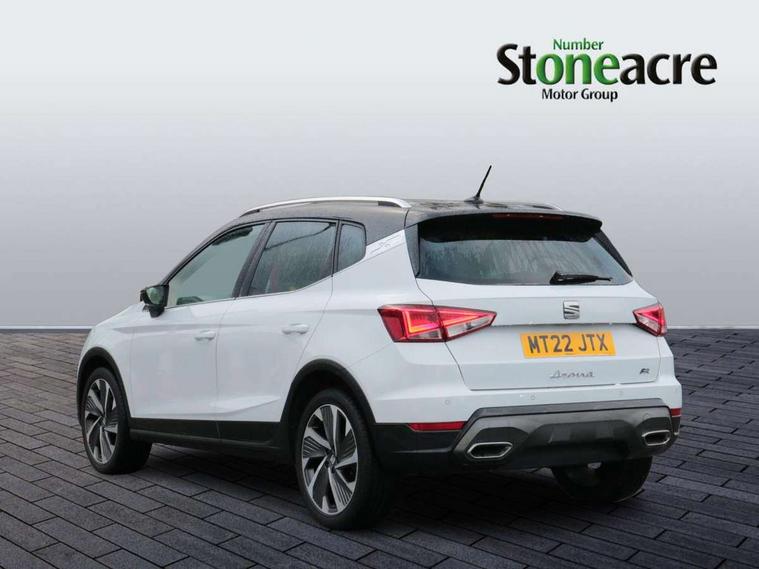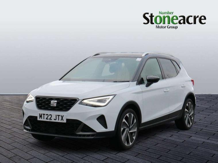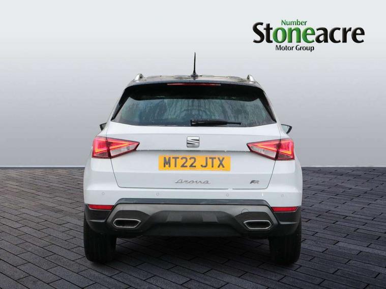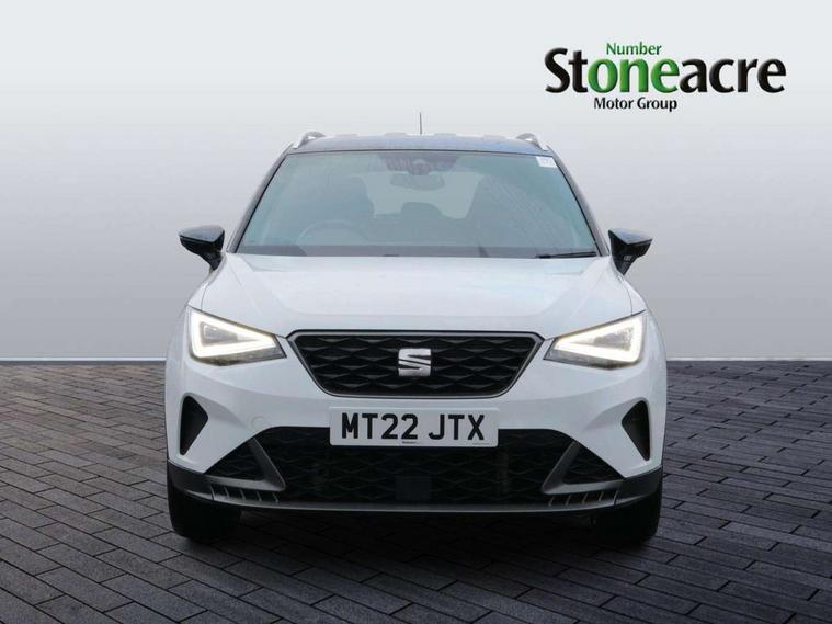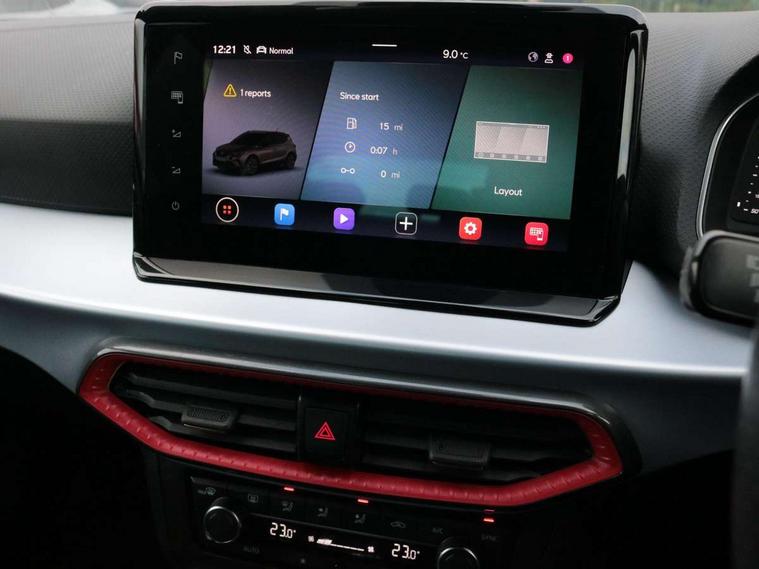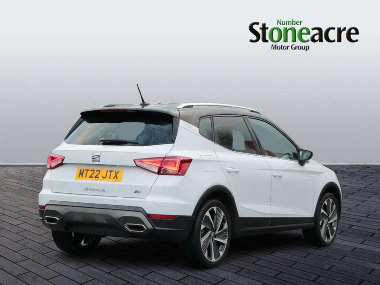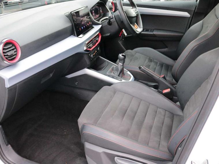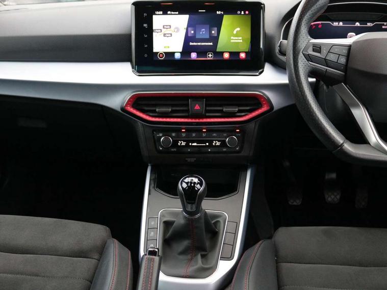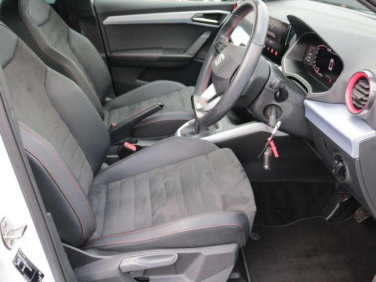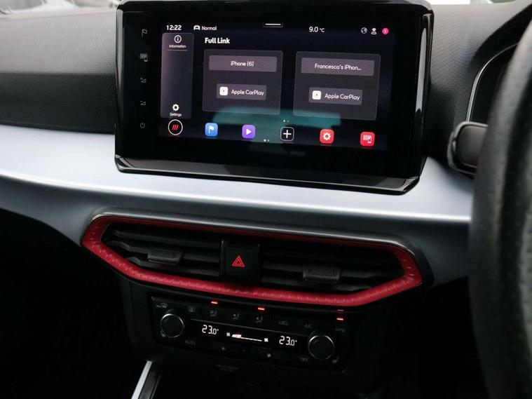 Digital cockpit, E-call, Electric speed sensitive power steering, Full Link Smartphone Integration with Mirror Link, Apple Car Play, Google Android Auto with USB Type C cable for Apple and Android compatibility, Lane keeping system, Rear parking sensor, Seat connect with safety, service, remote and online, SEAT Drive profile - Four different models normal-sport-eco-individual, steering response, throttle response, Bluetooth interface for hands free and audio streaming, DAB digital radio and AM/FM radio, Steering wheel mounted audio controls, Anti theft roof antenna, Auto dimming interior rear view mirror, Automatic activation of hazard warning lights, Body coloured bumpers, Body coloured door handle inserts, Chrome roof rails and window surrounds, Chrome window trim, Dark tinted rear windows, Electric front/rear windows, Electrically adjustable, heated and folding door mirrors, FULL LED automatic headlights with dynamic headlight range control, coming and leaving home, LED daytime running lights, LED rear tail lights and licence plate lights, Protective side mouldings, Rain sensing wipers, Rear side wing doors, Rear spoiler, Rear window wash/wipe, Roof colour door mirrors, Third brake light, Twin exhaust pipe styling hidden exhaust pipe, Visible VIN plate, Windshield wiper with intermittent control and potentiometer, 2 cupholders, 3 seat bench in 2nd row, 60/40 split folding rear seat, Aircare filter, Black interior roof, Double boot floor, Driver sunvisor with covered mirror + card holder, Dual zone climate control, Front courtesy light with 2x front and 2x rear reading lights, Front seat back storage pockets, Front sport seats, Heated front seats, Height adjustable front seats, Height/reach adjustable steering column, Illuminated boot, Interior ambient lighting, Interior light in footwell, central console and door panel, ISOFIX points in outer rear seats with top tether anchorage points, Microsuede cloth upholstery, Passenger sunvisor with vanity mirror, Perforated flat bottomed leather steering wheel/gear knob/handbrake with red stitching and FR logo, Single front passenger seat, Two front and three rear height adjustable headrests, Connectivity pack plus - Arona, Interior chrome pack - Arona, 3 point seatbelts on all rear seats, ABS, Active front headrests, Child locks on rear doors, Driver and front passenger airbags with front passenger airbag de activation, front side and curtain airbags, Electronic stability control, Emergency Brake Assist (EBA) and front assist, Front and rear seatbelt reminder, Hill hold control, Multi-Collision braking, Tiredness recognition system, Traction control, Tyre pressure monitoring system, Alarm with back-up horn, Electronic engine immobiliser, Locking wheel bolts, Remote central locking + deadlocks, Tow away protection, Titan black dashboard, 18" Performance Cosmo grey matt alloy wheels,