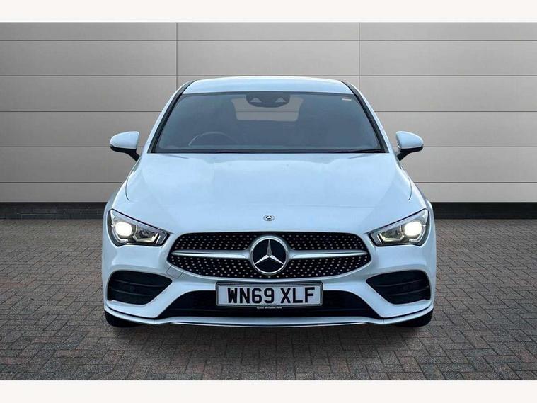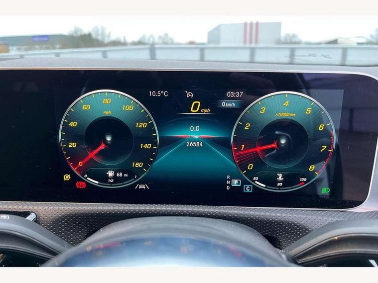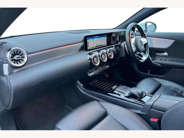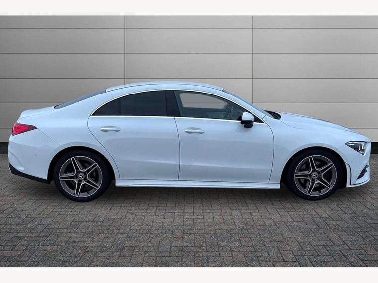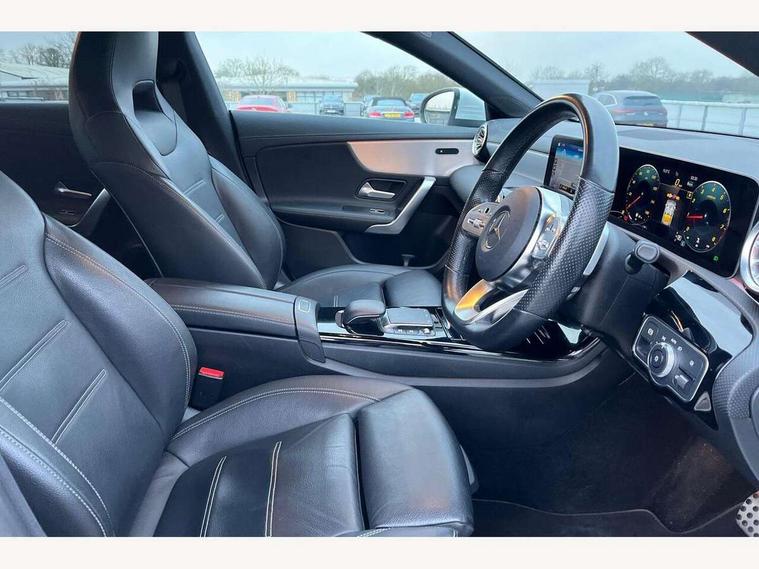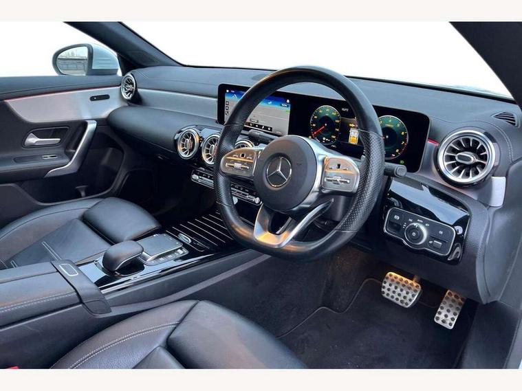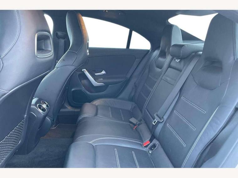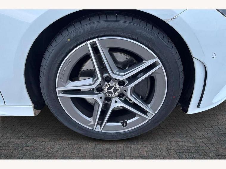 10.25 inch Instrument display with digital cockpit, 10.25 inch touchscreen central media display, Active lane keeping assist, Attention assist - Monitors steering behaviour and long journey fatigue, Cruise control with limiter, Direct steer system with speed sensitive power steering, Dual bluetooth interfaces, DYNAMIC SELECT with a choice of driving modes (ECO, Comfort, Sport, Sport+ and Individual), ECO start/stop function, Fluid level warning indicator for fuel, oil, coolant and washer fluid, Hard-disk navigation, Hey Mercedes Voice activation, Lamp failure indicator, MBUX augmented reality for navigation, Mercedes me connect including emergency call system, accident recovery, breakdown and maintenance management, Outside temperature gauge, Owners manual and service booklet in English, Pre-installation for Vehicle Monitoring, Pre-installation for Vehicle Setup, Pre-installation of private car share, Preinstallation for Mercedes Benz link, Radio aerial integrated into front and rear windshields, Service indicator (ASSYST), Smartphone integration with Apple CarPlay and Android auto, Speed limit assist, Trip computer in multifunction display with current consumption indicator, Wireless charging, 7G-DCT 7 speed automatic transmission, Lowered comfort suspension, Rear axle multi-link, Sporty engine sound system, DAB digital radio tuner, MBUX multimedia system with DAB digital radio and touchpad including satellite navigation, Mercedes Benz advanced sound system (225 W) with 10 speakers, 1 central speaker, speakers on doors, a tweeter on door, one sub woofer + boost amplifier, USB (type C) ports (2) in stowage compartment and 1 in front of centre console, Adaptive brake lights, AMG body styling with AMG front apron and rear apron and visible exhaust tailpipe in chrome trim elements, AMG bodystyling side skirts, Body colour bumpers, Body colour door handles, Chrome beltline strips, Chrome weather strip, Diamond radiator grille pins in chrome with silver painted louvres and chrome insert, Electric windows, Electrically adjustable and heated door mirrors with integrated LED indicators, Exhaust system with 2 Visible tailpipe trim elements and rear apron with trim in chrome, Headlamp assist automatic headlamp activation, Heated glass rear windscreen + timer control, High level LED third brake light, LED high performance headlamps with integrated LED daytime running lights, LED tail lamp, Privacy glass with dark tinting on rear side windows and rear window, Rain sensing windscreen wipers with two sensitivity settings, Rear fog lamp, Vehicle Monitoring, Vehicle Setup, Window line trim strip in chrome, 3 spoke flattened bottom nappa leather multifunction steering wheel with perforated leather in grip area, 40:20:40 split folding rear seat backrests, Air conditioning - Two zone thermotronic luxury automatic climate control with display, Air vents with surround in silver chrome, Automatic child seat recognition sensor, Black roof lining, Brushed stainless steel sports pedals with rubber studs, Floor mats with stitched AMG lettering, Front centre armrest with stowage, Front seat cushion length adjustment, Galvanished gear shift paddles on steering wheel, Heated front seats, Illuminated glove compartment stowage, Illuminated Mercedes benz door sills with Mercedes Benz lettering, Interior lighting - 64 colour Ambient lighting, Luggage net on driver/front passenger seat backrest, Manually adjustable front seats, Manually height and reach adjustable steering column, Rear armrest with two integral cup holders for drinks, Rear head restraints, Rear interior lamp, Spectacles compartment for driver, Sport seats with fixed head restraints, Stowage compartment in centre console with retractable cover, Sunvisors with illuminated vanity mirrors, Touchpad on center console, Twin front cupholders, Two outer rear seat isofix and top tether child seat fixing points, Keyless go pack - CLA, Light and sight pack - CLA, Mirror pack - CLA, Parking package - CLA, Seat comfort pack - CLA, Active bonnet pedestrain safety measure which detects an impact and raises bonnet by 65mm, Active brake assist includes forward collision warning system with autonomous braking, Adaptive brake assist with hold function and hill start assist, Anti-lock braking system (ABS), Black seat belts, Bonnet with power domes, Brake pad wear warning indicator, Childproof locks manually operated for rear doors and electrically operated for rear power windows, Crash responsive emergency lighting, Driver and front passenger head and sidebags, Driver and front passenger windowbags, Drivers knee airbag, Dual stage driver and front passenger airbags, Electric parking brake, Electronic stability programme with acceleration skid control, ESP curve dynamic assist, Front and rear seatbelt reminder, Front brake callipers with Mercedes Benz lettering, Front passenger seat occupancy sensor, Three point rear seat belts, Tyre pressure monitoring system, Warning triangle and first aid kit, Alarm system with immobiliser and interior protection -Thatcham category 1, Remote central locking and crash sensor with emergency opening function, Light aluminium with longitudinal grain interior trim, 18" 5 twin spoke design alloy wheels painted in titanium grey with high sheen finish, Summer tyres, Tirefit tyre sealant kit,