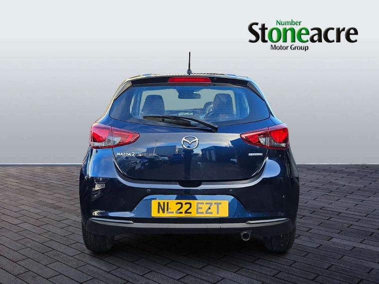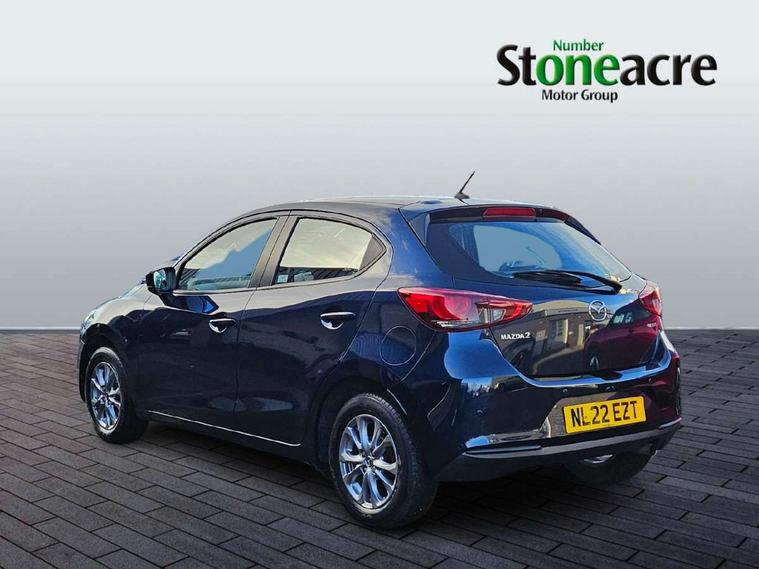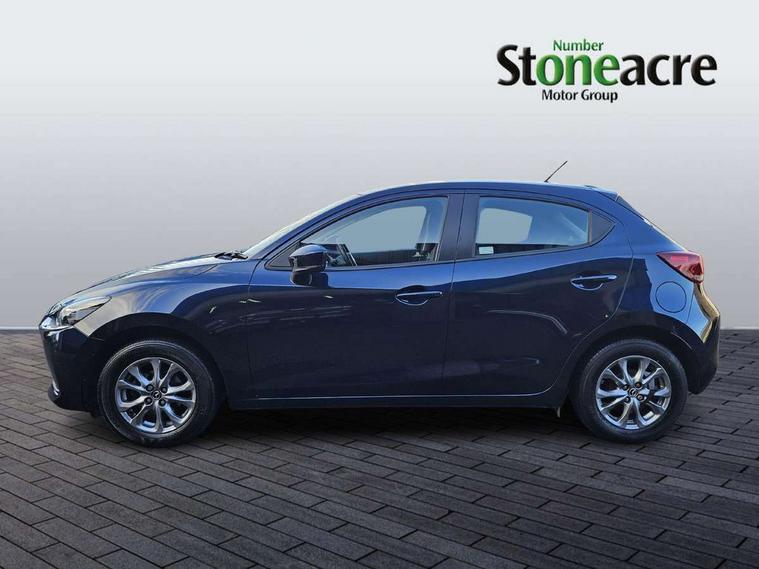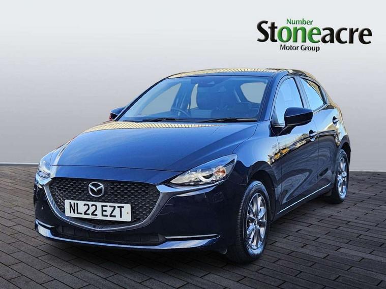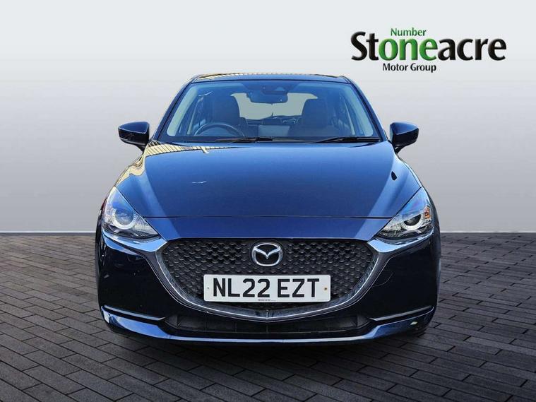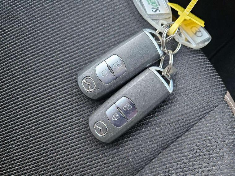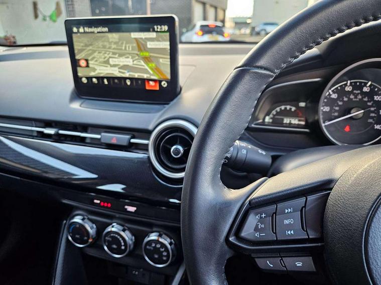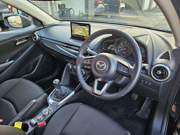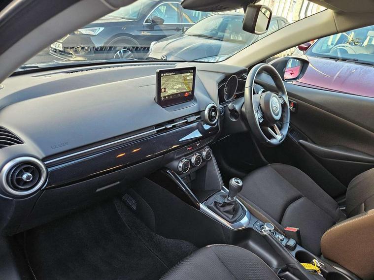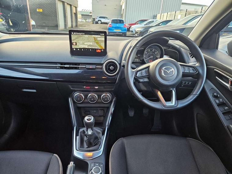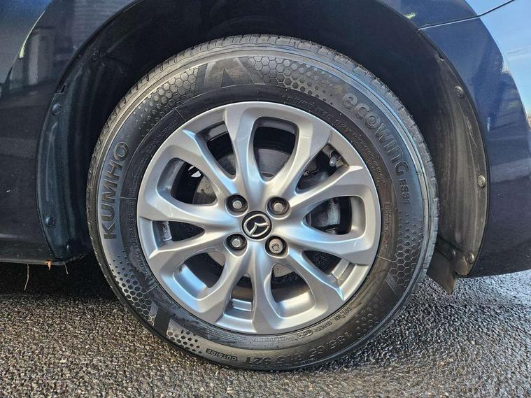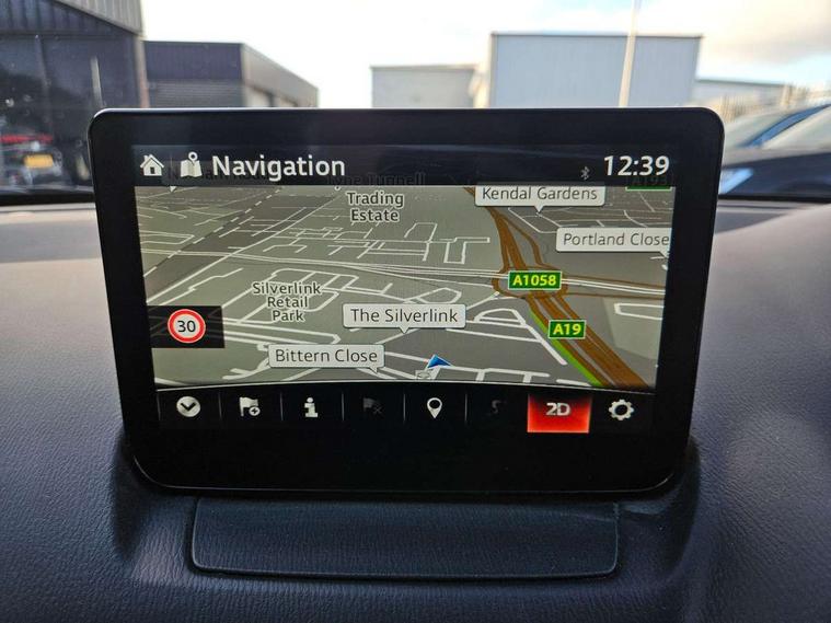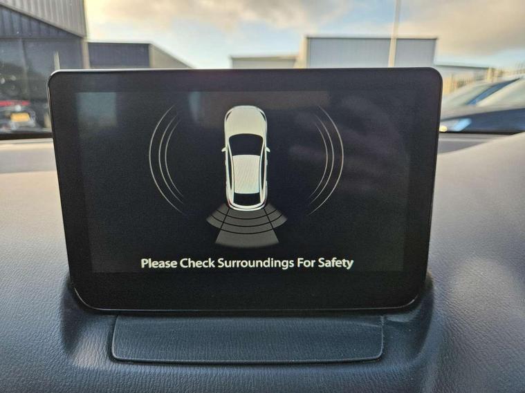 Adjustable speed limiter, Analogue speed display meter, Apple car play/Android Auto, Cruise control, Digital instrument cluster, Digital rev counter, E-call, Emergency stop signalling system, Engine start/stop button, Integrated bluetooth, Lane departure warning system, Lane keep assist, Mazda connect with 8" colour touch screen, Navigation system, PAS, Rear parking sensor, Service indicator, Trip computer, i-stop, AM/FM/DAB radio with 6 speakers with USB and AUX inputs, Multimedia Commander including separate volume dial, Steering wheel mounted audio/bluetooth controls, Auto dimming rear view mirror, Auto headlight levelling, Body colour door mirrors, Body coloured front bumper with black lower bezel, Body coloured rear bumper with black lower mouldings, Chrome finish signature wing on front grille, Coming/leaving home lighting function, Dusk sensing headlights, Electric adjustable/heated/folding door mirrors, Electric front/rear windows with one touch auto up/down for driver's window, Halogen daytime running lights, LED Headlights, LED indicator lights, LED third brake light, Rain sensing front wipers with adjustable sensitivity and speed, Rear side wing doors, Rear wiper, Satin black front grille, 3 seat bench in 2nd row, 60/40 split rear seats, Climate control air conditioning, Cloth upholstery, Driver, Front passenger and two rear grab handles with coathooks, Drivers seat manual slide recline and height adjustment, Drivers/front passengers covered vanity mirrors and drivers ticket holder, Folding rear seats, Front centre storage with two cupholders, Front head restraints, Front passenger and driver door pockets, Front passenger seat manual slide, recline and height adjust, Front passenger seatback pockets, Gear shift indicator, Glovebox, Interior courtesy light with integrated spotlight, ISOFIX child seat anchorage points attached on outer rear seats, Leather handbrake, Leather steering wheel and gear knob, Luggage compartment light, Satin silver dials, Single front passenger seat, Three height adjustable rear head restraints, Tilt/telescopic adjustable steering wheel, 2x3 point front seatbelts with pre-tensioners, 3 point seatbelts on all rear seats, Anti-lock braking system (ABS), Autonomous emergency braking, Collision mitigation braking system, Dynamic stability control + Traction control, ESP, Front and rear curtain airbags, Front driver, passenger and rear seat seatbelt warning, Front dual stage driver and single stage front passenger airbags, Front side airbags, Front smart city brake support, G-Vectoring control plus, Hill launch assist, Manual child lock in rear doors, Passenger airbag cut-off switch, Tyre pressure monitoring system, Deadlocking system, Immobiliser, Power door locks, Remote central locking, Thatcham accredited alarm and immobiliser, Black dashboard, 15" Silver alloy wheels, Emergency tyre repair kit,