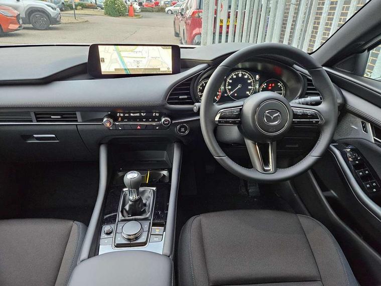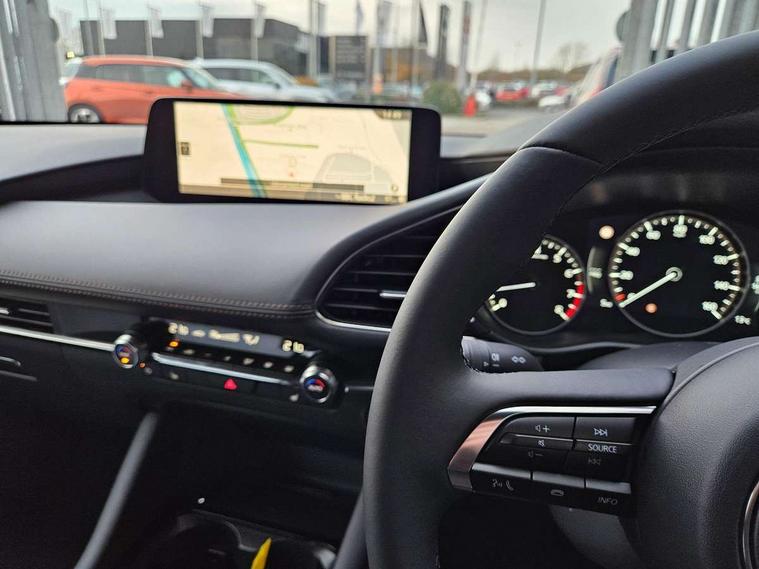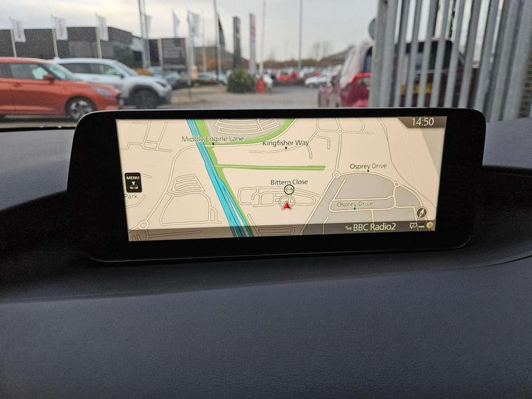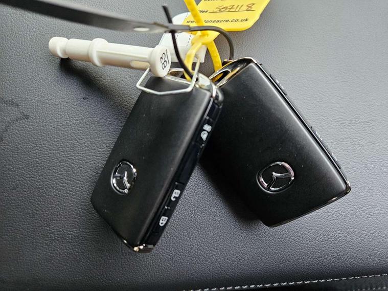 10.25" display with Mazda Connect infotainment, 7" colour TFT display, Adjustable speed limiter, Advanced E-call with GPS, Alexa in-car voice assistant, Audio transfer from bluetooth devices, Blind spot monitoring with rear cross traffic alert, Car finder, Colour active driving display inc Windscreen projected, Traffic Sign Recognition, turn-by- turn navigation and Mazda Radar Cruise Control information, Digital instrument cluster, Driver attention alert system, Emergency stop signalling system, Engine start/stop button, Front and rear parking sensor with audible and visual warning, Head up Display, Integrated bluetooth with steering wheel mounted controls, Intelligent speed assist, Lane keep assist system (LAS) with Lane departure warning system (LDWS), Mazda connected services, Mazda Navigation System with european mapping, Mazda Radar Cruise Control, Mobile App interface, Multimedia Commander, PAS, Qi wireless charging, Reversing camera, Service indicator, Tailgate, Traffic sign recognition (TSR), Trip computer, Wireless Apple CarPlay/Android Auto, Cylinder Deactivation, i-stop, 2 USB-C ports in the front, Mazda Multimedia System with AM / FM / DAB radio with 12 Speaker Bose sound system, bose centerpoint, bassmatch+audiopilot technology, Adaptive LED Headlights, Auto dimming driver's door mirrors, B-pillar garnish in piano black, Body coloured door mirrors, Coming/leaving home lighting function, Dark metallic finish signature wing, Dual chrome tailpipes tip, Dusk sensing headlights, Electric front/rear windows with one touch/auto up/down, Electrically adjustable, heated auto power folding door mirrors, Frameless auto dimming interior rear view mirror, Front body coloured bumper with black lower bezel, Front kodo turn signal, Gloss black finish front grille, Gloss black rear roof spoiler, LED auto headlight levelling, LED indicator lights, LED third brake light, Privacy glass with dark tinting on rear side windows and rear window, Rain sensing front wipers with adjustable sensitivity and speed, Rear colour coded bumper with gloss black lower moulding, Rear fog lights, Rear side wing doors, Signature LED daytime running lights, Signature LED rear combination lights, Speed adjustable rear wash wiper with intermittent wipe, 12v electrical power outlet, 3 seat bench in 2nd row, 60/40 split fold down rear seats, Chrome interior trim accents with steering wheel centre bezel, surround of engine start / stop button and glove box handle, Cloth upholstery, Dark cloth door panel inserts, Dark roof headlining, ceiling and pillars, Driver seat manual slide, recline, height and seat tilt adjust, Driver, front passenger and two rear door pockets, Driver, Front passenger and two rear grab handles with coathooks, Driver/passenger sunvisors + vanity mirrors (drivers side with ticket holder), Dual zone climate control air conditioning, Folding rear centre armrest with two cup holders, Front and rear courtesy lamps, Front armrest, Front centre storage with two cupholders, Front head restraints, Front passenger seatback pocket, Front passengers seat manual slide, recline and height adjustment, Gear shift indicator, Heated front seats with 3 stage setting, Illuminated glovebox, Interior colouration dashboard and doorcards in black with dark stitching, ISOFIX child seat anchorage points attached on outer rear seats, Leather wrapped gear shift knob, Leather wrapped steering wheel, LED interior light, LED light in luggage compartment, Power outlet in luggage compartment, Roof mounted sunglasses holder, Single front passenger seat, Three height adjustable rear head restraints, Tilt/height adjustable steering wheel, 3 point ELR front seatbelts with pretensioners, 3 rear 3 point seatbelts with ELR, Anti-lock braking system (ABS), Drivers knee airbag, DSC - Dynamic Stability Control, Dual stage driver and single stage passenger airbags, EBD - Electronic brakeforce distribution, Electronic parking brake with auto disengage function and auto hold function, Front and rear curtain airbags, Front passenger airbag cut-off switch, Front side airbags, Front smart city brake support, G-Vectoring control plus, Hill launch assist, Intelligent Traction Control system, Manual child lock in rear doors, Mild Hybrid system with regenerative braking, Seatbelt reminder audible warning for driver, passenger and rear seats, Tyre pressure monitoring system (TPMS), Auto door lock when driving, Remote central locking + deadlocks, Smart keyless entry, Thatcham accredited alarm and immobiliser, 18" Grey alloy wheels, Emergency tyre repair kit,