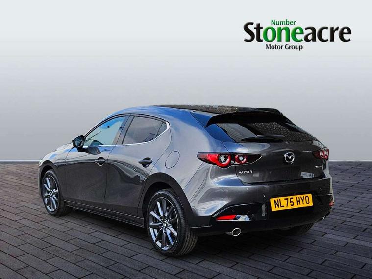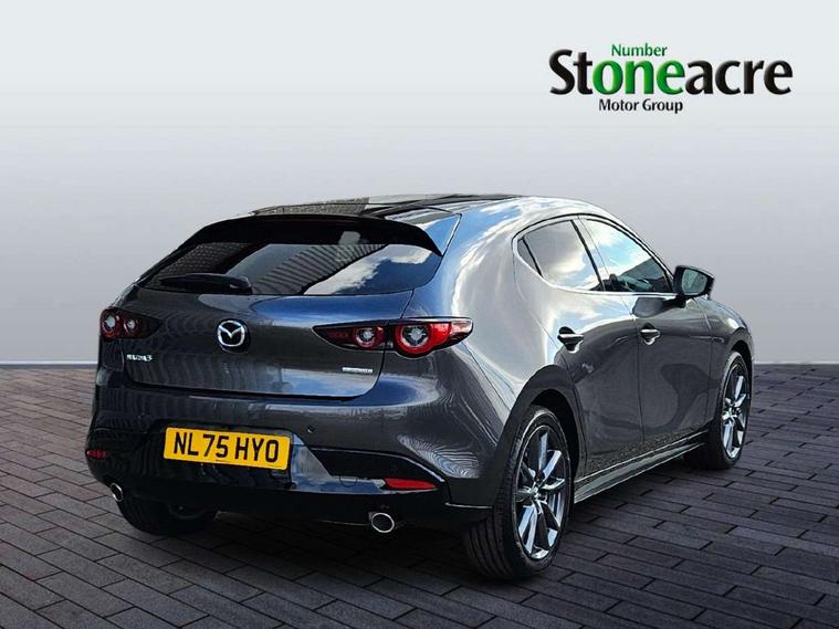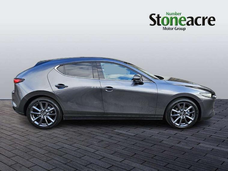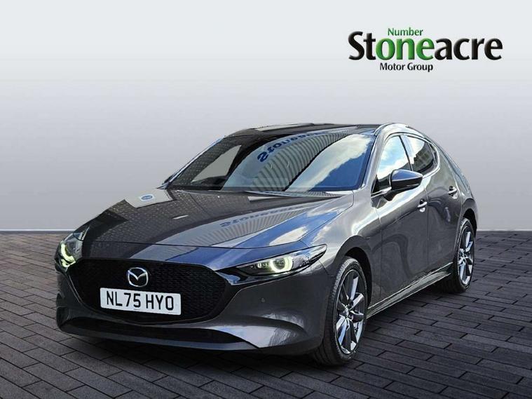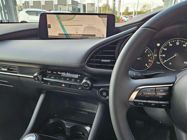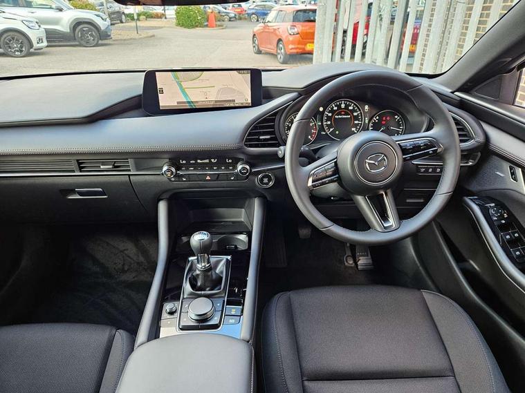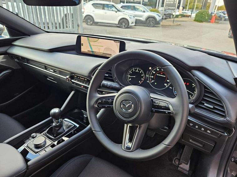 10.25" display with Mazda Connect infotainment, 7" colour TFT display, Adjustable speed limiter, Advanced E-call with GPS, Alexa in-car voice assistant, Audio transfer from bluetooth devices, Blind spot monitoring with rear cross traffic alert, Car finder, Colour active driving display inc Windscreen projected, Traffic Sign Recognition, turn-by- turn navigation and Mazda Radar Cruise Control information, Digital instrument cluster, Driver attention alert system, Emergency stop signalling system, Engine start/stop button, Front and rear parking sensor with audible and visual warning, Head up Display, Integrated bluetooth with steering wheel mounted controls, Intelligent speed assist, Lane keep assist system (LAS) with Lane departure warning system (LDWS), Mazda connected services, Mazda Navigation System with european mapping, Mazda Radar Cruise Control, Mobile App interface, Multimedia Commander, PAS, Qi wireless charging, Reversing camera, Service indicator, Tailgate, Traffic sign recognition (TSR), Trip computer, Wireless Apple CarPlay/Android Auto, Cylinder Deactivation, i-stop, 2 USB-C ports in the front, Mazda Multimedia System with AM / FM / DAB radio with 12 Speaker Bose sound system, bose centerpoint, bassmatch+audiopilot technology, Adaptive LED Headlights, Auto dimming driver's door mirrors, B-pillar garnish in piano black, Body coloured door mirrors, Coming/leaving home lighting function, Dark metallic finish signature wing, Dual chrome tailpipes tip, Dusk sensing headlights, Electric front/rear windows with one touch/auto up/down, Electrically adjustable, heated auto power folding door mirrors, Frameless auto dimming interior rear view mirror, Front body coloured bumper with black lower bezel, Front kodo turn signal, Gloss black finish front grille, Gloss black rear roof spoiler, LED auto headlight levelling, LED indicator lights, LED third brake light, Privacy glass with dark tinting on rear side windows and rear window, Rain sensing front wipers with adjustable sensitivity and speed, Rear colour coded bumper with gloss black lower moulding, Rear fog lights, Rear side wing doors, Signature LED daytime running lights, Signature LED rear combination lights, Speed adjustable rear wash wiper with intermittent wipe, 12v electrical power outlet, 3 seat bench in 2nd row, 60/40 split fold down rear seats, Chrome interior trim accents with steering wheel centre bezel, surround of engine start / stop button and glove box handle, Cloth upholstery, Dark cloth door panel inserts, Dark roof headlining, ceiling and pillars, Driver seat manual slide, recline, height and seat tilt adjust, Driver, front passenger and two rear door pockets, Driver, Front passenger and two rear grab handles with coathooks, Driver/passenger sunvisors + vanity mirrors (drivers side with ticket holder), Dual zone climate control air conditioning, Folding rear centre armrest with two cup holders, Front and rear courtesy lamps, Front armrest, Front centre storage with two cupholders, Front head restraints, Front passenger seatback pocket, Front passengers seat manual slide, recline and height adjustment, Gear shift indicator, Heated front seats with 3 stage setting, Illuminated glovebox, Interior colouration dashboard and doorcards in black with dark stitching, ISOFIX child seat anchorage points attached on outer rear seats, Leather wrapped gear shift knob, Leather wrapped steering wheel, LED interior light, LED light in luggage compartment, Power outlet in luggage compartment, Roof mounted sunglasses holder, Single front passenger seat, Three height adjustable rear head restraints, Tilt/height adjustable steering wheel, 3 point ELR front seatbelts with pretensioners, 3 rear 3 point seatbelts with ELR, Anti-lock braking system (ABS), Drivers knee airbag, DSC - Dynamic Stability Control, Dual stage driver and single stage passenger airbags, EBD - Electronic brakeforce distribution, Electronic parking brake with auto disengage function and auto hold function, Front and rear curtain airbags, Front passenger airbag cut-off switch, Front side airbags, Front smart city brake support, G-Vectoring control plus, Hill launch assist, Intelligent Traction Control system, Manual child lock in rear doors, Mild Hybrid system with regenerative braking, Seatbelt reminder audible warning for driver, passenger and rear seats, Tyre pressure monitoring system (TPMS), Auto door lock when driving, Remote central locking + deadlocks, Smart keyless entry, Thatcham accredited alarm and immobiliser, 18" Grey alloy wheels, Emergency tyre repair kit,