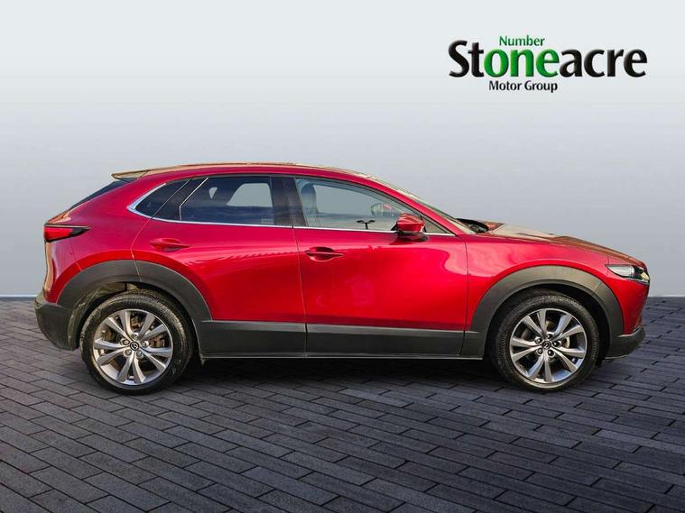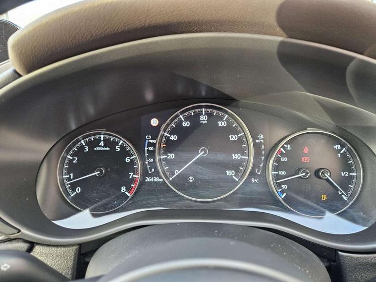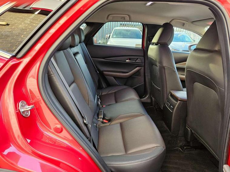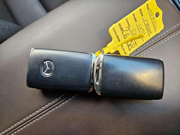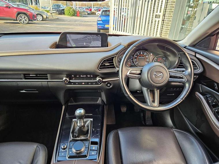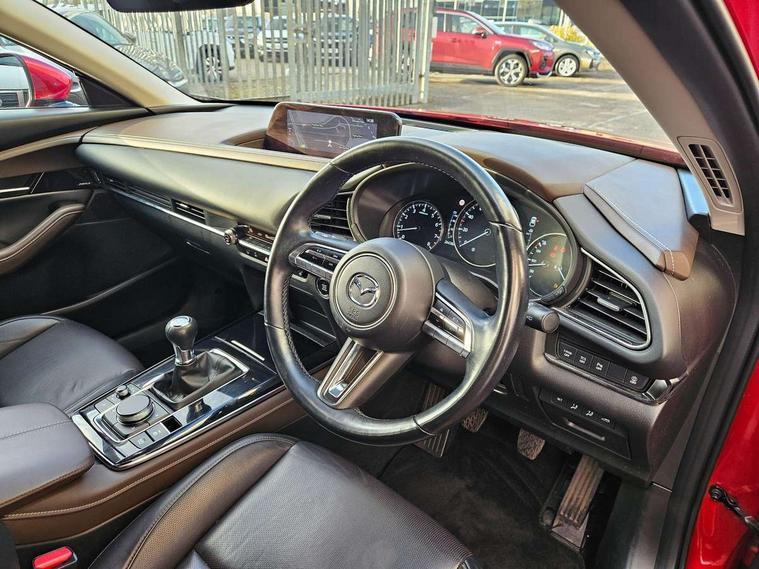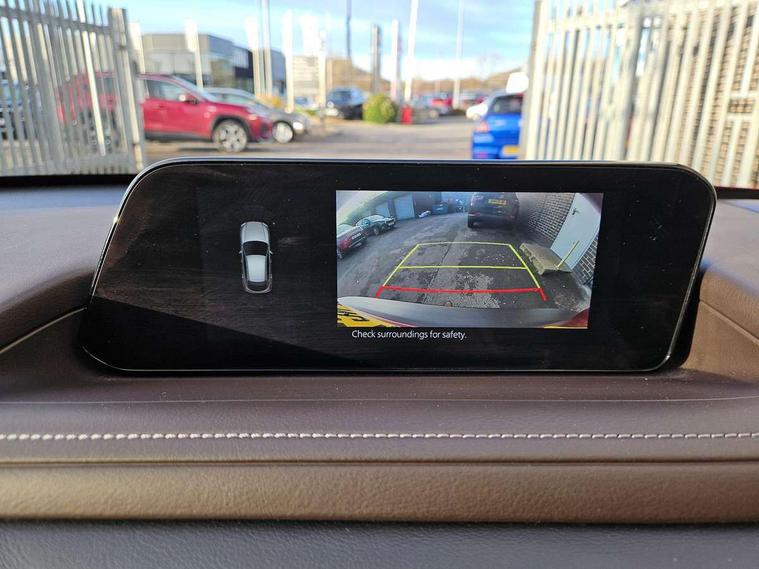 7" TFT Colour driver instrument panel display, 8.8" Colour centre touch screen display with Mazda Connect infotainment, Adaptive cruise control (Mazda radar cruise control), Apple car play/Android Auto, Blind spot monitoring with rear cross traffic alert, Driver attention alert system, E-call with GPS, Emergency stop signalling system, Engine start/stop button, Front and rear parking sensors, Integrated bluetooth, Integrated Mazda navigation system, Intelligent speed assist, Lane keep assist system (LAS) with Lane departure warning system (LDWS), Mazda connected services, PAS, Power lift gate, Reversing camera, Service indicator, Traffic sign recognition, Trip computer, Cylinder Deactivation, i-stop, 2 USB charging ports in front inner central armrest, AM/FM and DAB radio, Bose surround sound system with 12 Speaker, Bose center point, Bass match and audio pilot technology, Multimedia Commander including separate volume dial, Steering wheel mounted audio/bluetooth controls, Adaptive LED Headlights, Auto dimming driver's door mirror, Auto headlight levelling, B-pillar and C-pillar garnishes in piano black finish, Body coloured, electrically adjustable, heated auto power folding door mirrors with integrated indicators, Chrome finish signature wing in front grille, Coming/leaving home lighting function, Door mirrors with adjustable memory and tilt-down function when reversing, Dual chrome exhaust, Dusk sensing headlights, Electric front/rear windows with one touch auto up/down, Frameless auto dimming interior rear view mirror, Front kodo turn signal, Gloss black front grille, Gloss black rear roof spoiler, High beam assist, LED signature daytime running lights, Privacy glass (rear side windows and rear screen), Rain sensing front wipers with adjustable speed and intermittent wipe, Rear fog lights, Rear side wing doors, Rear wiper, Signature LED rear combination lights, Third brake light, 12V power outlet in centre console, 3 seat bench in 2nd row, 60/40 split fold down rear seats, Chrome horn pad ring, Chrome interior trim accents with steering wheel centre bezel, surround of engine start / stop button and glove box handle, Dashboard, door cards and front centre armrest in rich brown leather, Driver and front passenger visors with covered vanity mirror and driver ticket holder, Driver's seat power slide, recline, height, seat tilt and lumbar adjustment with head up display and driver door mirror memory, Driver, front passenger and two rear door storage, Driver, Front passenger and two rear grab handles with coathooks, Dual zone climate control air conditioning with rear air vents, Folding rear centre armrest with two cup holders, Front and rear (x3) head restraints, Front and rear LED lighting, Front armrest, Front centre storage with two cupholders with lid, Front passenger seatback pockets, Front passengers seat manual slide, recline and height adjustment, Gear shift indicator, Glovebox illumination, Heated front seats with 3 stage setting, Heated steering wheel, ISOFIX child seat anchorage points attached on outer rear seats, Leather upholstery with interior accents, Leather wrapped gear shift knob, Leather wrapped steering wheel with telescopic and tilt adjustment, LED luggage compartment lighting, Light roof headlining and pillars, Rear armrest inner material in cloth, Roof mounted sunglasses holder, Single front passenger seat, 3 point ELR front seat belts x2 with pretensioners, 3 point ELR rear seat belts, Anti-lock braking system (ABS), Drivers knee airbag, DSC - Dynamic Stability Control, Electronic parking brake with auto disengage function and auto hold function, Front and rear curtain airbags, Front dual stage driver and single stage front passenger airbags, Front passenger airbag cut-off switch, Front side airbags, Front smart city brake support, G-Vectoring control plus, Hill launch assist, Manual child lock in rear doors, Mild Hybrid system with regenerative braking, Seatbelt reminder for driver/front passenger and rear seats, Traction control system (TCS), Tyre pressure monitoring system (TPMS), Remote central locking with deadlocking and automatic door lock when driving, Smart keyless entry, Thatcham accredited alarm and immobiliser, Dark vinyl door panel inserts, 18" Silver alloy wheels, Emergency tyre repair kit,