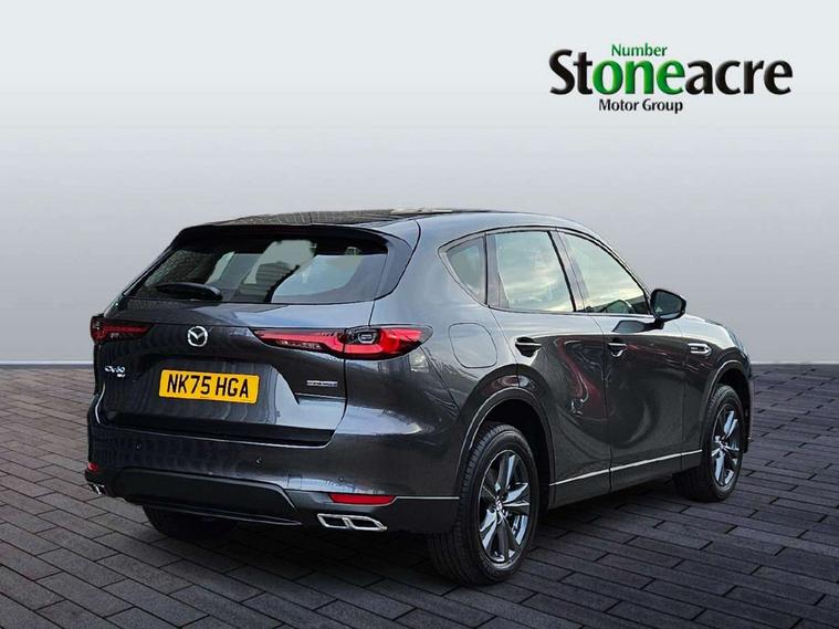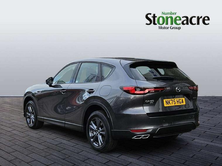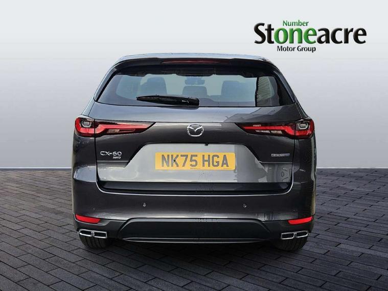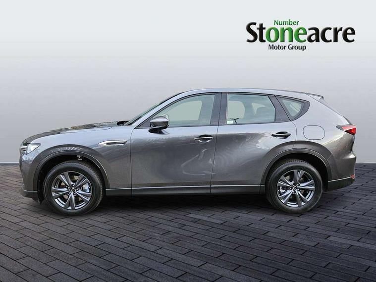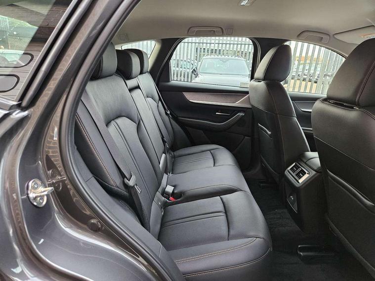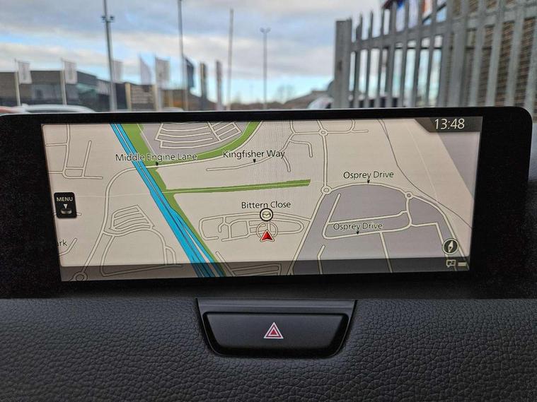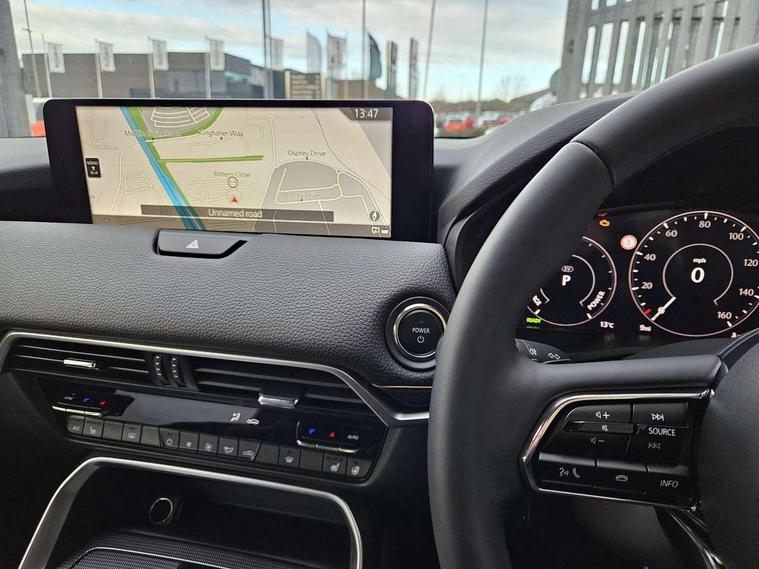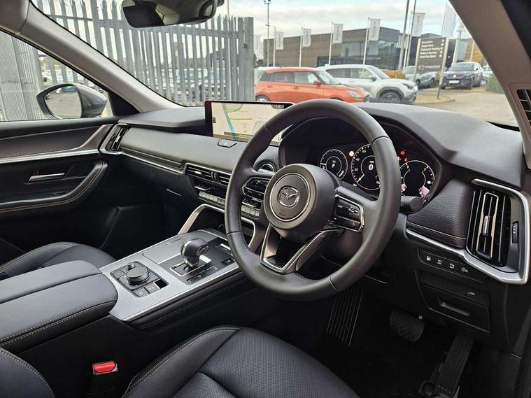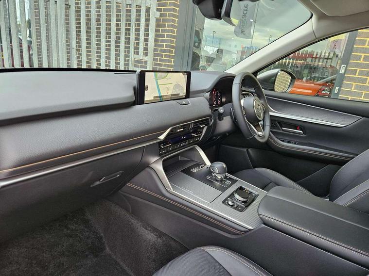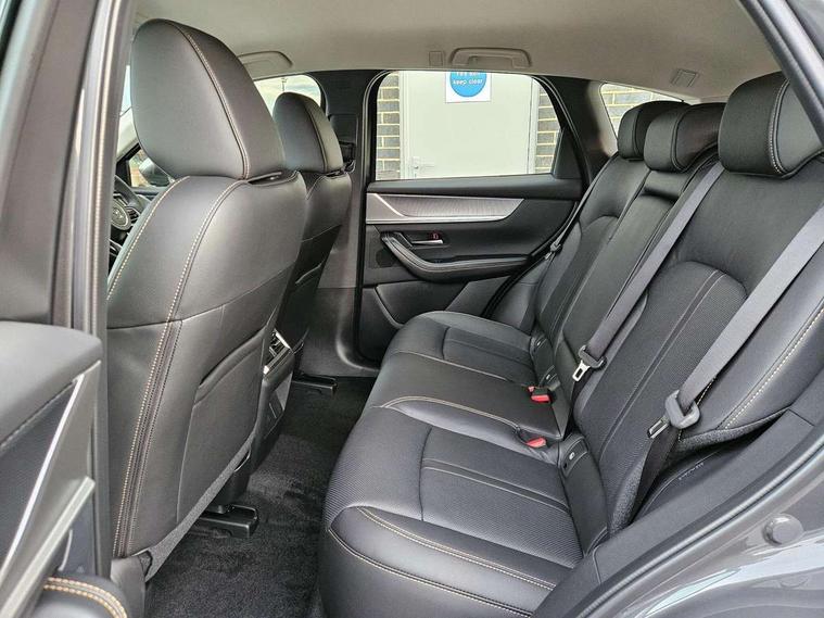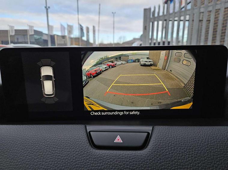 Emergency lane keeping with blind spot assist, Low washer fluid warning light, 12.3" Colour entertainment centre display with mazda connect infotainment, 12.3" TFT Colour display, Adjustable speed limiter, Blind spot assist, Blind spot monitoring with rear cross traffic alert, Cruise control, Distance alert system, Driver attention alert system, E-call with GPS, Emergency stop signalling system, Exit warning function, Front and rear parking sensors, Integrated bluetooth, Intelligent speed assist, Kinematic posture control, Lane keep assist system (LAS) with Lane departure warning system (LDWS), Mazda hybrid navigation system with european mapping, Multimedia Commander, PAS, Power lift gate with handsfree function, Power liftgate, Power start/stop button, Reversing camera with static guide lines, Speed alert, Traffic sign recognition enhanced with mandated excessive speed warning, Trip computer, Windscreen projected colour active driving display, Wireless apple car play/android Auto, Type 2 Mode 2 cable for AC charging via UK 3-pin plug, 7.2 kw On board Charger, Mi-Drive (Normal, Sport, Off-road, Towing and EV mode), Paddle shift, Type 2 Mode 3 cable for AC charging via home or public charge points, AM / FM / DAB radio with 8 speakers, Steering wheel mounted audio/bluetooth controls, USB-C inputs (x2 front and x2 rear), Auto dimming driver's door mirror, Automatic headlight levelling, B-pillar and C-pillar garnishes in gloss black finish, Body colour roof spoiler, Body coloured bumpers, Body coloured door mirrors, Chrome front side garish, Coming/leaving home lighting function, Dark plated headlight lense, Dusk sensing headlights, Electric front/rear windows with one touch auto up/down, Electrically adjustable, heated auto power folding door mirrors, Frameless auto dimming interior rear view mirror, Front kodo turn signal, Front wiper de-icer, Gloss black bar type front grille with bright finish signature wing, Headlight washers, High beam control, LED 3rd brake light, LED headlamps, LED rear signature combination lamps, Piano black window surrounds, Rain sensing front wipers with adjustable sensitivity and speed, Rear side wing doors, Rear wiper, Roof pillars and roof lining finished in lighter colour to soften the overall look, Satin black lower bumper, wheel arch and side mouldings, Signature LED daytime running lights, Silver decoration panel, 12v power outlet - front, 12V socket in boot, 3 height adjustable rear headrests, 3 seat bench in 2nd row, 40/20/40 split folding rear seats with quick levers in the boot, Cargo net, Chrome interior trim accents with steering wheel centre bezel, surround of engine start / stop button and glove box handle, Door panel trim vinyl leather with armrest, Driver and front passenger two rear grab handles with rear coat hooks, Driver and front passenger visors with covered vanity mirror and driver ticket holder, Driver seat manual slide, recline, height and seat tilt adjust, Driver, front passenger and two rear door pockets, Driver/passenger front seatback pockets, Dual zone climate control air conditioning with rear air vents, Featuring black vinyl leather dashboard trim with titanium coloured accents, Folding rear centre armrest with two cup holders, Front and rear signature illumination, Front centre storage with two cupholders, Front down lamp with front and rear foot lamps, Front headrests, Front passengers seat manual slide, recline and height adjustment, Glovebox illumination, Heated front seats with 3 stage setting, Heated leather wrapped steering wheel, ISOFIX child seat anchorage points attached on outer rear seats, Karakuri tonneau cover, Leather upholstery, Leather wrapped gear shift knob, LED illumination luggage compartment, Manual telescopic and tilt adjustment steering wheel, Practical and spacious front centre armrest storage, Rear seat recline function for rear passenger comfort, Remote fold down rear seats, Roof lining (ceiling and pillars) - Grey, Roof mounted sunglasses holder, Single front passenger seat, 3 point ELR front seat belts x2 with pretensioners, 3 point ELR rear seat belts, Active bonnet, Anti-lock braking system (ABS), Drivers knee airbag, DSC - Dynamic Stability Control, Electronic parking brake with auto disengage function and auto hold function, Front and rear curtain airbags, Front dual stage driver and single stage front passenger airbags, Front passenger airbag cut-off switch, Front side airbags, Front smart city brake support, Hill decent control, Hill launch assist, Manual rear child locks, Seatbelt reminder for driver/front passenger and rear seats, Traction control, Tyre pressure monitoring system (TPMS), Remote central locking with deadlocking and automatic door lock when driving, Smart keyless entry, Thatcham accredited alarm and immobiliser, Mesh metal film centre console panel, 18" Grey metallic alloy wheels, Emergency tyre repair kit,