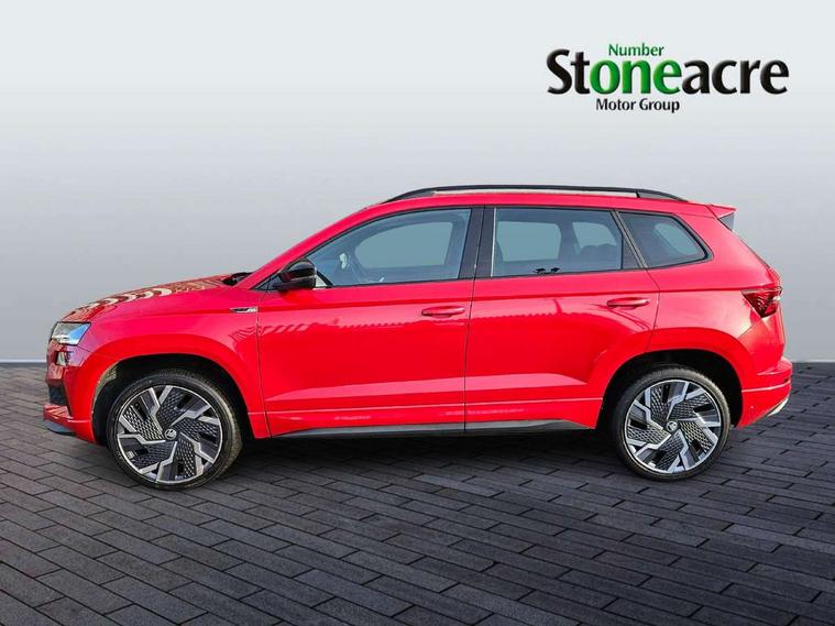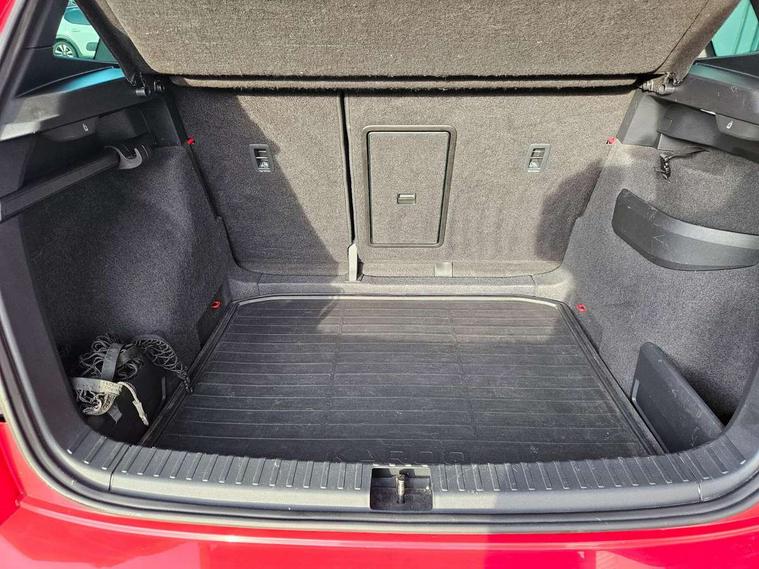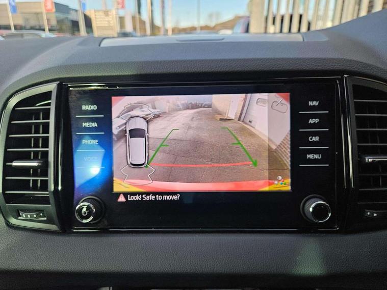 8" Digital display, Care connect, Driver fatigue sensor, Emergency services call system, Outside temperature gauge, Service interval indicator, SmartLink wireless for Apple and wired for Android, Start/stop system with regenerative braking, USB C Port x 2 in front centre console, Virtual pedal with electrically operated boot door, 8 Speakers, DAB radio with Bluetooth, USB connection, Acoustic glass, Aero front windscreen wipers with intermittent function, Auto dimming rear view mirror with light and rain sensors, Black door mirrors, Black electric window control buttons, Black radiator grille, Black roof rails, Body colour door handles, Dynamic headlight range control with cornering light function, Electric front and rear windows with child proof lock, Front door steps with SportLine logo, Heated rear windscreen, LED daytime running lights, LED rear lights with high functionality welcome effect and dynamic indicators, Light assistant (coming/leaving home/tunnel light), Panoramic sliding sunroof, Plastic scuff plates, Privacy glass, Protective door side sills in body colour, Rear diffuser, Rear side wing doors, Rear spoiler, Rear window wiper with washer system and intermittent control, Safety reflectors on front doors, Skoda lettering on tailgate in black, Sportline badge on front fender, Sportline decorative inserts with badging, Sports front and rear bumpers, 1.5 litre bottle holders in driver and front passenger door panels, 12V socket in boot, 12v socket in front centre armrest with storage compartment and rear air vents, 2 Folding hooks and nets in boot, 3 rear height adjustable headrests, 3 seat bench in 2nd row, 3 spoke leather sports multifunction steering wheel and silver stitching with gear shift paddles, 4 foldable roof handles with rear coat hooks, Black floor carpet, Black roof headlining, Chrome inner door handles, Double sided boot floor, Foldable hooks in the boot, Front head restraints, Height adjustable front three point seats belts with tensioners, Height/reach adjust steering wheel, Ice scraper, Illuminated glovebox, Illuminated luggage compartment, Isofix child seat preparation outer rear, Manual lumbar support for front seats, Pen holder, Pollen filter, Rear boot cover, Rear reading lights, Rear seats fixed folding and divided 60:40, Rubbish bin door, Safety vest holder, Single front passenger seat, Storage box in upper central dashboard closed, Sunvisors with illuminated vanity mirrors, Textile floor mats, Ticket holder, Titan black interior ceiling, Welcome animation with sportline logo, Light Pack - Karoq, Parking pack - Karoq, Automatic door unlocking in case of crash, Automatic fuel cut off in case of crash, Child locks on rear doors, Driver airbag, Electronic parking brake with auto hold function, Emergency rear braking signal, ESC including ABS, MSR, ASR, EDS, HBA, DSR, RBS, MKB and traction control, Front side airbags, Hill hold control, Knee airbags, Passenger airbag with switch-off function, Pedestrian monitor, Seatbelt reminder signalisation and pretensioner for all seats, Three point seatbelts rear, Two tone horn, Tyre pressure display, Tyre pressure monitor, Alarm with interior monitoring, back up horn and tilt sensor with safe function, Electronic engine immobiliser, Keyless entry and start/stop, Remote central locking with 2 remote folding keys, Black air vent surround, Black centre console, Satin black dashboard, Satin black door trim, 19" Sagitarius anthracite alloy wheels with matt black aero inserts, Anti-theft wheel bolts protection, Matt black aero hub caps, Storage on wheel cover, Tool kit,