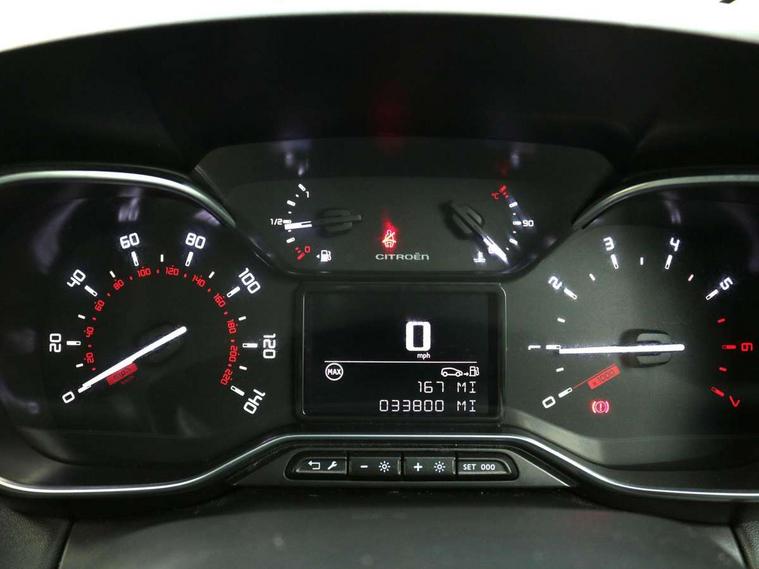 9" Touchscreen display, Citroen Connect Nav with 3D navigation, Coffee Break Alert, Cruise control with speed limiter, Driver instrument cluster including trip computer and rev counter with white text LCD display and white needles and chrome decor, eCall emergency call system, Lane departure warning system, Mirror screen with Apple CarPlay and Android auto, Outside temperature sensor, Tailgate, Traffic signs and speed limit recognition and recommendation, Variable assistance power steering, Voice recognition for radio, navigation and telephone features, Bluetooth hands free and media streaming with USB socket, Citroen connected DAB radio with 6 speakers, Steering wheel mounted controls for stereo and telephone, 3D effect LED rear lights, Automatic Eco LED headlights, Automatic lights and windscreen wipers, Black roof bars, Body colour painted door handles, Chrome chevrons front grille, Electric front windows + one touch + anti-pinch, Electric rear windows with one touch/anti-pinch, Electrically adjustable door mirrors, Electrically folding door mirrors, Fog lights integrated into front bumper, Front and rear body coloured bumpers, Heated door mirrors, Integrated roof spoiler, LED daytime running lights, LED third brake light, Painted door mirrors to match colour pack, Rear side wing doors, Rear wiper, Tinted rear windows and rear quarterpanel glass, Variable front intermittent wipers, 12V socket in rear of vehicle, 60/40 split folding rear seat, Automatic air conditioning, Boot light, Centre console with closed storage and chrome insert, Driver and front passenger cup holders, Driver and passenger sunvisor with courtesy mirror, Flex load/Pull out boot floor, Front and rear courtesy reading lights, Front and rear door storage, Front head restraints, Gloss black air vent surrounds and steering wheel insert, Glovebox with closable lid, Height adjustable driver's seat, Height and reach adjustable steering wheel, Manual handbrake with chrome insert, Passenger compartment headlight adjustment, Rear isofix mounting points (outside seats) with top tether, Row 2 - Three seats with individually adjustable head rests, Satin chrome interior door handles, Single front passenger seat, 3 point, height adjustable, pre tensioned front seatbelts, ABS with Electronic brakeforce distribution and Emergency braking assistance, Automatic illumination of hazard warning lights, Curtain airbags, Driver airbag, Drivers/passengers and rear seats unfastened seat belt warning, ESC (Electronic Stability Control), Front lateral airbags, Front passenger airbag, Front passenger airbag deactivation switch, Hill start assist function, Mono-tone horn, Rear door child safety locks, Three 3 point rear seatbelts, Tyre pressure monitor, Automatic door and boot locking when moving off with automatic unlocking in case of impact, Automatic locking of the vehicle (after 30 seconds if door or boot unopened), Immobiliser, Perimetric and volumetric anti theft alarm, Remote central locking + deadlocks, Vehicle locater function (headlights illuminate when button on key pressed), Compressor with puncture repair kit,