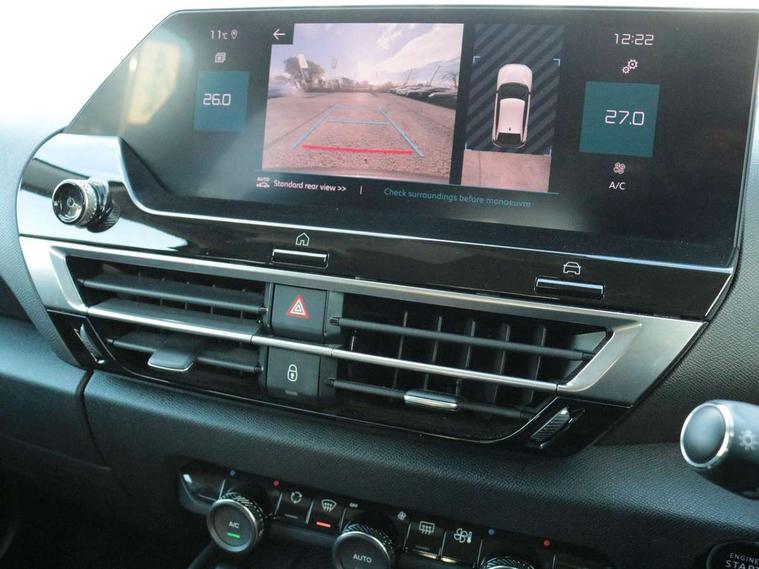 10" high resolution touchscreen user interface, controlling media, connectivity and vehicle settings, 5.5 inch backlit full TFT driver's instrument cluster with LED ambient lighting, Active blind spot detection, Apple car play and Android auto, Citroen connect box emergency and assistance system, Citroen connect nav with danger zone and speed camera alerts, Cruise control + speed limiter, Driver's head-up display, Electronic Power Steering (EPS), Front, rear and lateral parking sensors, In-crash braking, Voice commands, Suspension with progressive hydraulic cushions - double hydraulic stops on front suspension and single on rear suspension, Auxiliary input socket, Bluetooth telephone and audio streaming, DAB Digital radio, 3rd brake light, Body colour bumpers, Body colour door handles, Dark tinted rear windows and side windows with chrome detail, Electrically heated, folding and adjustable external rear view mirrors with courtesy lighting, Electrochrome interior rear-view mirror with automatic day-night switching, Front and rear electric windows, Gloss black rear skirt, Intelligent beam headlights, LED daytime running lights in V signature, LED front fog lamps with static cornering function, LED front headlamps, Perla Nera black painted external rear view mirrors, Rain sensing automatic front windscreen wipers, Rear side wing doors, Rear wiper, Welcome and goodbye lighting, 12V power outlet, 1x USB Type-C socket charging & data connection and 1x USB Type-A socket in 1st row and 1x USB Type-A socket charging in 2nd row, 3 individual rear seats, 3 rear headrests, Boot light, Dashboard tray in front cabin, Deluxe leather steering wheel with two command blocks, Driver and passenger sunvisors with illuminated vanity mirrors, Dual zone automatic air conditioning, Front and rear LED interior lighting, Front head restraints, Height adjustable front passenger seat, Height and reach adjustable steering wheel, Map pockets in rear of front seats, Raised centre console with armrest and two cup holders, Single front passenger seat, Split folding rear seats, Two position boot floor, High level acoustic insulation pack - C4, Safety pack plus - C4 Shine/ Shine Plus, 3x3 point rear seatbelts, ABS, Driver and front passenger airbags, Electric parking brake, ESP, Front seatbelt pretensioners, Hill start assist, Manual child lock in second row, Manual deactivation of front passenger airbag, Post collision safety brake, Row 1 and 2 curtain airbags, Row 1 side thorax airbags, Seatbelt unfastened on the move warning, Tyre underinflation detection, Anti-theft alarm (volumetric protection), Immobiliser, Keyless entry and start, Remote locking with deadlocks, 18" Bi-tone diamond-cut aeroblade alloy wheels with anti-theft locking wheel nuts, Puncture repair kit with compressor,