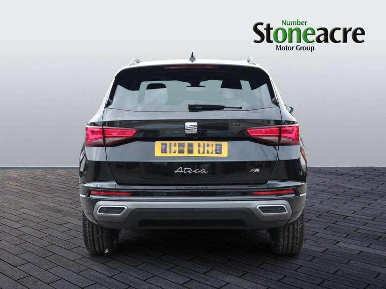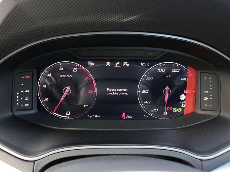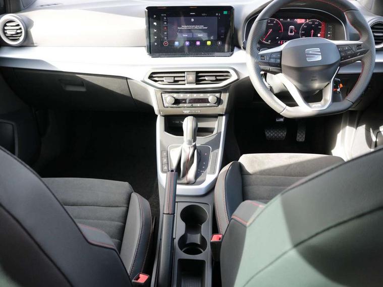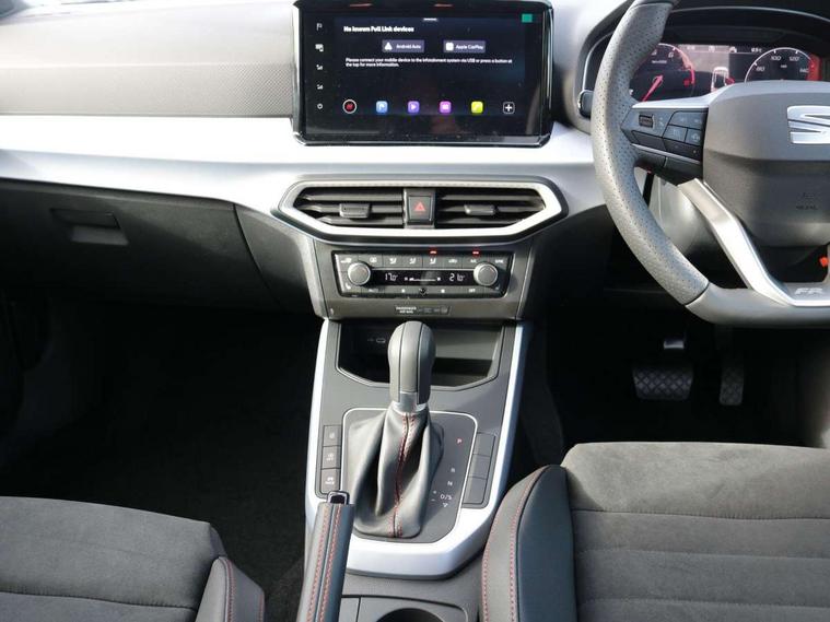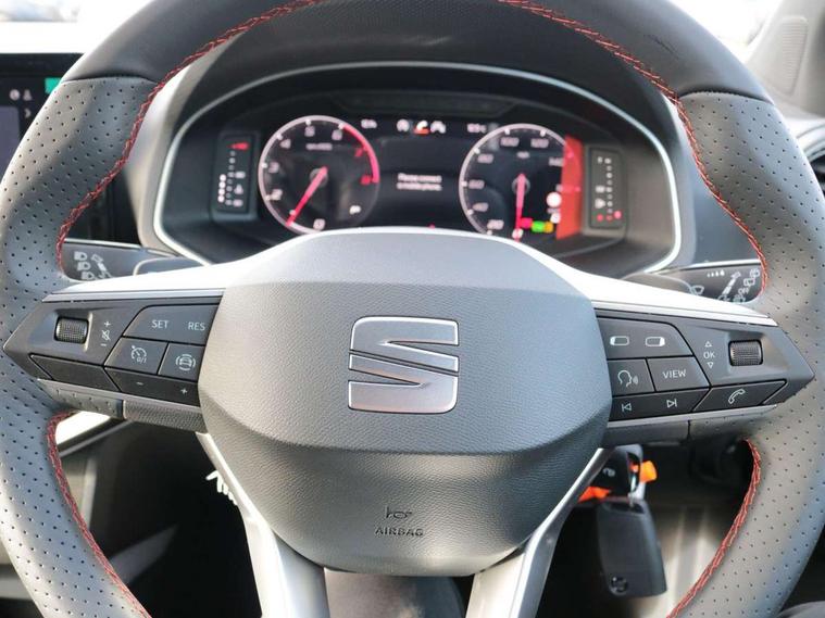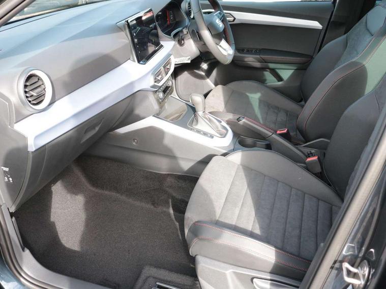'Lights On' Reminder warning buzzer, 10" Digital cockpit, Digital clock, E-call, Electric speed sensitive power steering, Full link smartphone integration with mirror link, wireless apple carplay, Google android auto + USB Type C cable for apple and android devices, Lane keeping system, Low fuel warning light, Outside temperature display, RPM counter, SEAT Drive profile - Four different models normal-sport-eco-individual, steering response, throttle response and gear shifts mode, Trip computer, Wireless phone charger, 9.2" colour touchscreen with navigation system, voice control and USB port (type c), Bluetooth interface for hands free and audio streaming, DAB digital radio and AM/FM radio, Steering wheel mounted audio controls, Anti theft roof antenna, Auto dimming interior rear view mirror, Automatic activation of hazard warning lights, Body coloured bumpers, Body coloured door handle inserts, Chrome roof rails and window surrounds, Dark tinted rear windows, Electric front/rear windows, Electrically adjustable, heated and folding door mirrors, Front fog lights with cornering function and rear fog light, FULL LED automatic headlights with dynamic headlight range control, coming and leaving home, LED daytime running lights, LED rear tail lights and licence plate lights, Protective side mouldings, Rain sensing wipers, Rear side wing doors, Rear spoiler, Rear window wash/wipe, Roof colour door mirrors, Third brake light, Twin exhaust pipe styling hidden exhaust pipe, Visible VIN plate, 2 cupholders, 3 seat bench in 2nd row, 60/40 split folding rear seat, Aircare filter, Black interior roof, Double boot floor, Driver sunvisor with covered mirror + card holder, Dual zone climate control, Front comfort seats, Front courtesy light with front reading lights, Front seat back storage pockets, Gear shift indicator, Heated front seats, Height adjustable front seats, Height/reach adjustable steering column, Illuminated air vent surrounds, Illuminated boot, Instrument lighting with brightness control, Interior ambient lighting, Interior light in footwell, central console and door panel, ISOFIX points in outer rear seats with top tether anchorage points, Microsuede cloth upholstery, Passenger sunvisor with vanity mirror, Perforated flat bottomed leather steering wheel/gear knob/handbrake with red stitching and FR logo, Potentiometer, Single front passenger seat, Steering wheel mounted gearshift paddles, Two front and three rear height adjustable headrests, Interior chrome pack - Arona, Safe and driving pack (S) - Arona, 3 point seatbelts on all rear seats, ABS, Active front headrests, Child locks on rear doors, Driver and front passenger airbags with front passenger airbag de activation, front side and curtain airbags, Emergency Brake Assist (EBA) and front assist, Front and rear seatbelt reminder, Hill hold control, Multi-Collision braking, Tiredness recognition system, Traction control, Tyre pressure monitoring system, Alarm with back up horn with tow away protection, Deadlock, Electronic engine immobiliser, Locking wheel bolts, Remote central locking, Titan black dashboard, 18" Performance Cosmo grey matt alloy wheels,