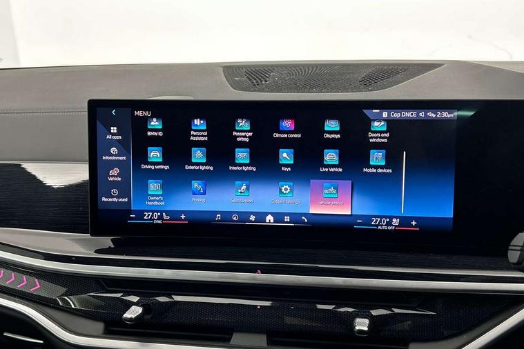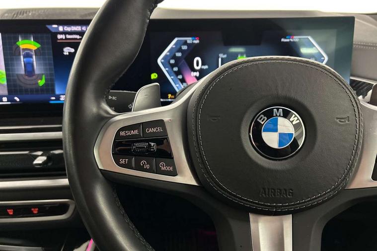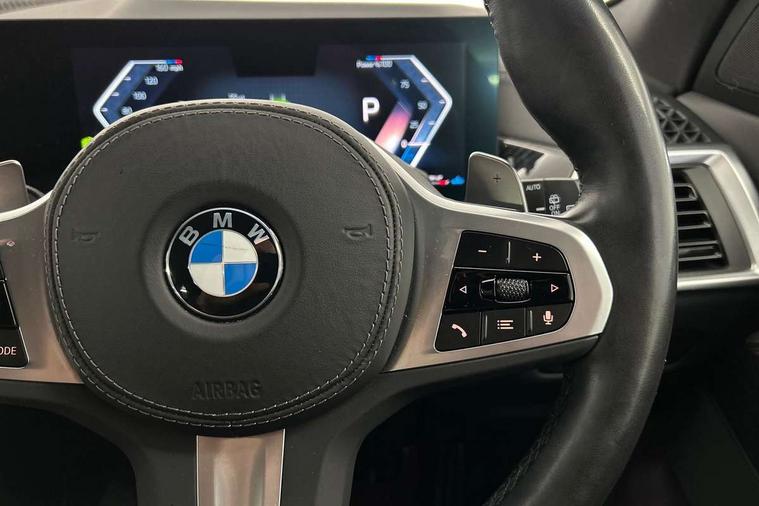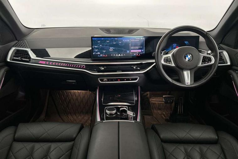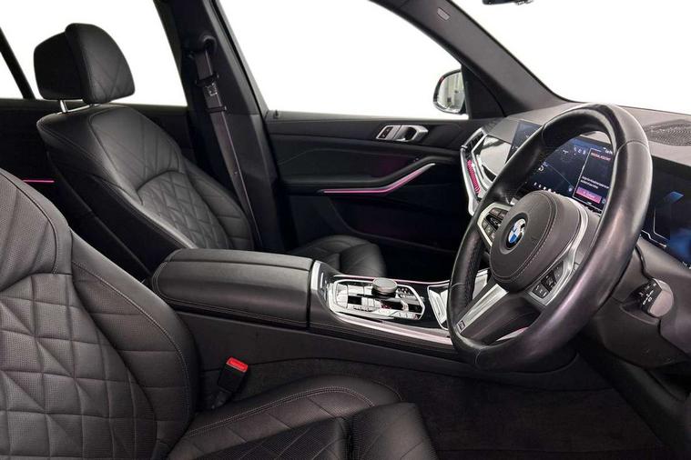 Attentiveness assist, Automatic tailgate operation, BMW ConnectedDrive online services, BMW live cockpit + with curved 12.3 instrument cluster/14.9 central display, nav/Tuner with diversity reception, RDS/4GLTE/remote software upgrade, BMW Recovery system, BMW Teleservices, Condition based service, Cruise control with brake assist, eCall emergency call system, Enhanced bluetooth with wireless charging, Integrated owner's handbook, PAS, Speed limiter, Wi-Fi hotspot, Drive performance control with ECO PRO comfort + sport mode, Eight speed steptronic sport automatic transmission and gearshift paddles on the steering wheel, Hi-Fi loudspeaker system, Adaptive LED Headlights, Front and rear electric windows, High beam assistant, High gloss black shadow line roof rails, LED daytime running lights, Rear side wing doors, Third brake light in rear spoiler, Variable intermittent rear wash/wipe, 12V - Power sockets with 2x centre console and 1x luggage compartment, 3 seat bench in 2nd row, Foldable rear centre armrest with 2 cupholders and storage compartment, Front and rear side armrest integrated into door trim, Headrests for all seats, Luggage compartment separating net, Single front passenger seat, Three spoke sport M leather steering wheel, Velour floormats, Ambient light interior pack - X5, Driving assistant pack with radar based driver assistance system - X5, Expanded exterior mirror pack - X5/X5 M, M aerodynamics pack - X5, 3 rear seatbelts, Active protection, Airbags - driver/front passenger, rear and side, first and second row seats head airbags, front passenger seat airbag deactivation + knee airbag, Anti-lock braking system (ABS), Automatic Stability Control (ASC), Brake energy regeneration, Cornering brake control (CBC), Crash sensor activating central locking release, hazard warning lights, fuel cut off, interior lighting + activation of safety battery terminal clamp, DSC - Dynamic Stability Control, Dynamic Traction Control - DTC, Electromechanical parking brake with automatic drive away release and auto hold function, Electronic brake force distribution, Hill start assistant, M Sport blue painted brake calipers with 'M' designation, Mechanical child proof lock on rear doors, Tyre pressure monitoring system, Tyre pressure sensors, Ventilated front and rear disc brakes, Warning triangle and first aid kit, Closing system with central locking, Comfort access system, Locking wheel bolts, Sensatec instrument panel,