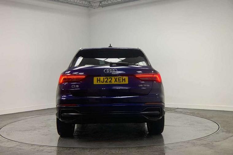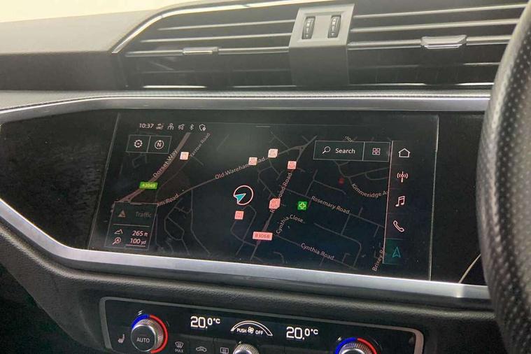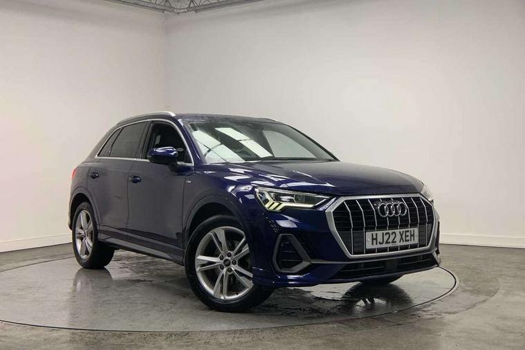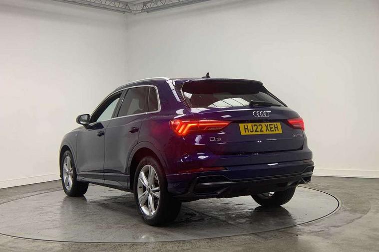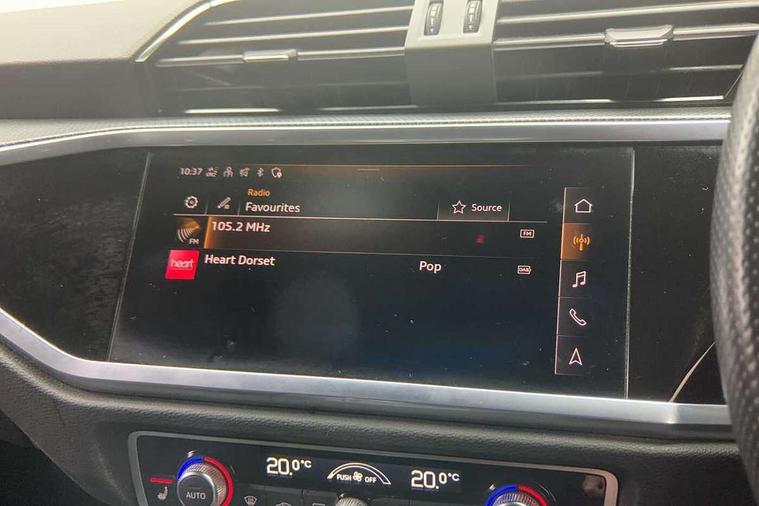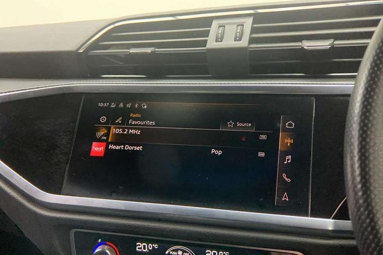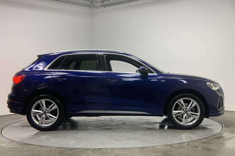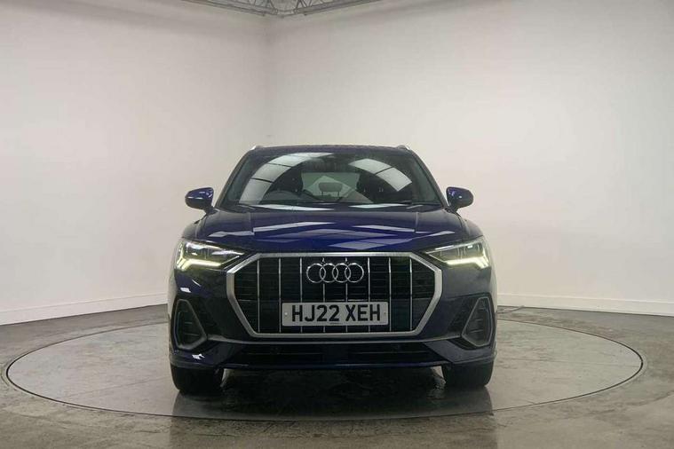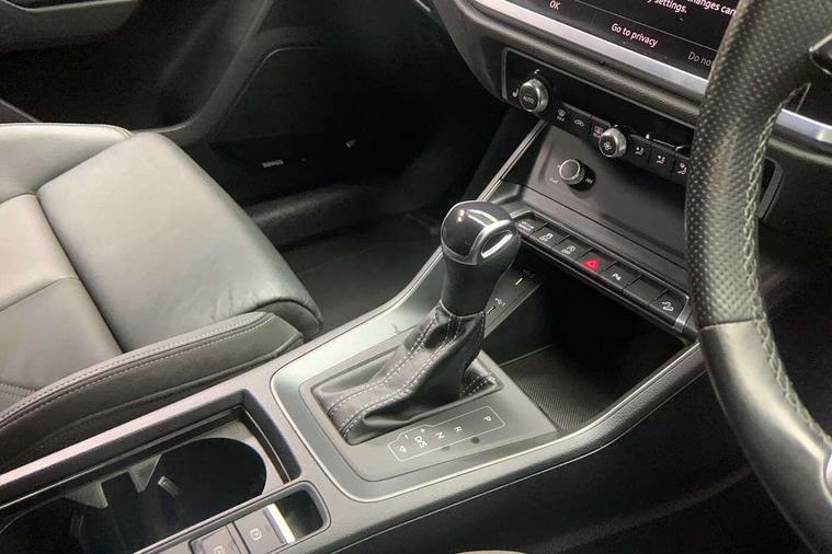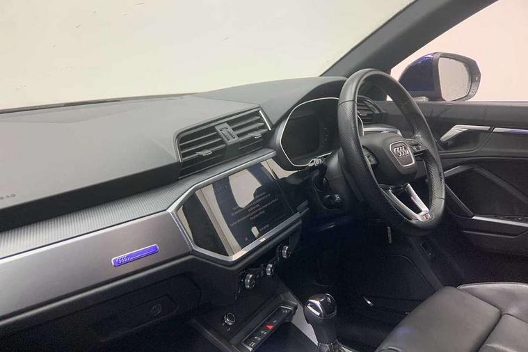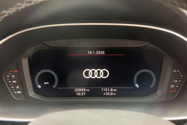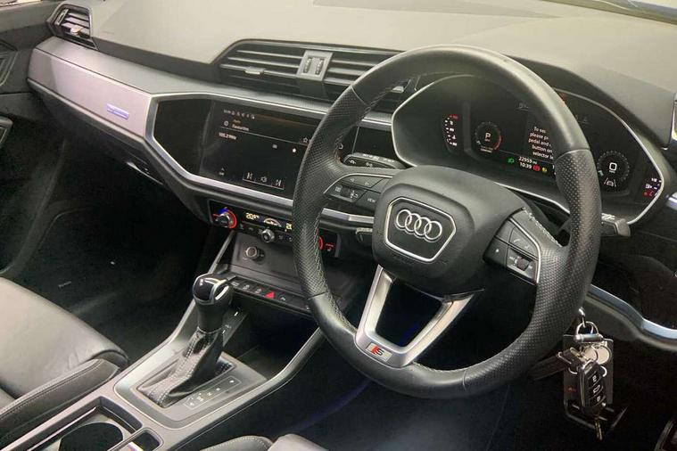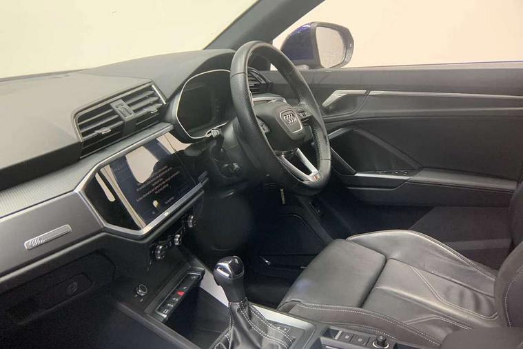 Amazon alexa Integration, Audi connect safety and service (e-call), Audi drive select, Audi lane departure warning, Audi Virtual Cockpit - 10.25" display, Bluetooth interface, Camera based traffic sign recognition, MMI Navigation Plus with high resolution 10.1 inch touchscreen colour display, Power operated tailgate, Progressive steering, Service interval indicator, Smartphone interface includes wireless Apple carplay/Android Auto, Start stop system with recuperation, Voice control system with natural language interaction, 48V Mild hybrid technology, Sports suspension, 2 USB-C ports with charge and data functions, 6 passive loudspeakers, DAB digital radio module, Acoustic windscreen, Aluminium roof rails, Aluminium window trim, Auto dimming frameless rear view mirror, Body coloured bumpers, Electrically folding, adjustable and heated door mirrors with integrated LED side indicators and kerb view function for passenger side, Front and rear electric windows, Front fog lights, Front side air inlets in matt platinum grey, Front spoiler blade in matt platinum grey, Grille vertical bars in aluminium silver/Matt, High gloss black finish B and C pillars, LED headlights with LED daytime running lights, LED rear lights, LED third brake light, Privacy glass dark tinted rear and rear-side windows (from B-pillar backwards), Rain and light sensors, Rear diffuser strip in matt titanium black, Rear side wing doors, Rear wiper, S line badges on front wings, S Line front and rear bumpers, Side skirt insert in matt Platinium grey, Silver chrome grille surround, Titanium black radiator grille, Variable front intermittent wipers, 12V socket in rear centre console, 3 seat bench in 2nd row, 40:20:40 folding with manual adjustment for 60:40 forwards/backwards position and backrest angle, Adjustable rear seat bench/backrest with centre armrest and cupholder, Black cloth headlining, Dual zone electronic climate control, Front and rear black floor mats with contrast stitching in rock grey, Front and rear headrests, Front and rear roof module including reading lights, Front centre armrest, Glove compartment lighting, Height and reach adjustable steering wheel, Illuminated door sill trims with S logo, ISOFIX child seat mounting for front passenger with airbag deactivation and outer rear seat including top tether attachment point for outer rear seats, Luggage compartment light, Manual front seats with height adjustment, Perforated leather gearknob, Single front passenger seat, Stainless steel luggage compartment sill finisher, Stainless steel pedals, Non smoking pack - Q3, 3x3 point rear seatbelts, 6 airbags - Driver, front passenger, curtain and side windows, Audi pre-sense front with pedestrain and cyclist recognition, Electromechanical parking brake, Electronic stabilisation control including ABS, ASR and EDL, Front seatbelt reminder, Hill descent control, Hill hold assist, Manual child lock in rear doors, Pre sense basic, Seatbelt monitoring, Tyre pressure warning, Warning triangle and first aid kit, Anti theft alarm, Anti theft wheel bolts, Immobiliser, Remote central locking, Dark matt brushed aluminium inlay, Detail dashboard around MMI touch colour display in glass look, black with surround in aluminium look, Leatherette door armrest, Tool kit, Tyre repair kit,