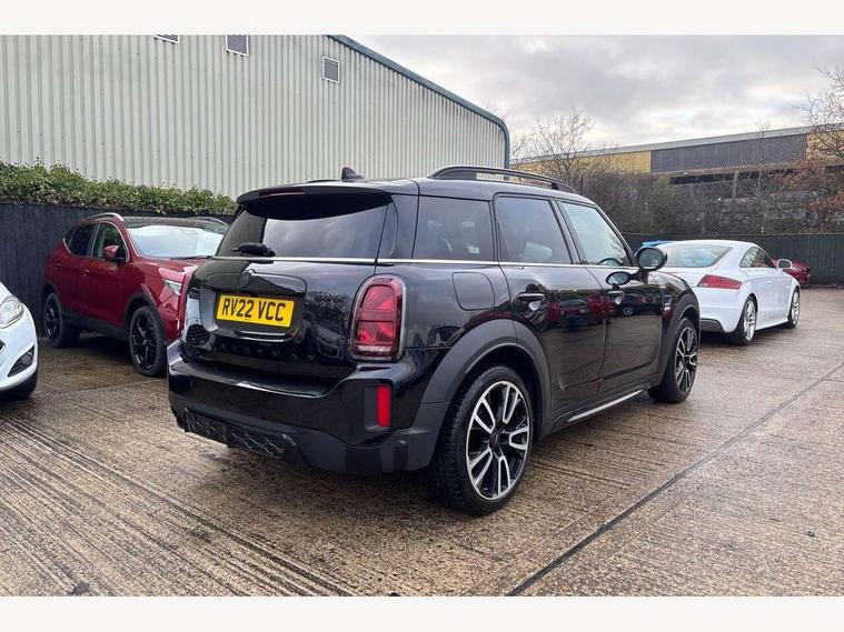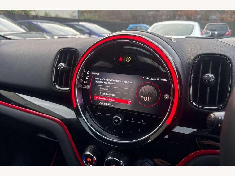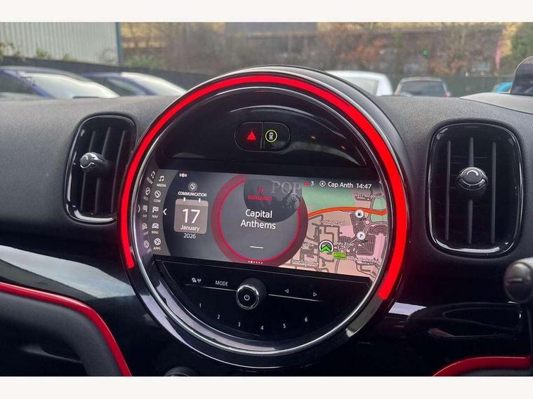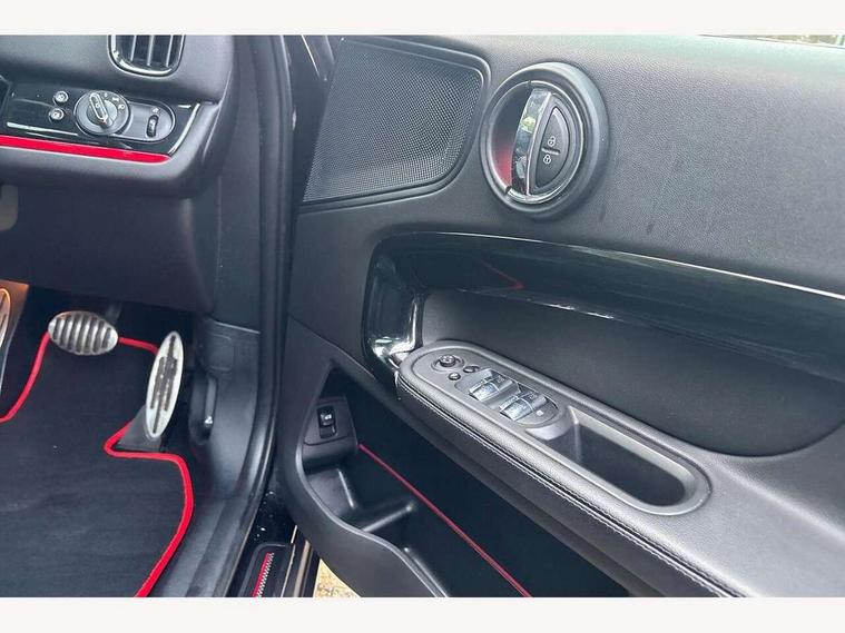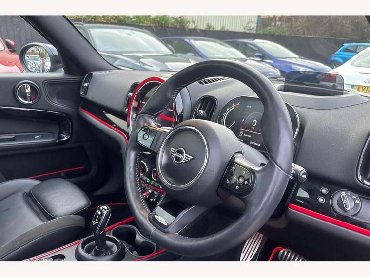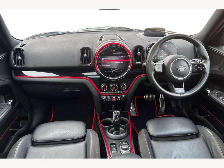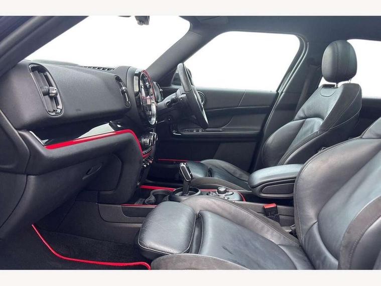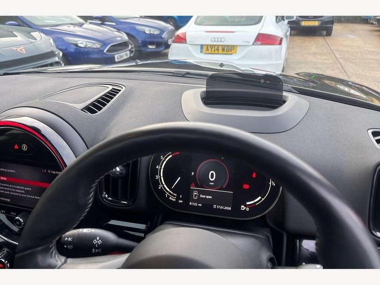 Active Guard incl speed limiting and lane departure functions with auto steering, and front collision warning with brake intervention, Automatic start/stop function with brake energy recuperation, Compatible mobile phone bluetooth with audio streaming, Cruise control with brake assist, Electro-mechanical speed dependant steering assistance, Instrument cluster, MINI Driving Modes - centre toggle switch to control driving setting (sport, mid and green), Mini E-call, On board computer, Rear parking distance control, 51 Litre fuel tank, Double Vanos system, Fully variable valve control, High precision injection, Performance Control, Steptronic transmission with double clutch, FM tuner and DAB digital radio, 3rd brake light, Body colour fuel filler cap, Day time driving lights, Door sill strips, Dynamic brake lights, Electric windows, Heated rear window, Heated windscreen washer jets, John Cooper Works - aerodynamic kit (front and rear apron, spoiler), front and rear sport bumpers and part-painted side sills with door sill finishers, John Cooper Works Logo, LED fog lights, LED Headlights, Model logo, Model logo on Tailgate, Rain sensor with auto headlights, Rear fog lights, Rear side wing doors, Rear window wiper, Side scuttle panel with integrated indicator, Split rear doors, Sun/heat protection glass, White indicator lenses, 12V socket in centre console, 3 seat bench in 2nd row, 360L luggage compartment capacity, 4 lashing eyes in luggage compartment, 40:20:40 split folding rear seats, Anthracite headlining with grab handles and clothes hooks, Chrome interior highlights, Colour line - Carbon black, Cupholders, English handbook, Floor mats, Front headrests, Glove compartment, Height and length steering column adjustment, Interior lighting with 12 basic colours selectable via toggle switch in roof, Isofix rear child seat preparation, LED reading lights, vanity mirror lights, front foot well light and spotlight on front seats, Manual air conditioning, Mini John Cooper Works leather gearshift lever and handbrake gaiters, Multifunction steering wheel, Nappa leather steering wheel with MINI Yours logo, Rear headrests, Single front passenger seat, Stainless steel pedals and foot rest, Storage compartments in doors, Sunvisors with vanity mirrors, Excitement pack - Countryman, Navigation pack - Countryman, Piano black exterior pack - Countryman, 2 tone horn, 3 point seatbelts on all seats, 6 Airbags - front, side, head and seat belt tensioners, Anti-lock braking system (ABS), DSC - Dynamic Stability Control, Electronic handbrake, Front and rear disc brakes, Hill start assist, Manual rear child locks, Tyre pressure monitoring system, Alarm system with tilt sensor, monitoring doors, bonnet interior and tailgate, Auto drive away locking, Deadlocking function, Electronic vehicle immobiliser, Locking wheel bolts, Start/stop toggle with keyless go, Piano black JCW interior trim, Tool kit,