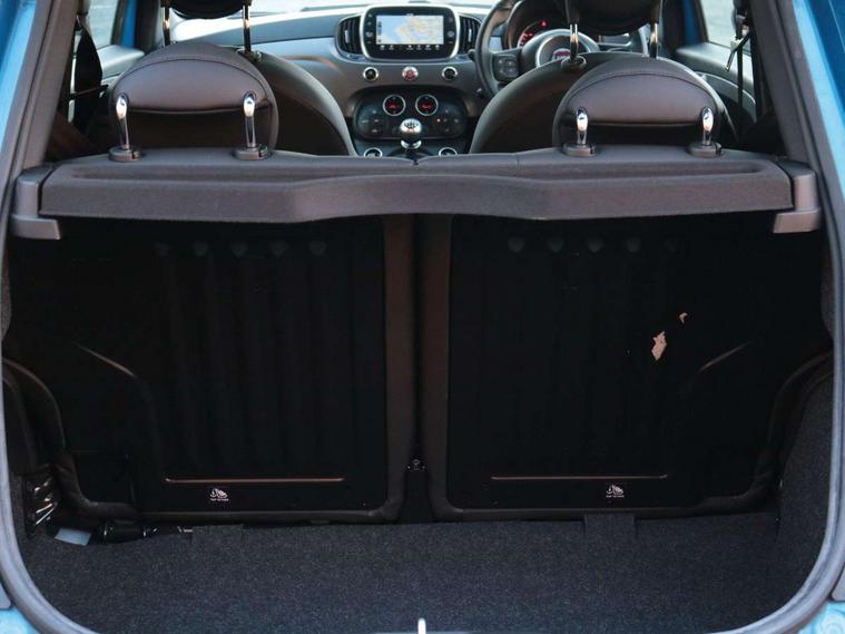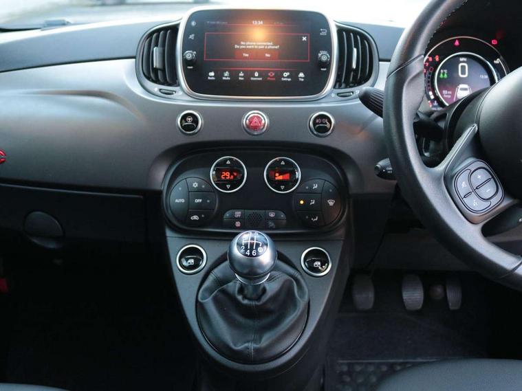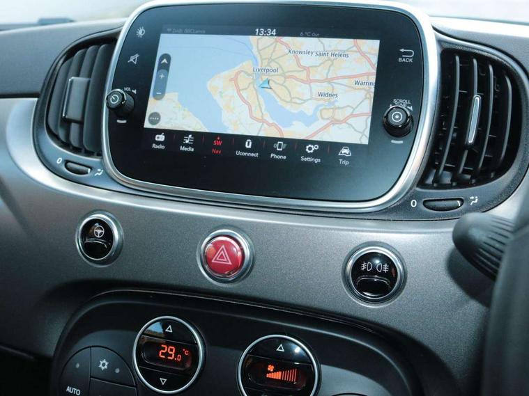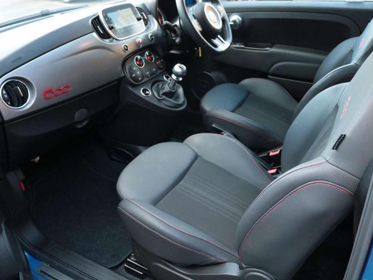 Grey dashboard trim, Sports kit Pack - 500, Automatic door locking, Immobiliser, Locking fuel filler cap, Remote central locking, 4 speakers, Rear speakers, 7 airbags - Driver, passenger, side, window and drivers knee airbags, ABS/EBD, Curtain airbags, ESC + ASR/MSR + HBA + Hill holder, Passenger airbag deactivation system, Traction control, Tyre pressure monitoring system, Body colour sports bumpers, Chrome exhaust finish, Electric front windows, Electrically adjustable satin graphite door mirrors with defrosting / external temperature sensor, Front fog lights, Heat insulated glass, Heated rear windows with wash wipe, LED daytime running lights, Satin Graphite exterior trim, 1 passenger grab handle, 50/50 split folding rear seats with height adjustable rear headrests, Auxilliary 12V power socket, Cloth upholstery, Front headrests, Height adjustable drivers seat, Height adjustable steering wheel, Isofix child seat preparation, Radio unit bezel in black, Sports seats, Techno leather steering wheel with audio controls, Apple car play/Android Auto, Cruise control, External temperature gauge, Power assist steering, Rear parking sensor, Speed limiter, Stop/start system, Trip computer,