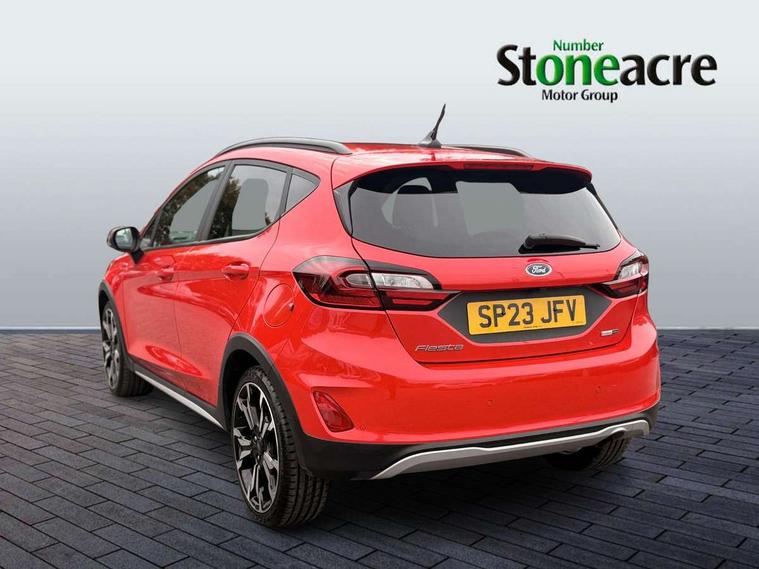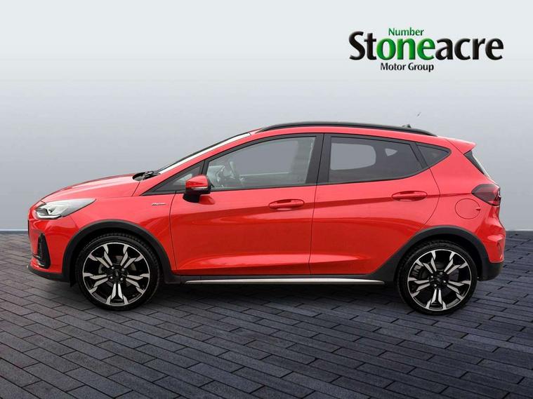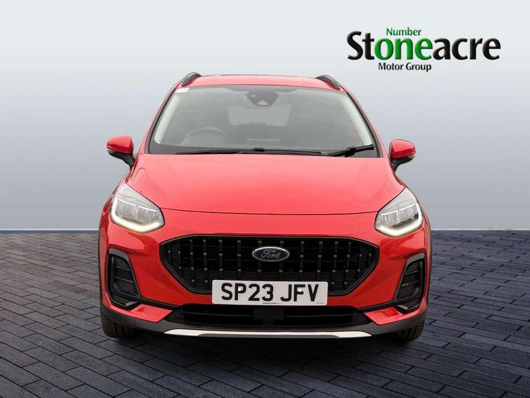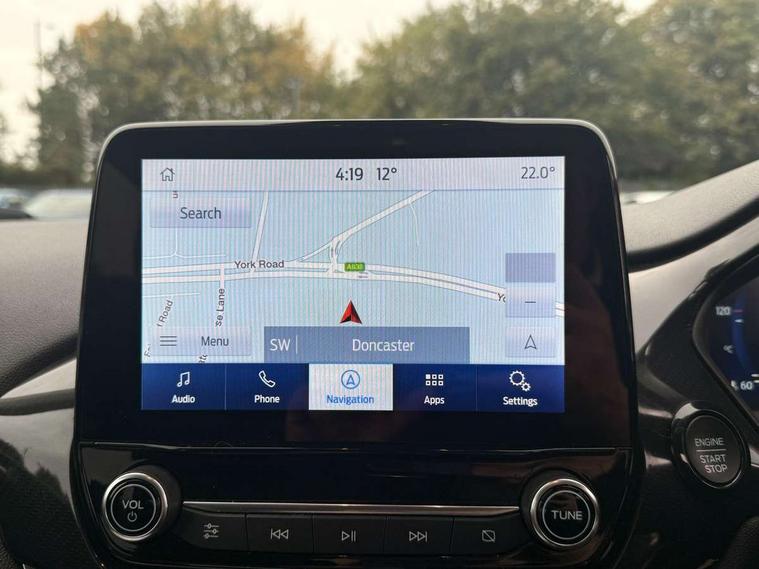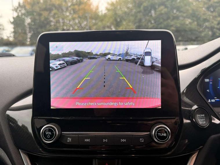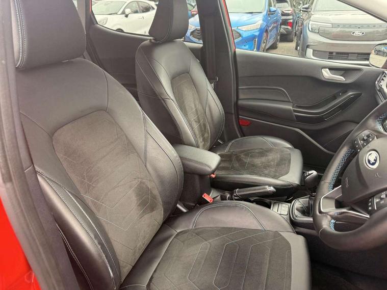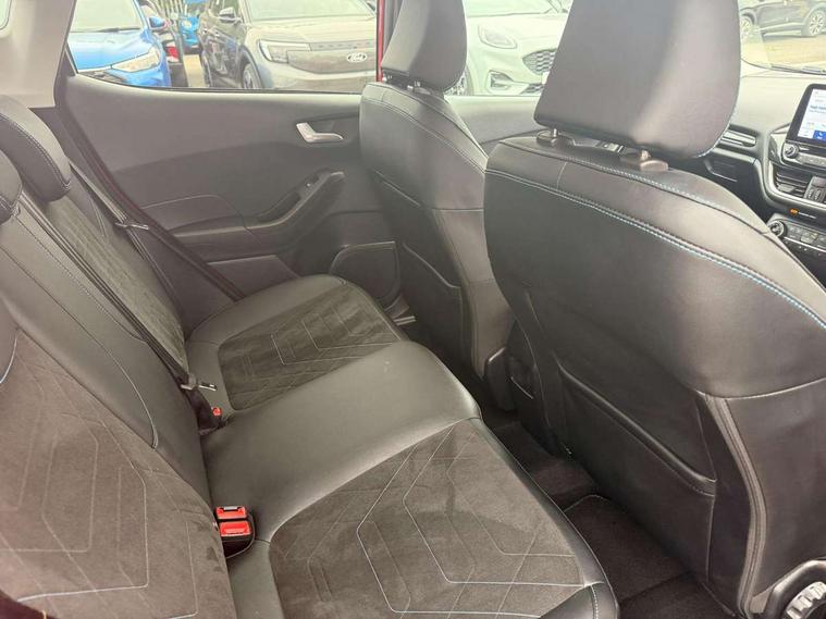 4.2" TFT instrument cluster screen, Bluetooth system, Electric power steering, Extra selectable drive modes ( Trail, Slippery), Ford easy fuel, Rear parking distance sensors, Selectable drive modes (Normal, Sport, Track), Traffic sign recognition, Trip computer, Rough road suspension with increased ride height adjust, 2 USB ports, Auxiliary input socket, B&O Premium audio system with 8" touchscreen, 10 speakers, 360 degree sound system, Ford SYNC 3 navigation system and Ford pass connect, DAB Digital radio, Steering wheel mounted controls, Auto high beam, Body colour bumpers, Body colour door handles, Body colour rear spoiler, Chrome beltline trim, Cornering front fog lights, Electric front windows/one touch facility, Electric rear windows, LED Night signature to rear lights, Mesh design front grille with chrome surround, Power foldable door mirrors with puddle lights, Quickclear heated windscreen, Rain sensing wipers and auto dimming rear view mirror, Rear privacy glass, Rear wiper, Rugged body styling kit with active front wing badges, 3 spoke leather trimmed steering wheel with audio control, 60/40 split folding rear seat, Adjustable head restraints, Boot carpet, Centre console with opening armrest, 2x cupholders, 12v and USB, Chrome inner door handles, Drivers and Passenger lumbar support, EATC - Electronic Auto Temperature control, Footwell illumination, Front floor mats in velour, Front map reading lights, Front seat and rear pockets, Height adjustable passenger seat, Illuminated glovebox, Leather gaiter, LED ambient lighting, Load area light, Manual 4-way driver seat adjust, Overhead console with sunglasses holder, Pollen filter, Rake/reach adjustable steering wheel, Sensico partial premium upholstery, Sensico wrapped steering wheel, NCAP Pack - Fiesta, 3 point seatbelts on all rear seats, ABS+EBA, Curtain airbags, Driver and passenger airbags, Drivers knee airbag, Electronic stability control with hill start assist, Front passenger airbag deactivation, Front side airbags, Seatbelt warning, Two tone horn, Tyre pressure monitoring system, Ford keyfree system with Keyless entry and keyless start, MyKey system, Remote central locking & engine immobiliser, Thatcham Cat.1 alarm, 18" 5 spoke alloy wheels with shadow black machined finish,